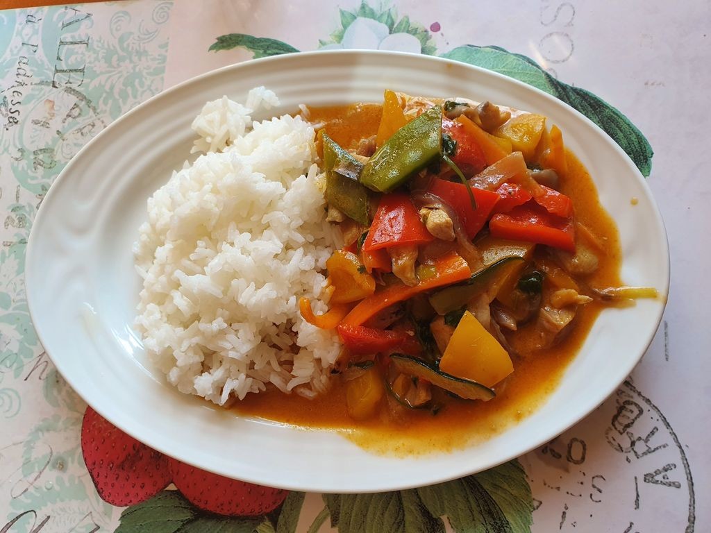 Na odlehčení – začali jsme před několika týdny chodit s Irenou na výborná vietnamská jídla, hodně zeleniny, skvělá chuť a vůně, usměvavá obsluha, tichá vietnamská hudba a kdo nevládne jíst klacíky, může si bez ztráty desítky vzít i normální příbor. Jenomže, teď je zavřeno a mírná závislost na této kuchyni mne přinutila se postavit k plotně. Výsledek snažení – červené curry s kokosovým mlékem, kuřecím masem a spousta zeleniny s rýží je níže.