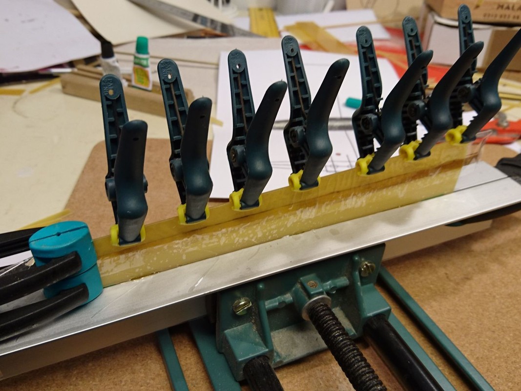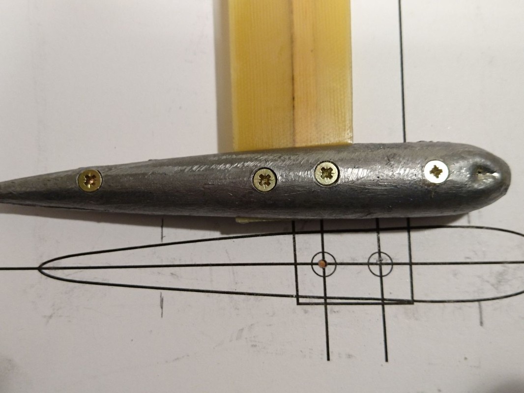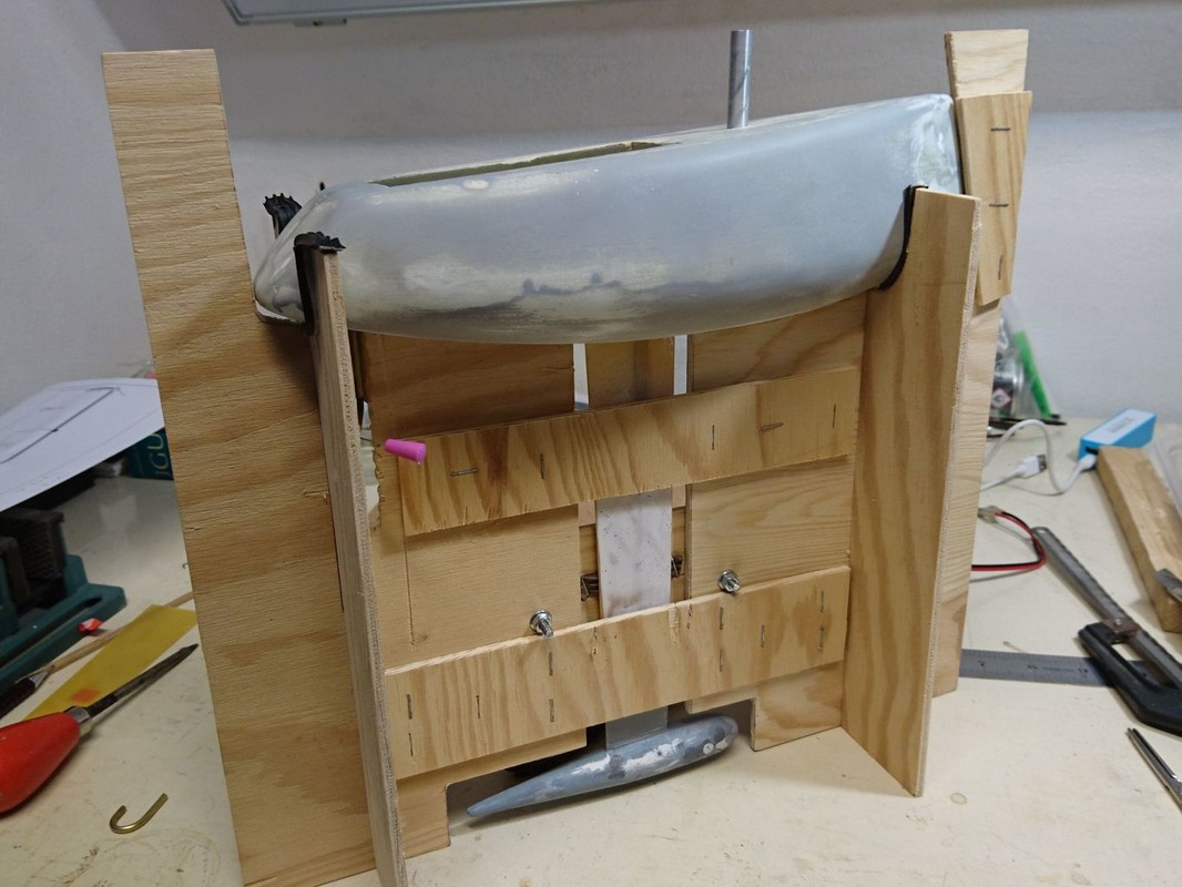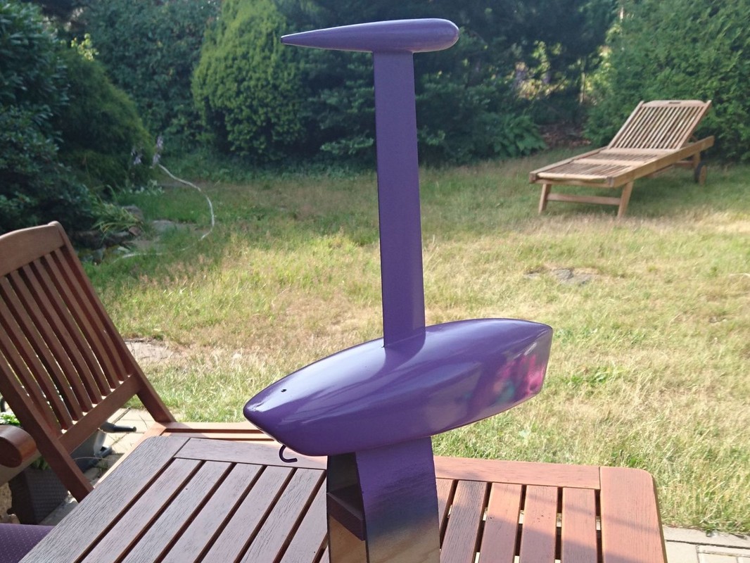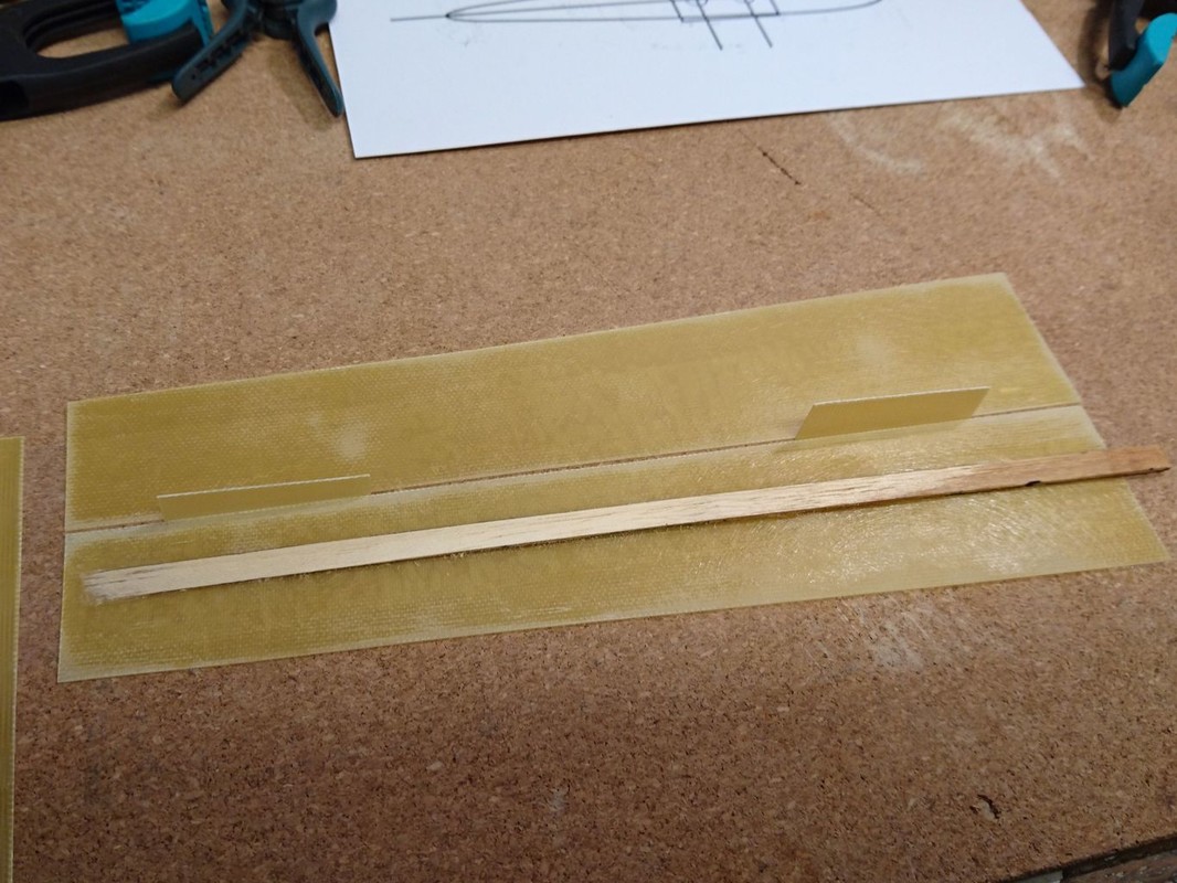 Stavba začala výrobou kýlu a listu kormidla. Použil jsem laminát tloušťky cca 0,8mm. Abych se vyhnul tmelení a broušení, tak jsem nejprve polepil vnější stranu širokou izolepou, izolepou jsem slepil na jedné straně vždy dvě půlky (kýlu, kormidla) s mezerou na tloušťku materiálu. Do kýlu jsem vkládal klín ze smrkové lišty, kormidlo zase tvarovala vlepená zploštělá hřídel. Pak stačilo pořádně nanést epoxydové lepidlo na zdrsněné okraje dílů, díly na izolepě jako pantu otočit na sebe a na druhé straně zafixovat další izolepou (kterou jsem měl na jednom z dílů připravenu). Pak zatáhnout mezi dva úhelníky ve svěráku (i ty jsem raději polepil izolepou). Po vytvrdnutí stačilo sloupnout izolepy a začistit přebytky lepidla na hranách. Plochy byly absolutně čisté, připravené k nástřiku.