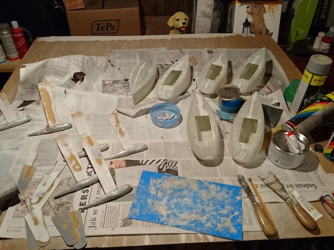 Pro tuto ideu jsem přesvědčil i Michala Šenekela, který mi přislíbil pomoc s uspořádáním serv a výrobou potřebných dílů pro útroby lodí. Od Ladouse jsem získal kontakt na pana Hubáčka a domluvil zaslání šestice vylaminovaných trupů, odlitých závaží a sad spojek a koncovek pro takeláž, vytištěných na 3D tiskárně. Dokoupil jsem vše další potřebné, uhlíkové trubičky a také šestici sprejů rozličných barev. Napájení jsem chtěl řešit moderně, z malých powerbank, takže jsem zakoupil šest výprodejových powerbank 2.200 mAh a pětinásobný USB zdroj. No, raději sem nebudu psát, kolik jsem do této své ideje zainvestoval…