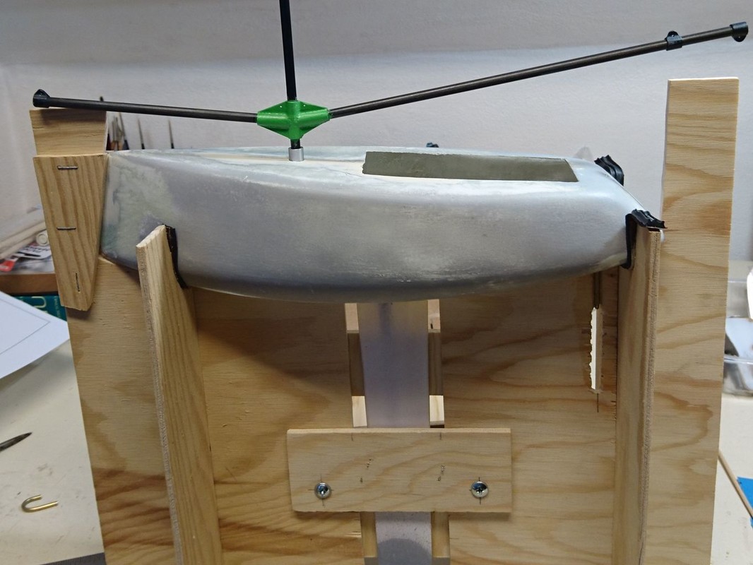 Samozřejmě, stříkání bylo na jiném místě. Fotil jsem spíše přípravek na nastříkání footy ze všech stran najednou. Držela na dvou překližkových destičkách se základnou. Ty byly rozepřeny špalíkem a tak se s trupem dalo bezpečně manipulovat a otáčet všemi směry.