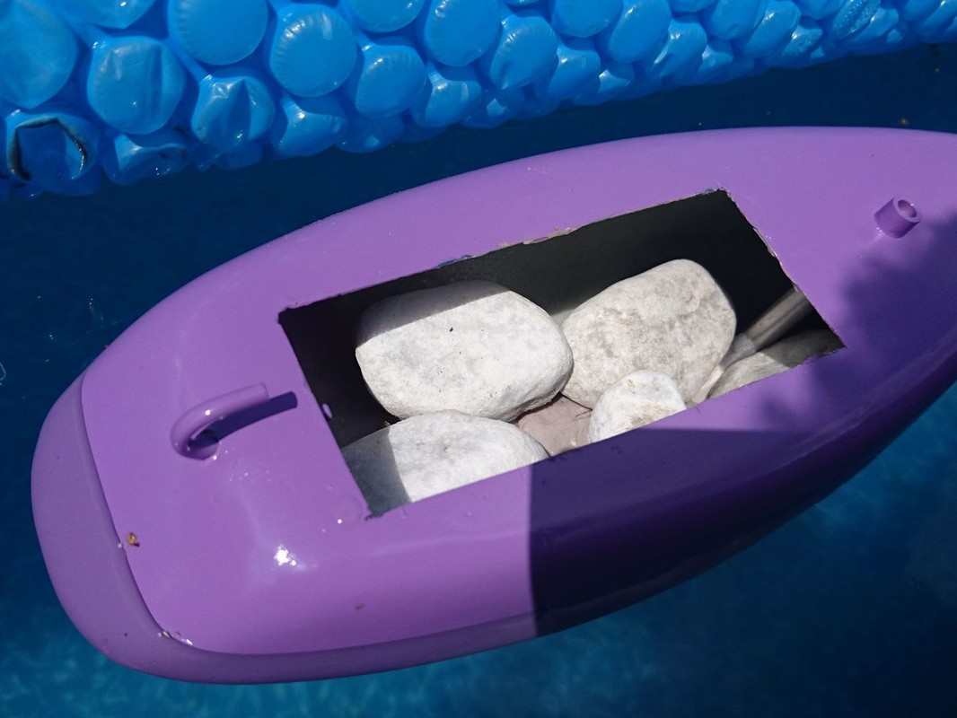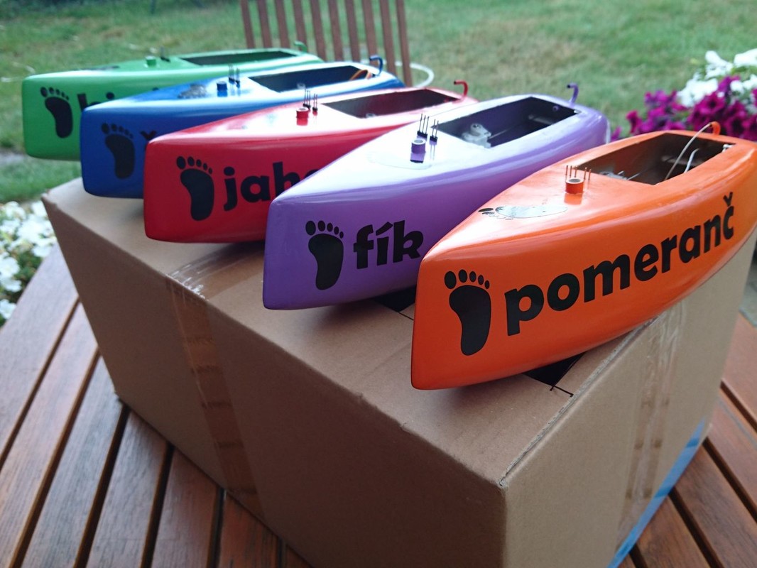 Zima 2019 utekla nějak rychle a tak nastalo jarní dohánění termínů – ta Kristýna a věci s ní spojené měly větší prioritu. A tak, pokud jste footyny dle výše popsaného záměru na Kristýně neviděli, není to vaše chyba. První hotovou, žlutou - CITRON, jsem dovezl až na první seriálovku do Bakova. Tam byla chvíli na vodě, docela jezdila, ale pak jsem s ní spěchal ke břehu, protože rapidně zvětšovala ponor a nabírala vodu. Čím to? Prostup kormidla? Špatně vlepený kýl? Jak se ukázalo až doma, na bazénu, voda prosakovala laminátovým trupem. Ten asi nebyl moc dobře prosycený a při tmelení přechodu a spoje dvou půlek trupu jsem zřejmě místy při broušení sjel i vrchní vrstvičku pryskyřice. Dvě vrstvy základu nic moc nevyřešily a svrchní barevná vrstva také ne. Všech ostatních pět připravených trupů na tom bylo, co se týká průsaku, stejně. Naštěstí, ty ještě nebyly uvnitř vystrojené. Takže všech šest trupů jsem vytřel zevnitř řídkou pryskyřicí (dělalo se to moc hezky!) a znovu otestoval na bazénu, kdy jsem je kamínky zatížil na maximální ponor (kormidlo bylo venku a trubička zacpaná). Docela to trvalo, protože to byl souboj na několik kol.