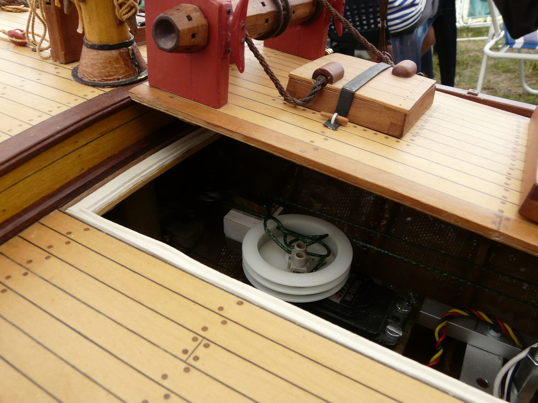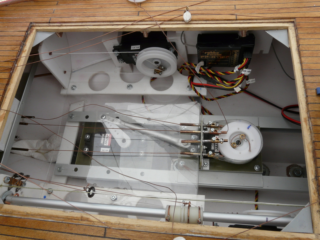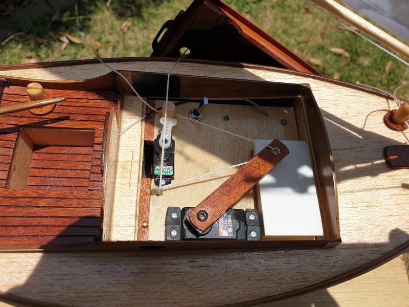 K Tvé strojovně. Dělal jsem si takový malý průzkum, jak jsou ovládané různé menší modely plachetnic. Footyny, Micro magic, apod. Nepřekvapivě servem s dlouhou pákou. Hodím Ti sem pár obrázků abys chytil inspiraci, ale je toho plný internet. Stačí pohledat…