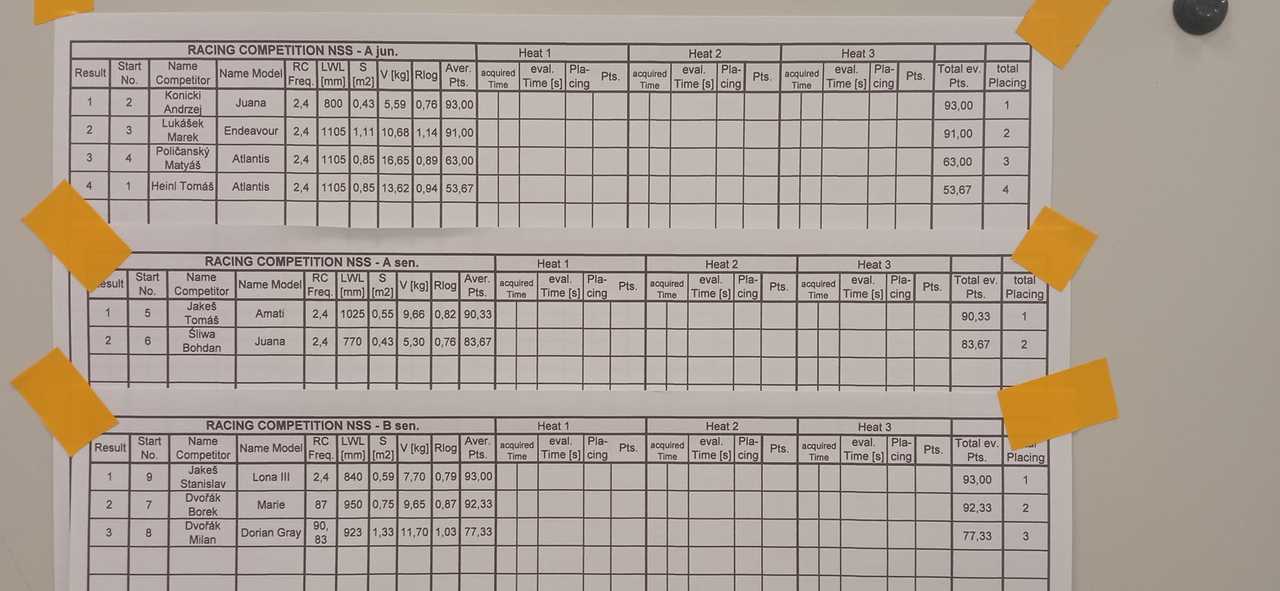 Zatím to je trochu boj, mě se 15 minut před jízdou nepodařilo zapnout vysílač (po té večer jsem zjistil jeden nefunkční přepínač) při použití jiné vysílačky jsem přetrhl otěž přední geny, takže jsem jel s omezením ovládáním plachet, kormidlo nestačil zreverzovat, takže ještě přehozené směry. V juniorech se hodně Polák Konicki motal okolo Marka s Endeauerem, až se mu postavil před špici a odvezl si díru v trupu. <br />