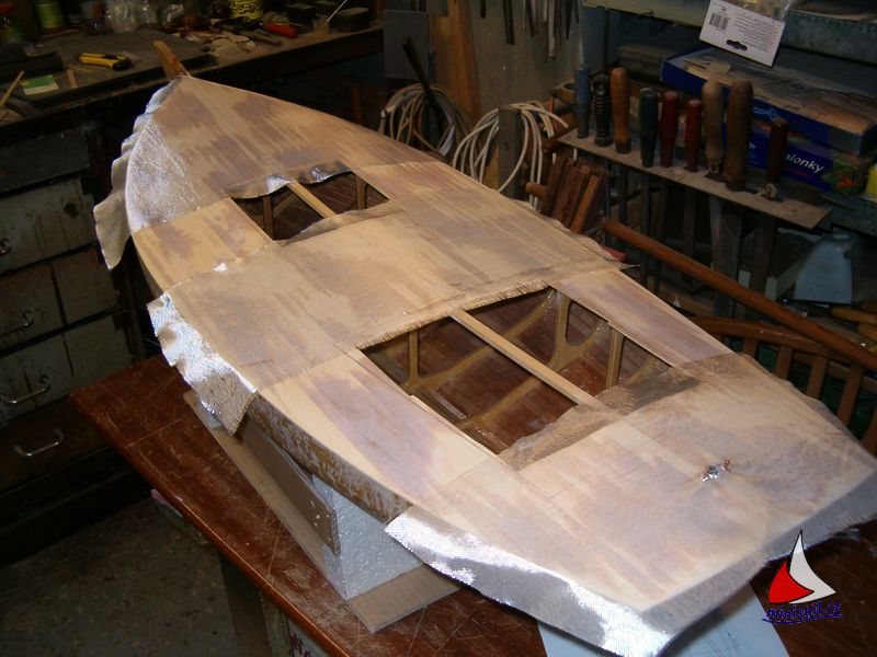 Paluba je plaňkována opět pruhy překližky přes kterou je položena laminátová vrstva. Tu je potřeba obrousit až na sklo, aby se k ní dalo lepit. Konečně jsem se snad zbavil věčného prachu z broušení. Po zdlouhavém přebírání dýhy jsem se konečně rozhodl pro ten správný materiál na palubu. Nejdřív jsem si udělal zkoušku na kusu laminátu - tedy čím nejlépe lepit a jak.