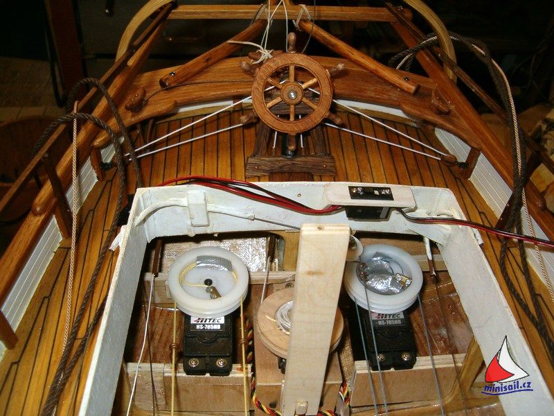 Kormidlo je ovládáno stejně jako na předloze lany vedenými přes kladky a osu kormidelního kola s tím rozdílem , že lana mizí v podpalubí a jsou ukotvena ke kotouči serva Futaba S29.