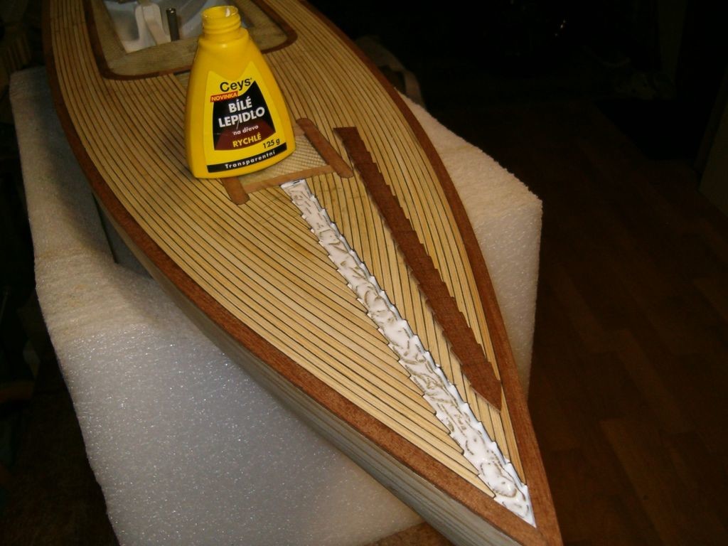 Tomáš a teď já pokládám palubkovou palubu na laminátový podklad, i lišty lepím epoxidem většinou po několika lištách, takže se mi osvědčilo pro skládání a dopasovávání nasucho nalepit na laminátovou palubu oboustrannou lepící pásku. Jinak na spáry se dá v lepším papírnictví koupit barevná čtvrtka (180g) ve velikosti A4 i A3 v různých barvách, zkoušel jsem i okr v kombinaci s lištami se sraženou hranou jako imitaci svislých palubek na nástavbu.