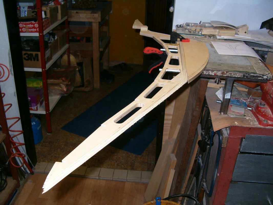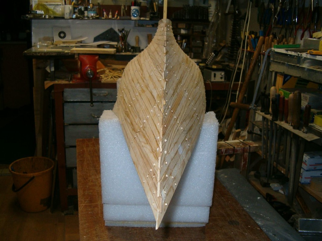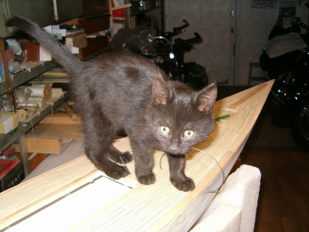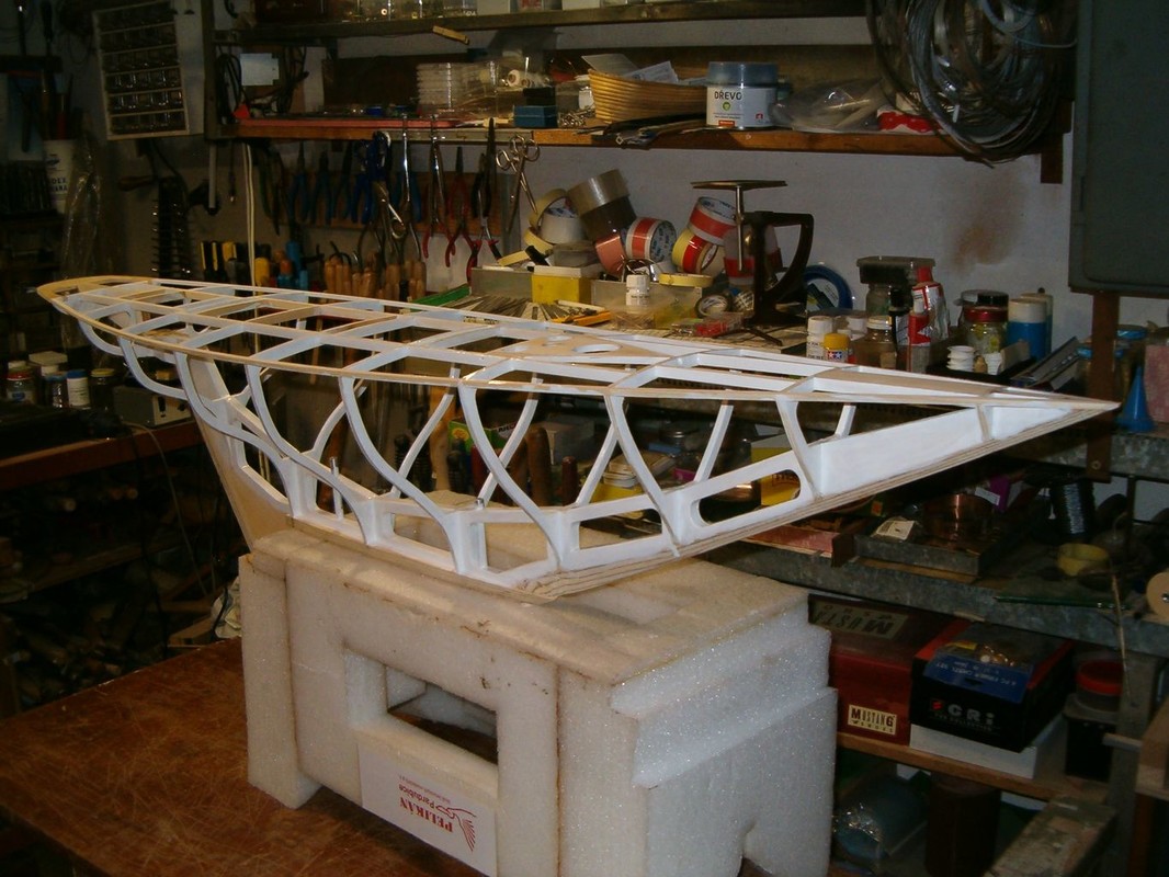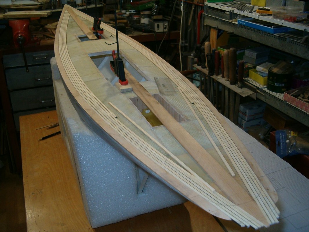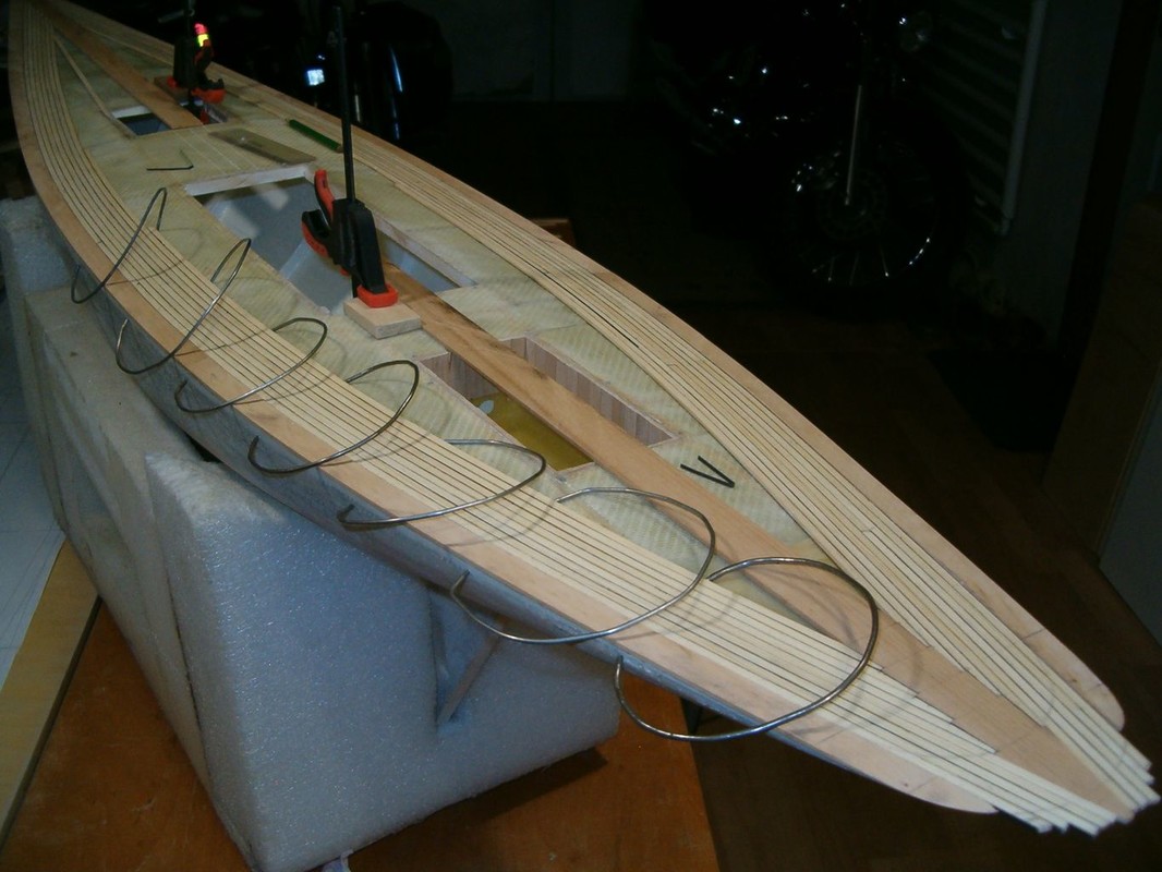 Začal jsem sháněním podkladů, kterých je naštěstí na internetu hodně. Zvláště obrázky a krátká videa na YouTube. Porovnáváním plánků polských, francouzských a fotografií se začal rodit počítačový výkres. Z něho pak vznikly podklady pro vyřezání překližkových žeber a páteře na gravírovacím plotru. Stavbu jsem začal v srpnu 2020. Poslepoval jsem kostru letmo, přímo na páteři s oční kontrolou souměrnosti. Dokud byl do trupu přístup mezi žebry, provedl jsem jejich nátěr a umístění mechanismů ovládání. Vše tak, aby se dalo cokoliv namontovat a vyjmout otvorem pod nástavbou. Další operací bylo oplaňkování smrkovými lištami tloušťky 3mm , nařezanými na cirkulárce z odstraněného obkladu. Plaňky jsem předohýbal a překrucoval nad horkovzdušnou pistolí. Polohu na žebrech jsem jistil kolíčky na prádlo, a kde to nešlo, i malými vruty. Na všech žebrech jsem pak navrtal a zalepil kolíček. Vnitřek trupu jsem impregnoval pryskyřicí epoxy 1200 a nejnižší část mezi žebry vyplnil stavební pěnou. Důvodem této operace bylo očekávání, že voda, která se do trupu dostane, nesteče až úplně dolů, ani nezůstane někde za žebry. Vnější část trupu pak prošla broušením a tmelením polyesterovým tmelem na dřevo.