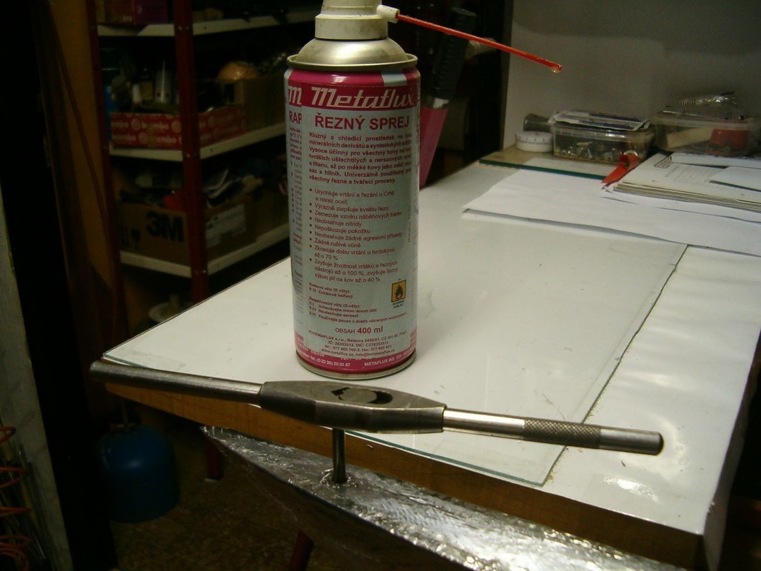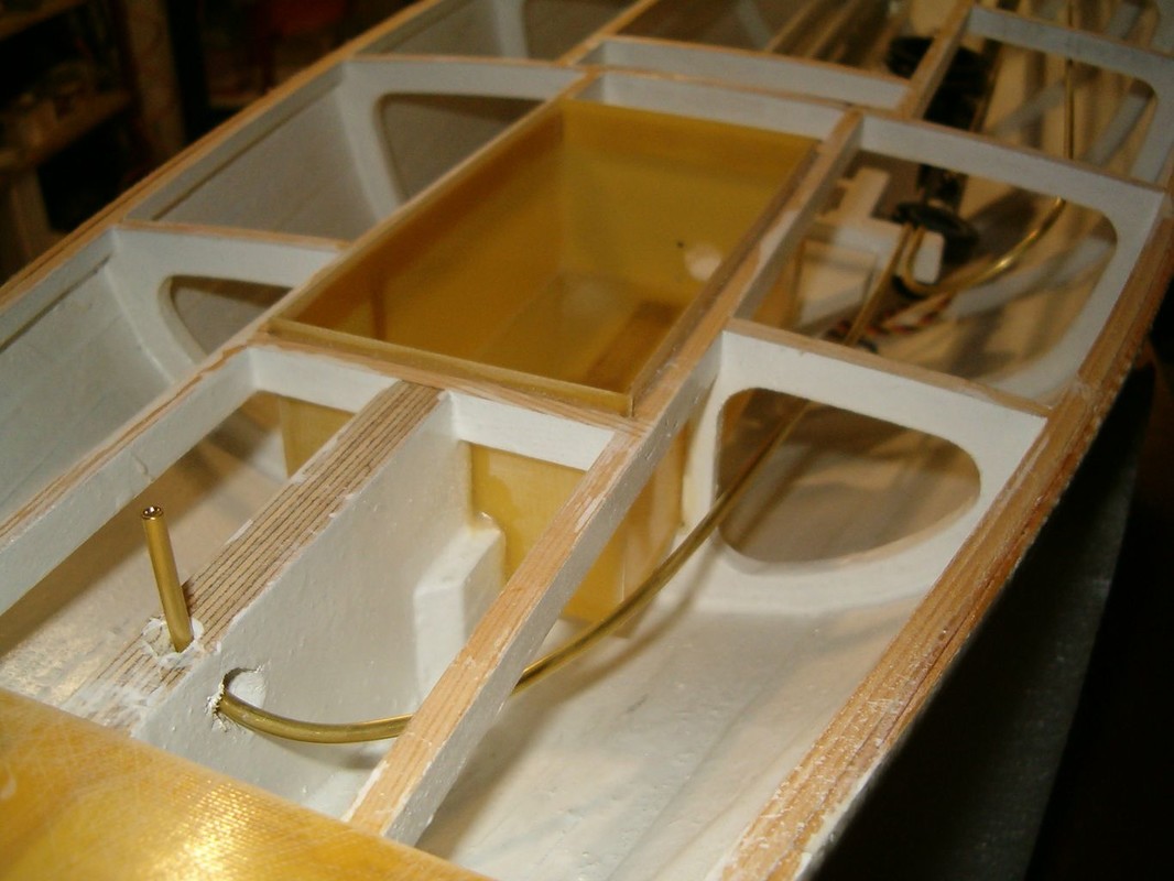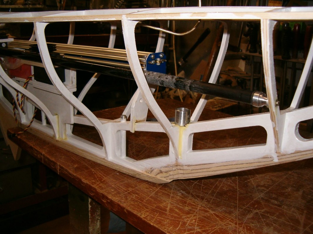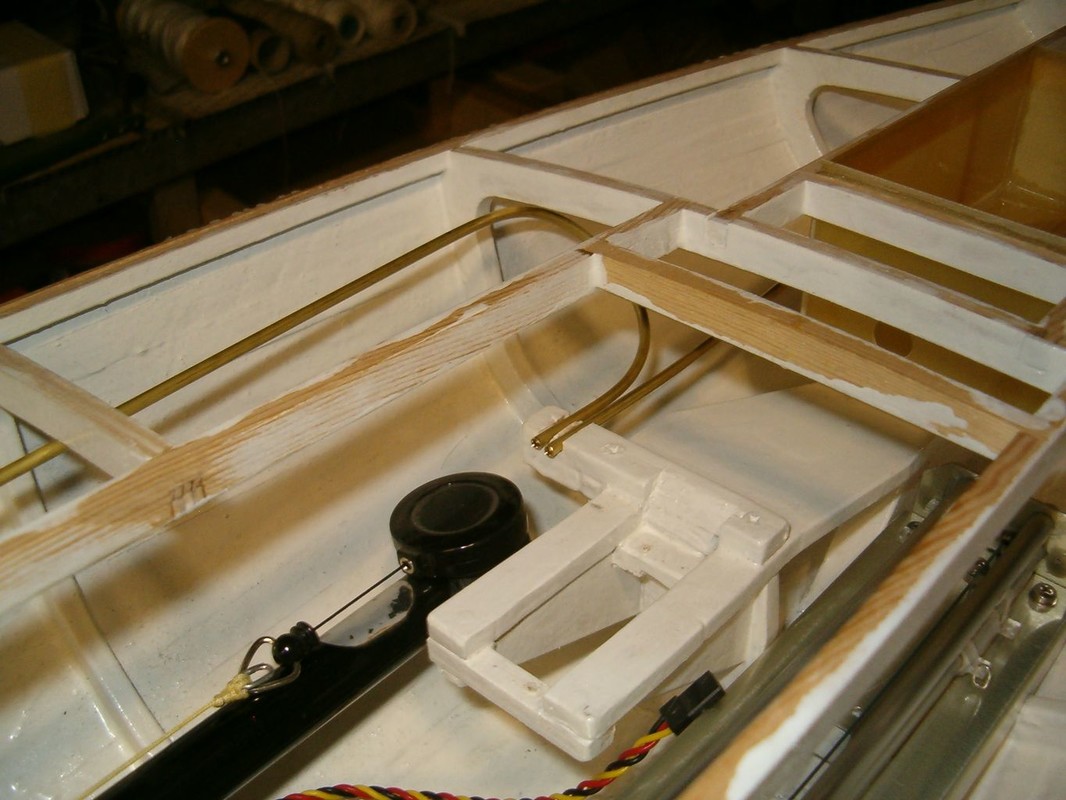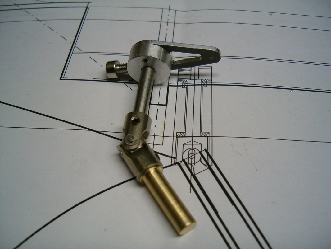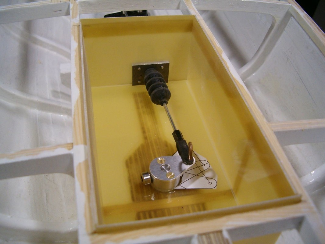Slepil jsem kokpit z laminátu a vyvrtal otvor pro osu kormidla. Osa kormidla je kolmá, aby se mechanismus řízení dal schovat pod falešnou podlahu. Zbytek osy kormidla vystupující z trupu je zalomen kardanem do úhlu podle předlohy. Zajímavá je geometrie táhla kormidla, která umožňuje minimální boční pohyb táhla v prostupu gumovou průchodkou.