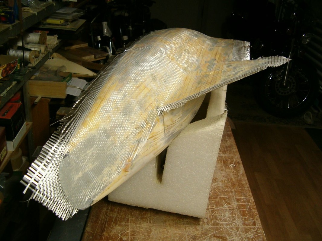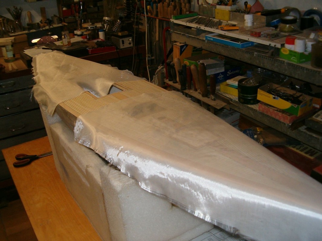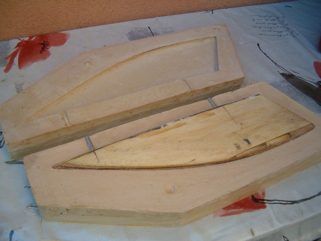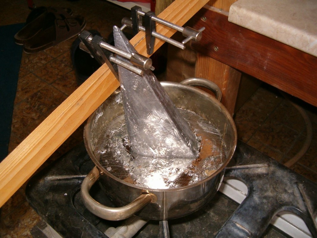 Vnějšek trupu jsem potáhl skelnou tkaninou 300g/m2 nasycenou pryskyřicí epoxy 1200, kterou jsem nanášel válečkem. Následně je trup zatmelen polyesterovým tmelem. Operací mimo loď bylo zhotovení kopyta a formy pro odlévání balastu. Dřevěnou formu jsem impregnoval lepicí páskou. Kopyto jsem ve formě polohoval sloupky s vruty , které korespondují s otvory v kýlu. Sádru jsem naléval postupně a prokládal armaturou z perlinky. Po nalití do poloviny formy jsem nechal sádru vytvrdnout, namastil vazelínou a dolil zbytek. Půlky šly od sebe dobře, zhotovil jsem nalévací a odvzdušňovací otvory. Dlouho jsem pak formu sušil. Kov jsem roztavil na záložním vařiči v kastrolu, kterému jsem naohýbal hubičku. Nalil jsem celou formu najednou. Na opracování mám speciální rašpli a na vrtání a řezání závitů speciální řezný sprej. Jde to jako do hliníku. Pak mohla jít loď do vany. Tam jsem zjistil, že je těžiště moc vzadu, a proto jsem z balastu uřízl 3kg a tvar trochu upravil. Po další vanové zkoušce bylo již vše v pořádku. Budu ale muset za balast doplnit mrtvé dřevo.