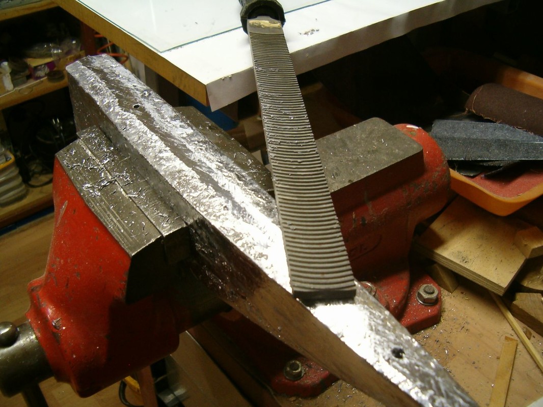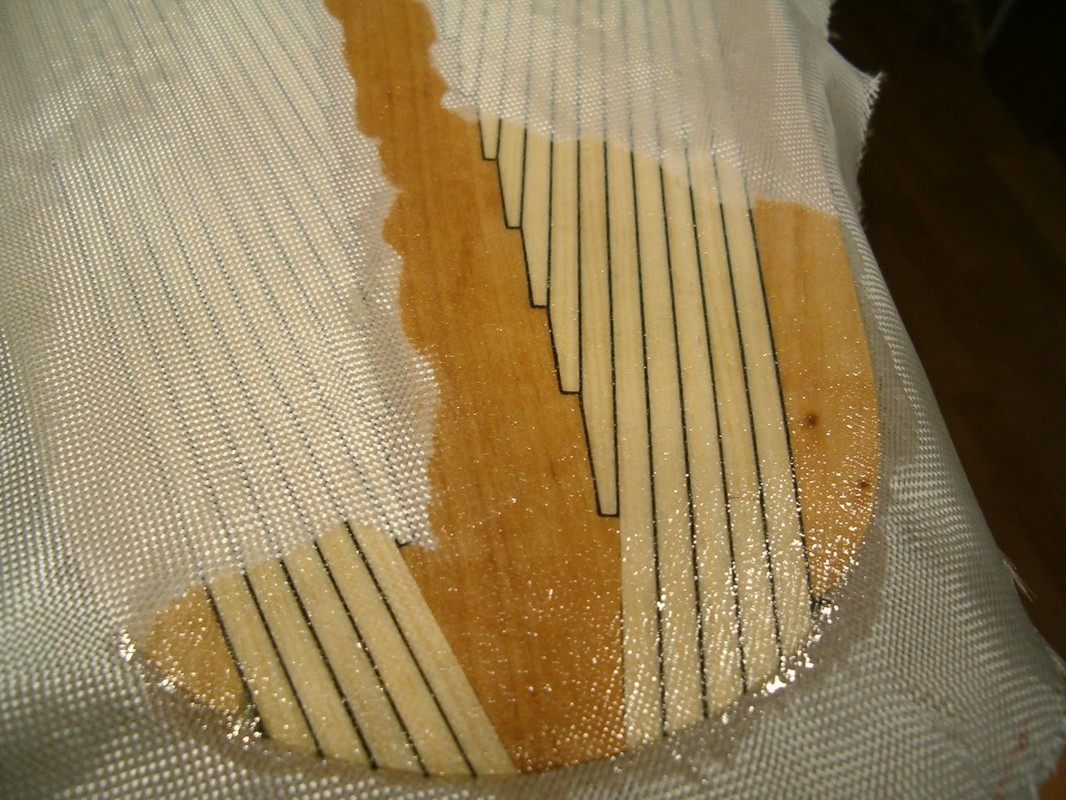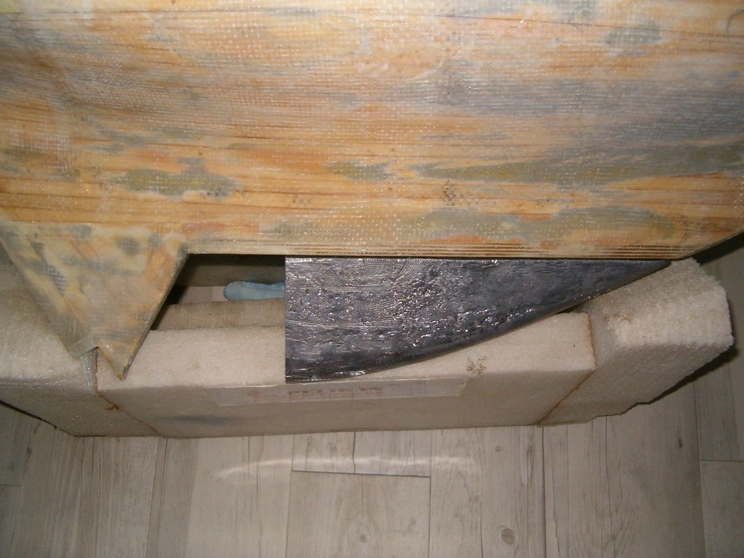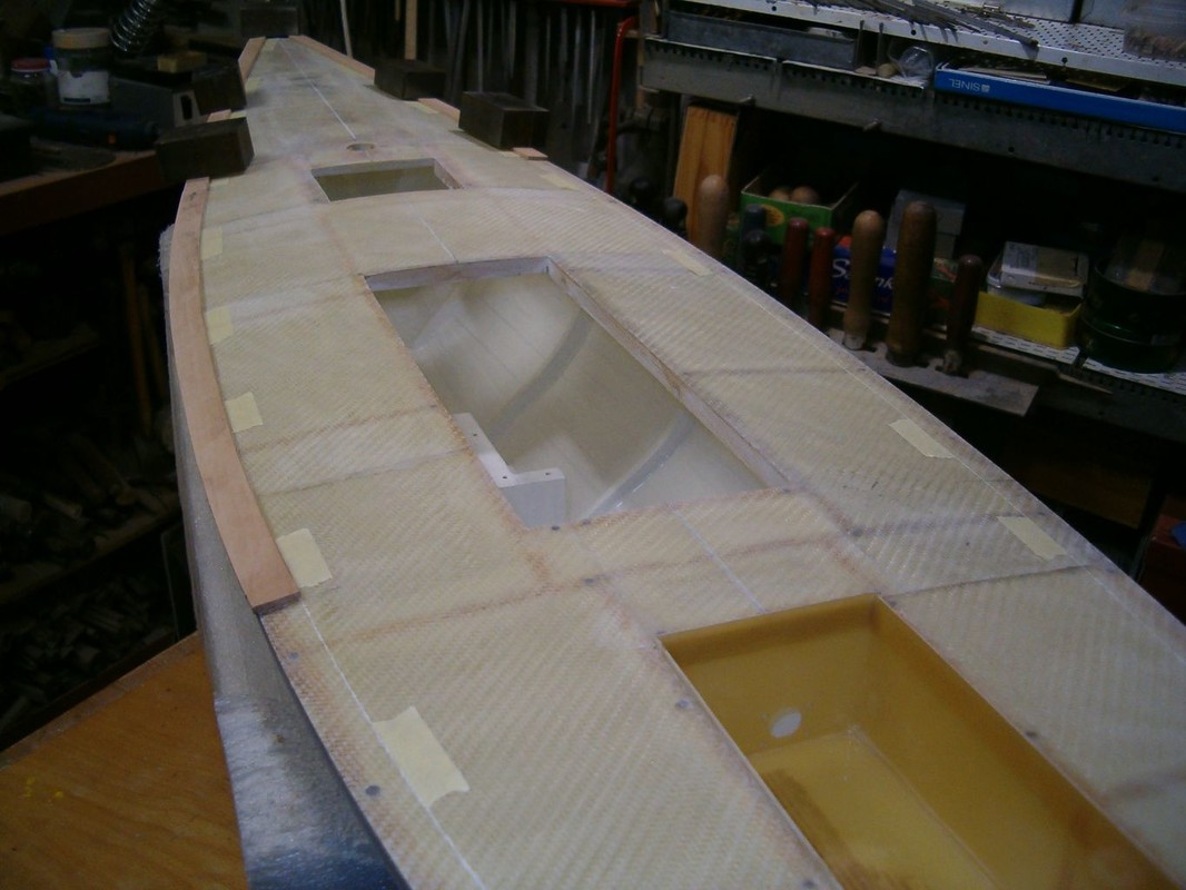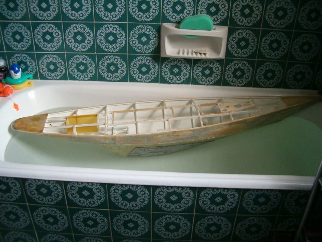 Vnějšek trupu jsem potáhl skelnou tkaninou 300g/m2 nasycenou pryskyřicí epoxy 1200, kterou jsem nanášel válečkem. Následně je trup zatmelen polyesterovým tmelem. Operací mimo loď bylo zhotovení kopyta a formy pro odlévání balastu. Dřevěnou formu jsem impregnoval lepicí páskou. Kopyto jsem ve formě polohoval sloupky s vruty , které korespondují s otvory v kýlu. Sádru jsem naléval postupně a prokládal armaturou z perlinky. Po nalití do poloviny formy jsem nechal sádru vytvrdnout, namastil vazelínou a dolil zbytek. Půlky šly od sebe dobře, zhotovil jsem nalévací a odvzdušňovací otvory. Dlouho jsem pak formu sušil. Kov jsem roztavil na záložním vařiči v kastrolu, kterému jsem naohýbal hubičku. Nalil jsem celou formu najednou. Na opracování mám speciální rašpli a na vrtání a řezání závitů speciální řezný sprej. Jde to jako do hliníku. Pak mohla jít loď do vany. Tam jsem zjistil, že je těžiště moc vzadu, a proto jsem z balastu uřízl 3kg a tvar trochu upravil. Po další vanové zkoušce bylo již vše v pořádku. Budu ale muset za balast doplnit mrtvé dřevo.