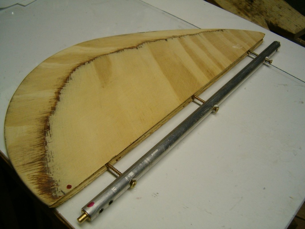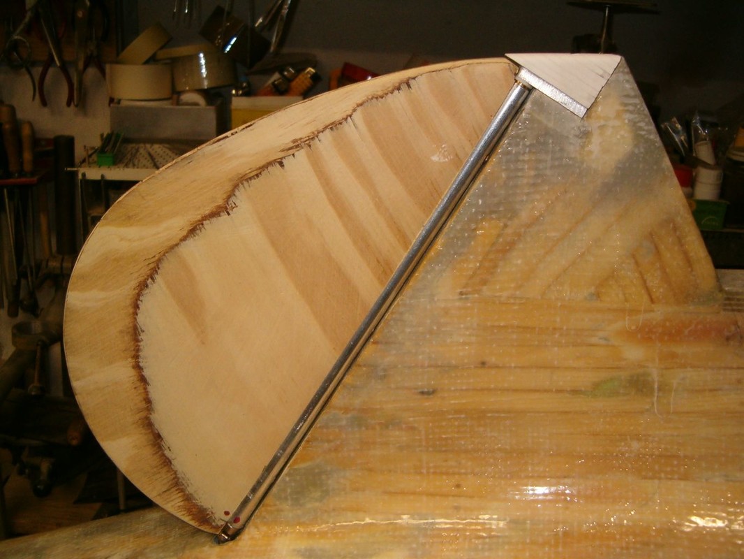 Další práce pokračovaly až na podzim 2021. Palubu jsem překryl laminátovými deskami tl.1mm. Jedním kusem to nejde , protože lodní paluba je ve dvou osách prohnutá. Kormidlo sestává z perutě z překližky a osy z hliníkové silnostěnné trubky prošroubované do překližky. Po vytmelení přijde vše přelaminovat.