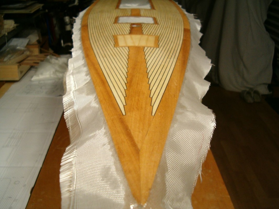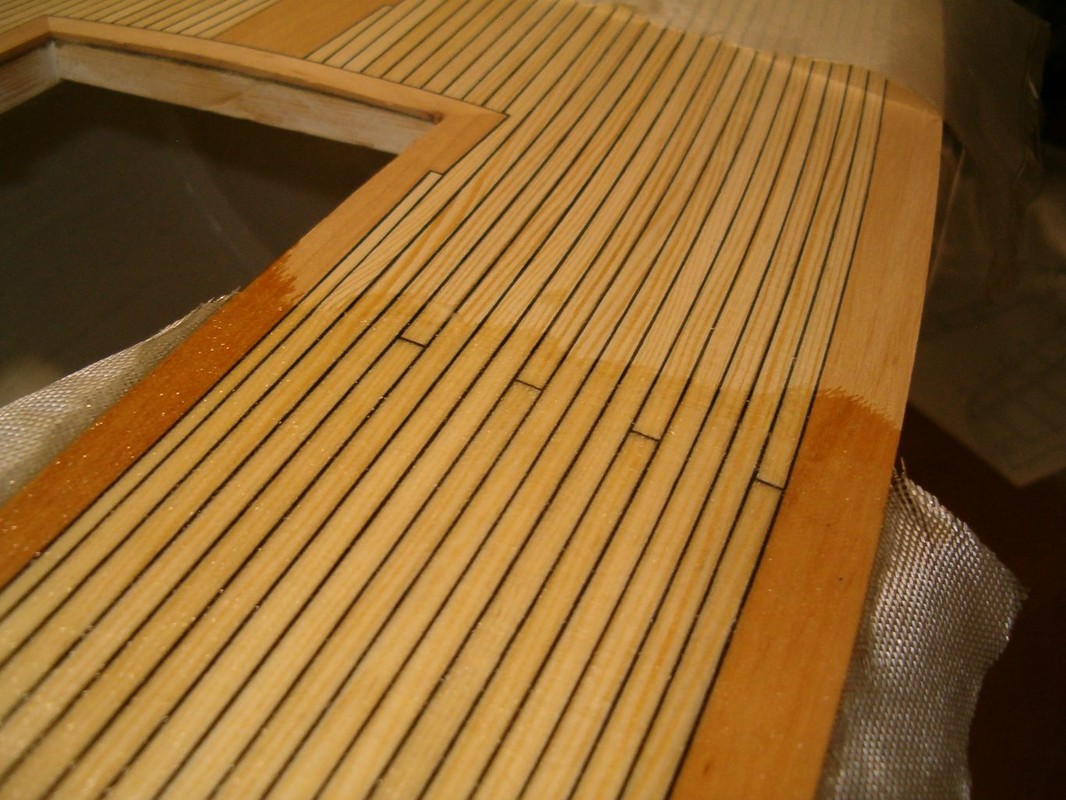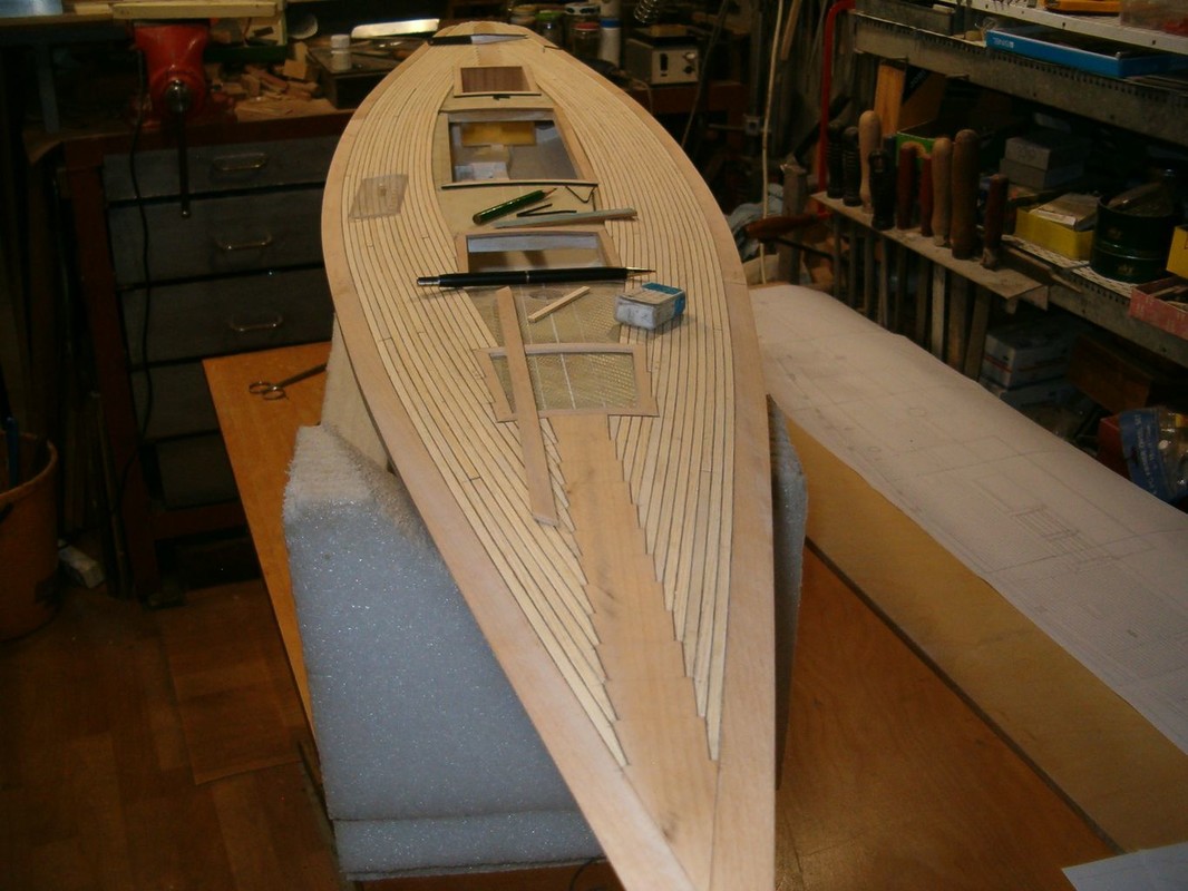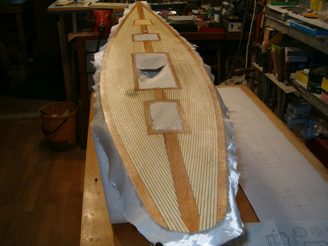 Konečně jsem se dostal k položení paluby. Po dlouhých rozvahách jsem zvolil palubu ze smrkových planěk a zbytek z olše. Nejdřív jsem počítal s mořením dílů z olše. Pak jsem si udělal zkoušku a rozhodl se pouze pro lakování. Lišty jsem polepoval prešpánem a celkově jsem postupoval stejně jako při minulých modelech. Přes všechno jsem položil laminát ze skelné tkaniny 80g/m2 a pryskyřice BG 280. Barva dřeva vyšla naprosto přesně. Tak to je zatím všechno, co můžu sdělit o stavbě Pen Duicka.
