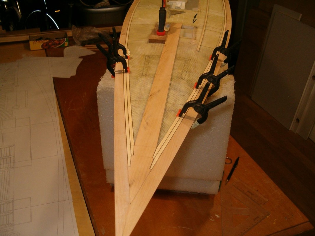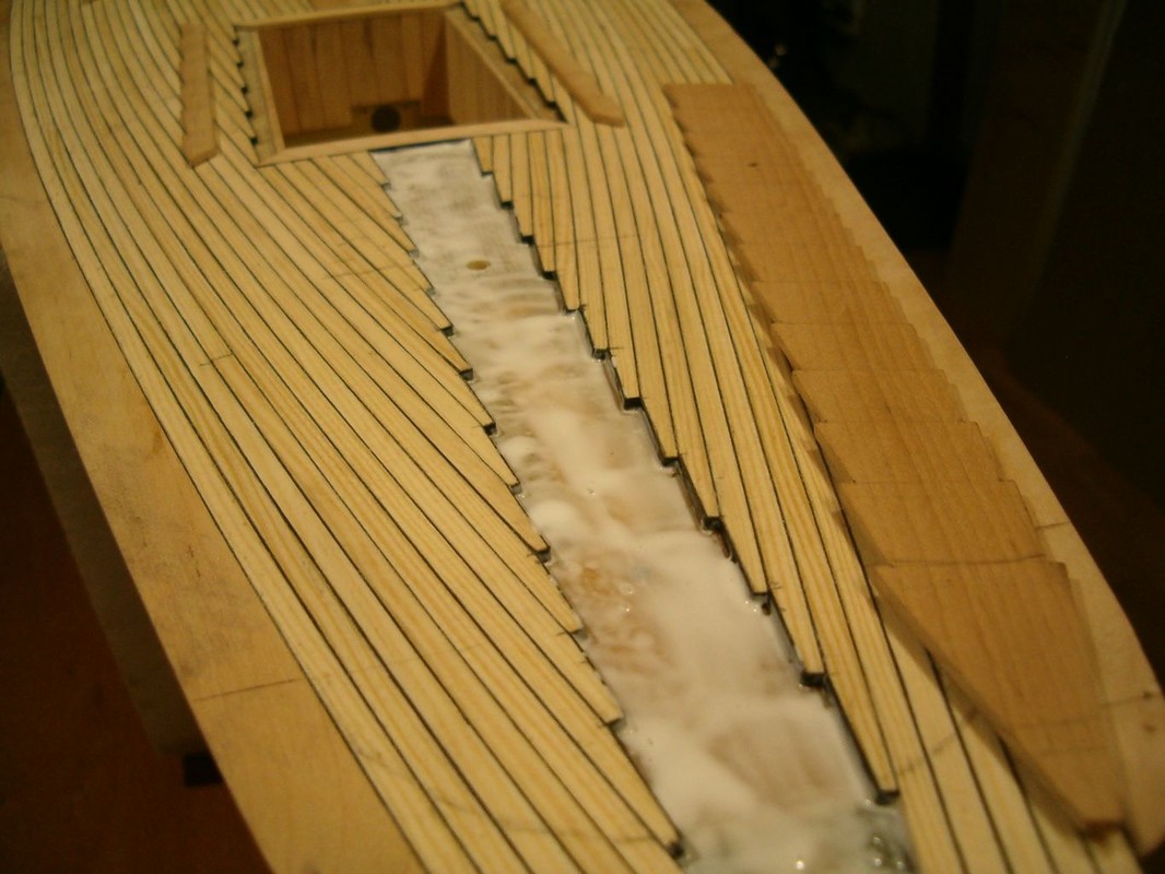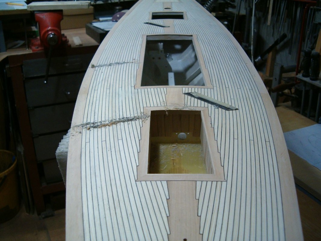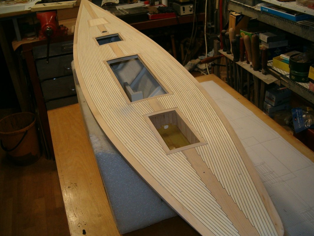 Konečně jsem se dostal k položení paluby. Po dlouhých rozvahách jsem zvolil palubu ze smrkových planěk a zbytek z olše. Nejdřív jsem počítal s mořením dílů z olše. Pak jsem si udělal zkoušku a rozhodl se pouze pro lakování. Lišty jsem polepoval prešpánem a celkově jsem postupoval stejně jako při minulých modelech. Přes všechno jsem položil laminát ze skelné tkaniny 80g/m2 a pryskyřice BG 280. Barva dřeva vyšla naprosto přesně. Tak to je zatím všechno, co můžu sdělit o stavbě Pen Duicka.
