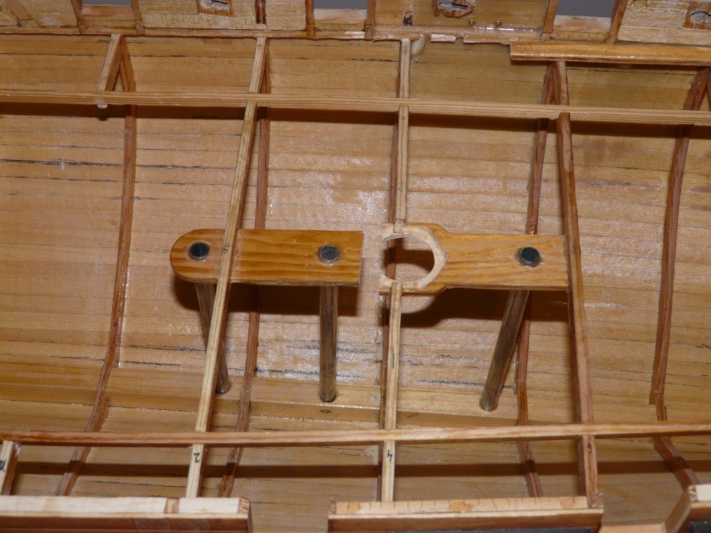 Přibyly otvory pro vesla v bortech mezi střílnami. (obr. 1 a 2). Přestože na žádném známém zobrazení Pickle veslové otvory nejsou vidět, bylo mi řečeno že byly u podobných lodí standard. Při studiu historie předlohy jsem našel také zmínku že použily tyto velká vesla k vyztužení prasklého čelenu. (Než za bouře praskl celý a zmizel v moři.) Takže je měli prokazatelně na palubě. Veslové otvory byly nejčastěji čtvercové ale mohly být i s výřezem pro list vesla, buď na jedné nebo obou stranách. Tato velká vesla nesloužily primárně k pohybu lodě.( I když i to se dalo). Loď se vlekla zpravidla pomocí člunů. Ale posloužily třeba k tomu aby bylo možno loď za bezvětří natočit bokem k blížícímu se nepřátelskému výsadku na člunech nebo dělovému člunu a pokropit je palbou. Nebo v nouzi jako náhradní kulatina...