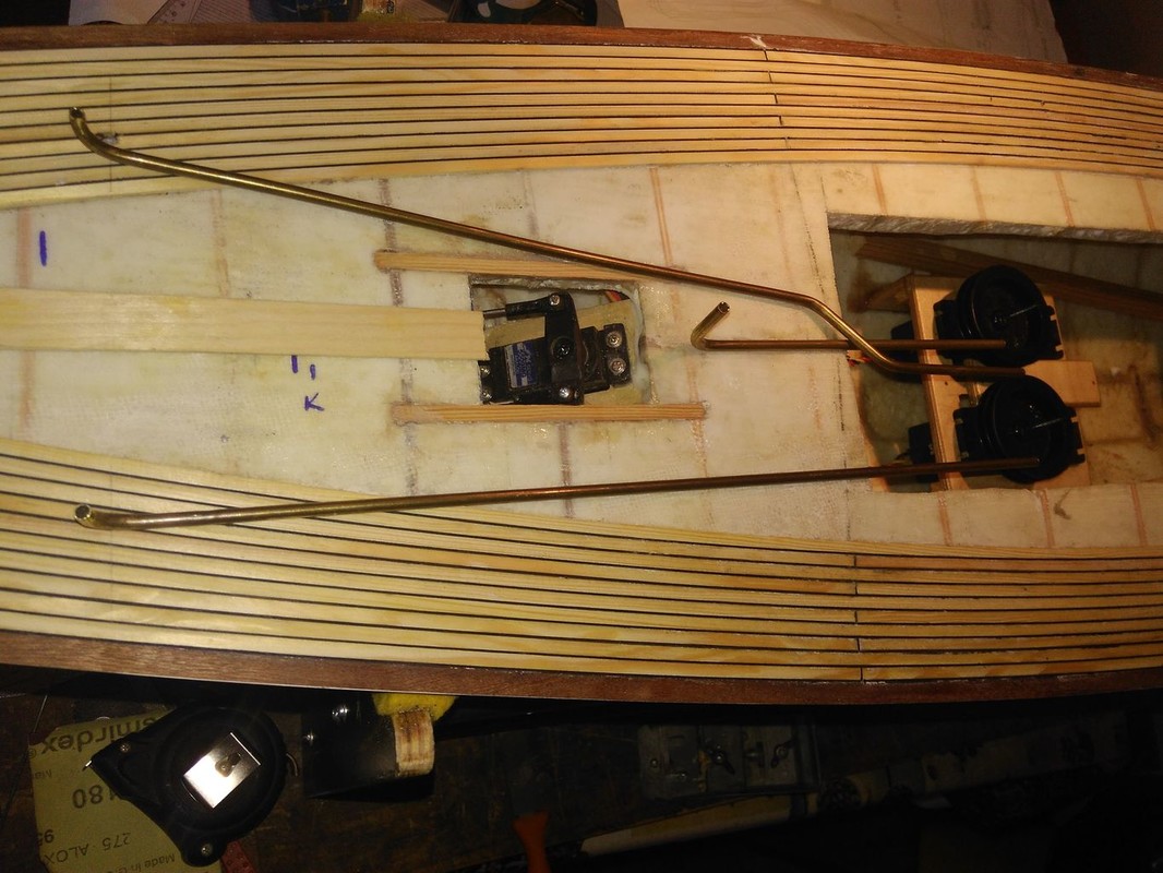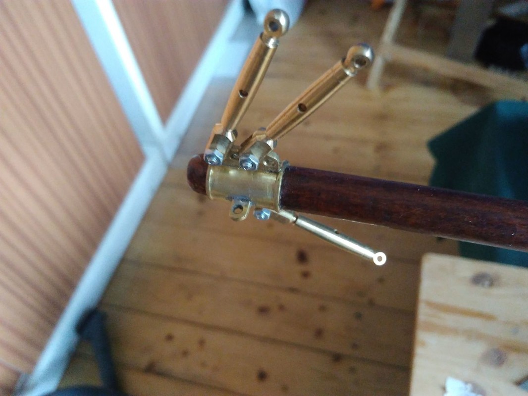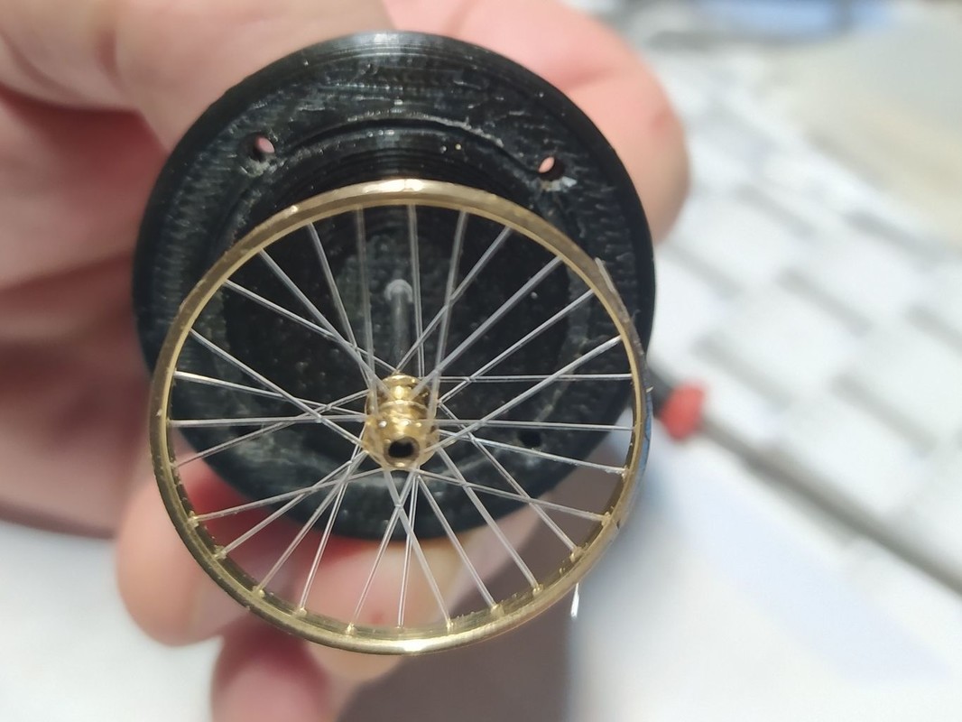 Lehce šmatlající vyplétané kormidelní kolo se mi z naprosto zborcené verze přes něco velmi těžce šmatlajícího povedlo taky až na sedmý pokus. Nejdřív jsem zkoušel vyplétat drátem, a ty pokusy jsem ani nezapočítal, ale nakonec je použit silonový vlasec, napatlaný barvou. Inspiraci k výrobě jsem čerpal v článku v Modeláři, kde Antonín Alfery popisoval výrobu vyplétaných kol pro makety letadel z 1. světové války.
