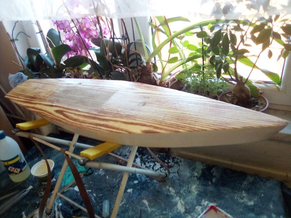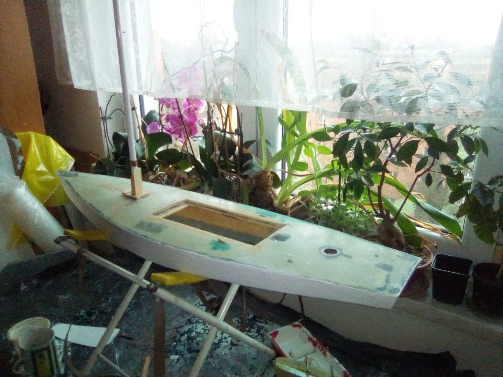 Franta mi poslal pár obrázků a krátký text o stavbě modelu: Ahoj, bočnice jsou z balzy 2mm, délka modelu je dána délkou balzy. Dno je extrudovaný šedý polystyren 20 x 500 x 1000 mm, celé potaženo kepr tkaninou (163g) v jednom kuse (epoxy LH 145). Paluba je z laminátu prohnutá ve formě a povrchově potažená tkaninou od Havla (30g) v barvě dřeva. Servo na plachty (JX SW-5513-6PA 55g/10,6kg), stojí méně než Hitec. Klasická nekonečná smyčka. Otvor je zakryt plexi a zalepen.