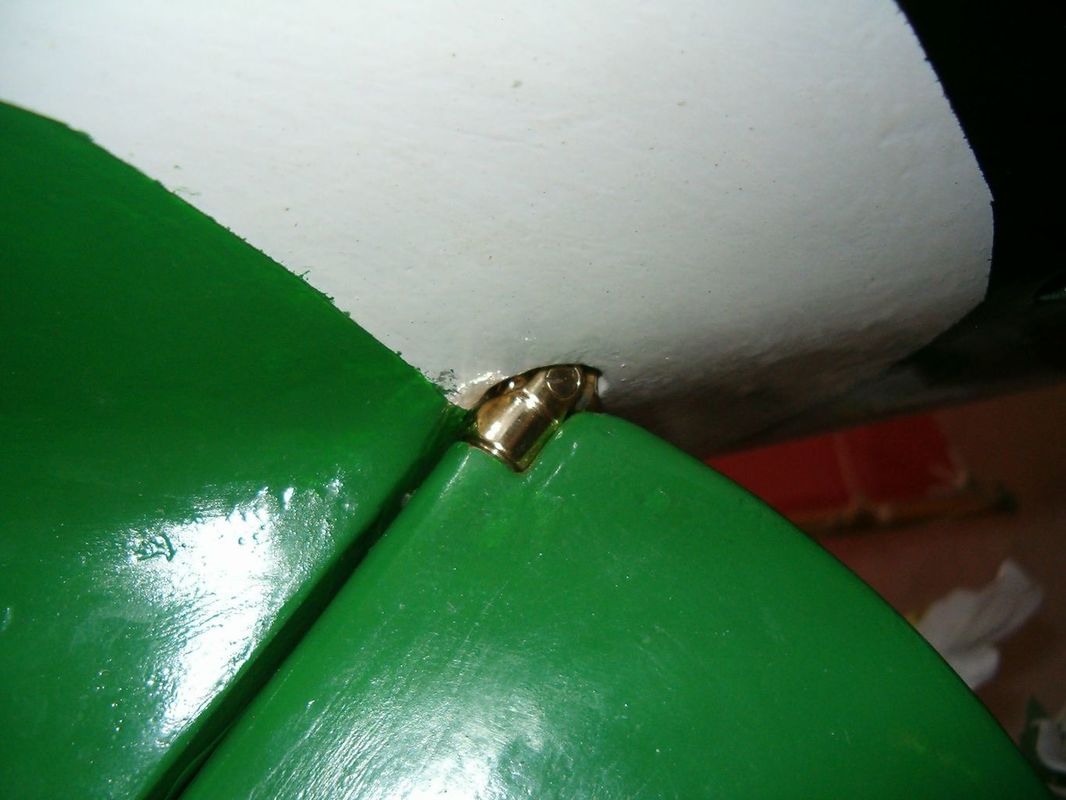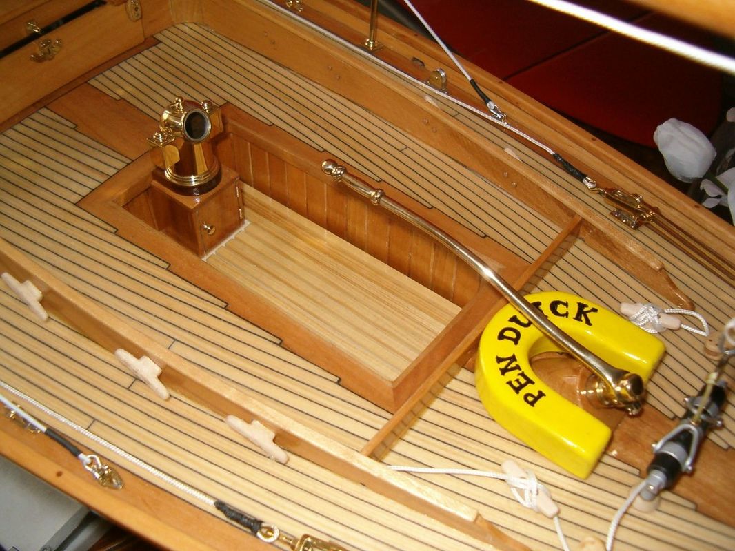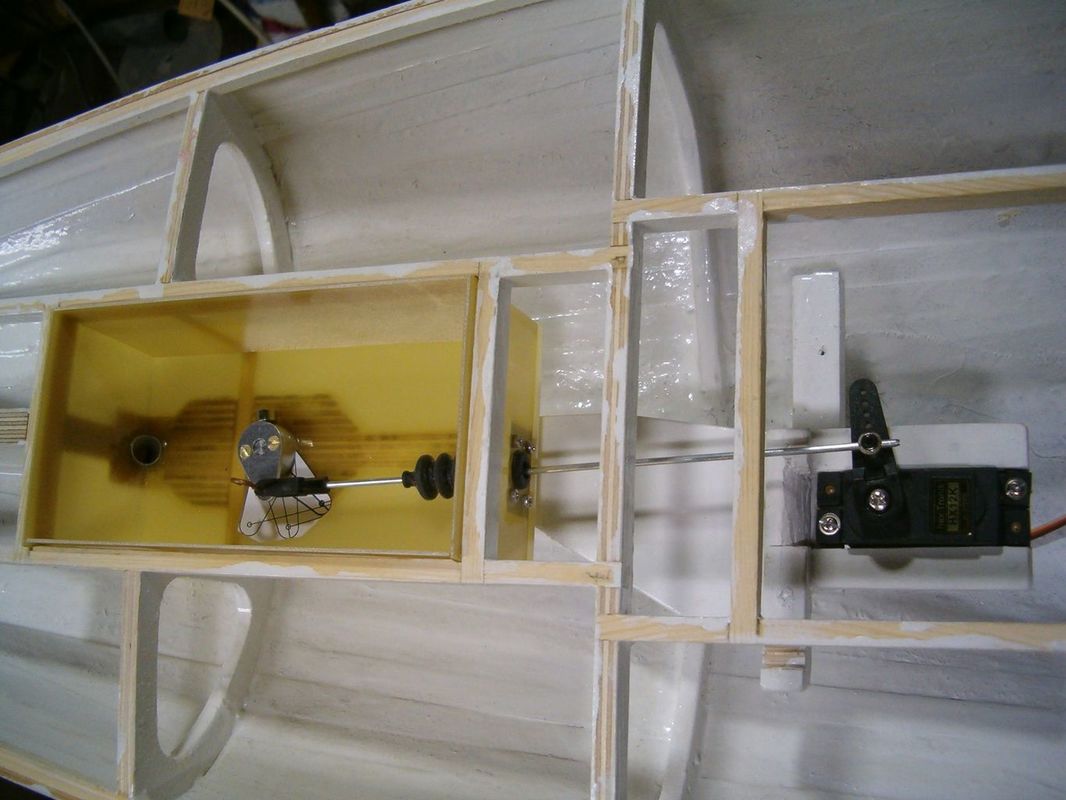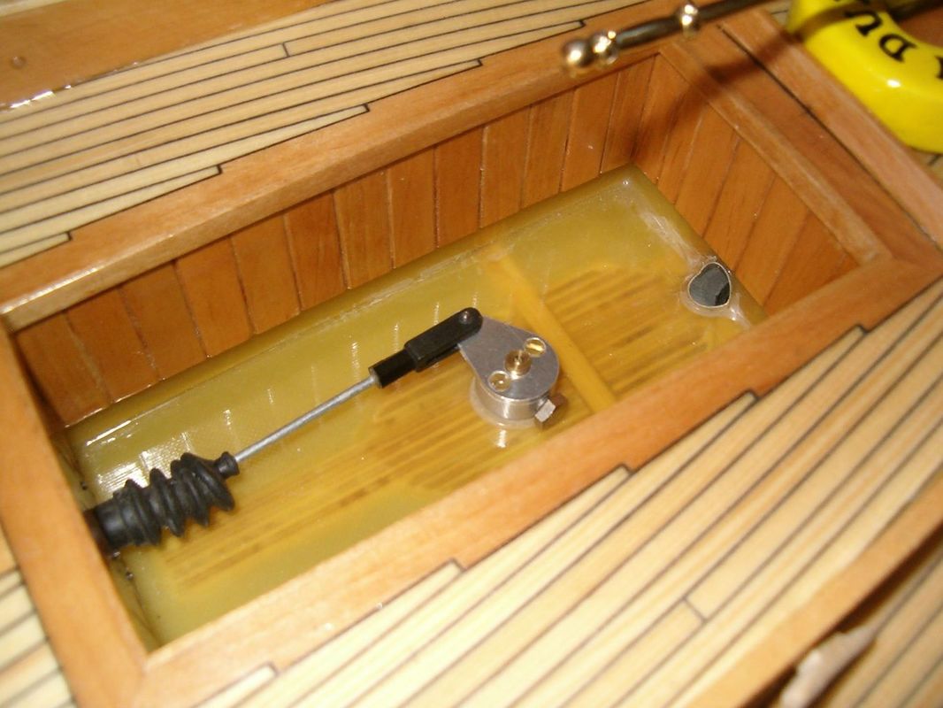 Jako bonus přidávám neobvyklé řešení zalomení kormidelní osy. Tento způsob jsem vymyslel kvůli zamezení zatékání vody do trupu kolem osy kormidla. Ložisko osy nyní ústí do kokpitu, který je samo vylévací. To znamená, že je v něm otvor, kterým voda, která se do něho dostane ať už vrchem, nebo podle osy kormidla může odtéci ven. Táhlo, které je dostatečně vysoko nade dnem, je ještě těsněno gumovou průchodkou. Celé je to potom zakryto další pohledovou podlahou.