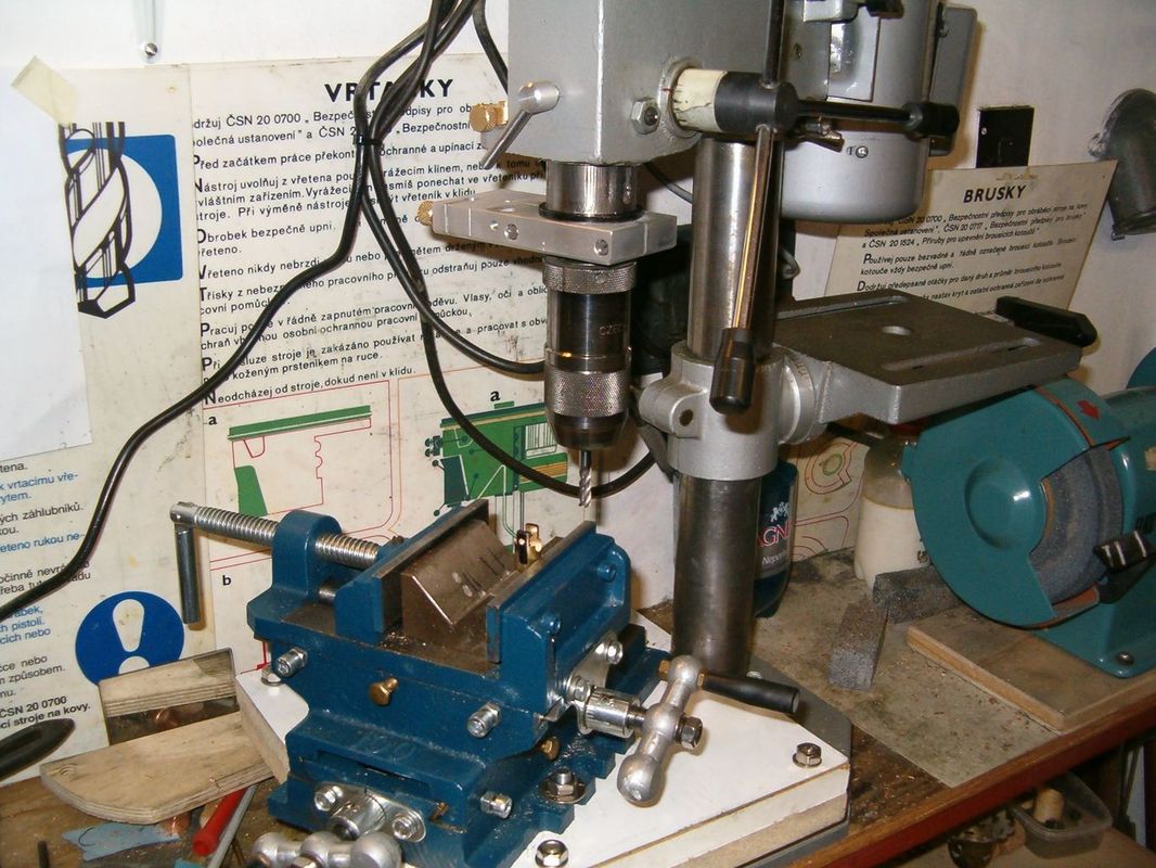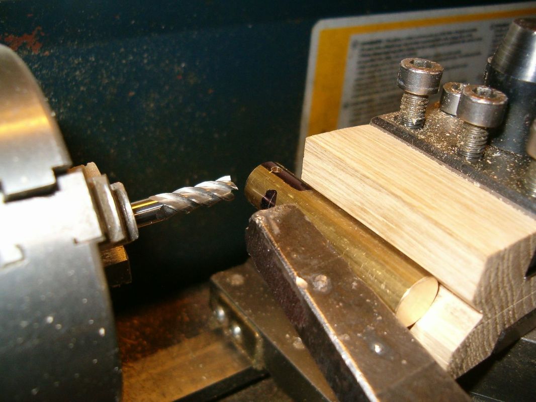 Prodloužení je teď z jednoho kusu, takže odpadají červíky. Na soustruhu jsem vyfrézoval prizmo. Využil jsem tvrdokovovou frézu pro horní frézku na dřevo. Proto je prizmo z tvrdého dřeva. Do něho jsem svěrkou přes nožovku upnul kulatinu. Frézování drážky vyjde pak automaticky přesně do osy. Vyzkoušel jsem i nový frézovací svěrák, ale stejně jsem zbytek dopiloval. Ostatní díly jsou svrtávány společně a struženy. Musí být označena jejich vzájemná poloha, otočit nejdou. Místo malé segerovky (jako u originálu) jsem kolíček zajistil drátěnou závlačkou. Několikrát jsem musel sestavu rozebrat a uvolňovat v místech, kde se díly potkávaly. Takto jsem získal kompaktní kardan bez zbytečných vůlí a ten je v lodi namísto první (koupené a upravené) verze.