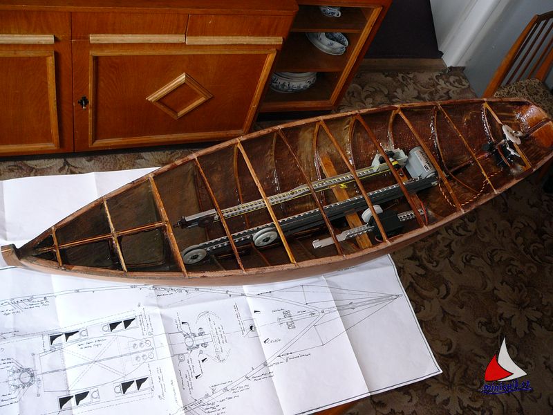 Plováky i trup jsou kvůli dostatečné tuhosti z překližkových žeber o síle 4mm. Obšívka plováků je z borovicové dýhy, kterou jsem u modelu použil poprvé. Trup má kombinovanou obšívku. Rovné části tvoří překližka a oblé dno je ze smrkových lišt o průřezu 3 x 3 mm. Všechny povrchy jsou olaminované. Nosníky k plovákům jsou odpojitelné, tedy oproti předloze nebudou sklopné. Ovládací prvky tvoří dvě serva - pro hlavní a pomocná kormidla v plovácích + servonaviják plachet.