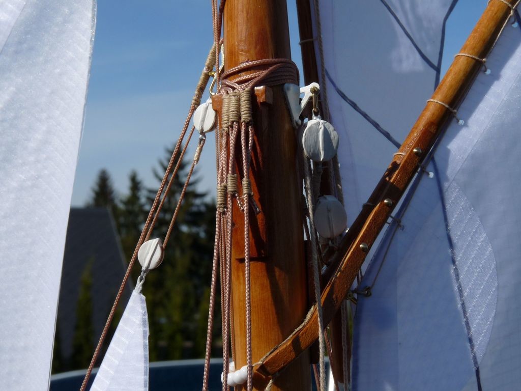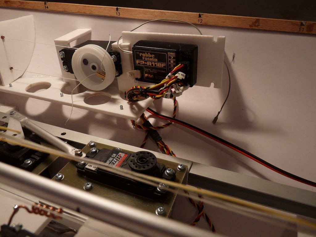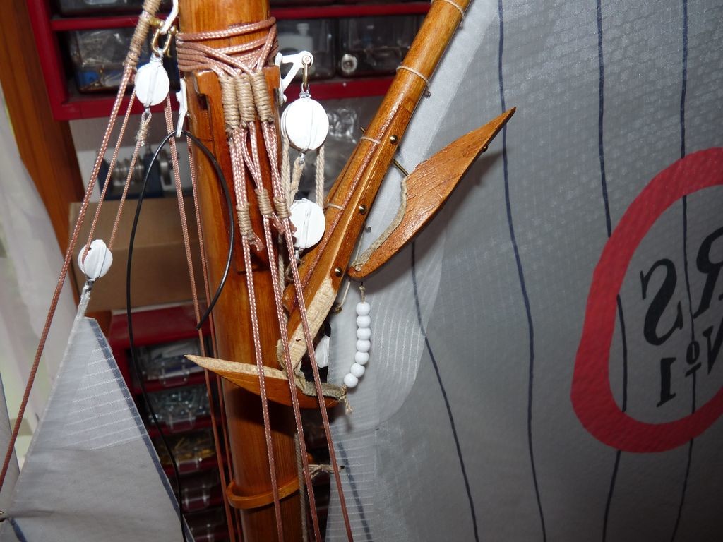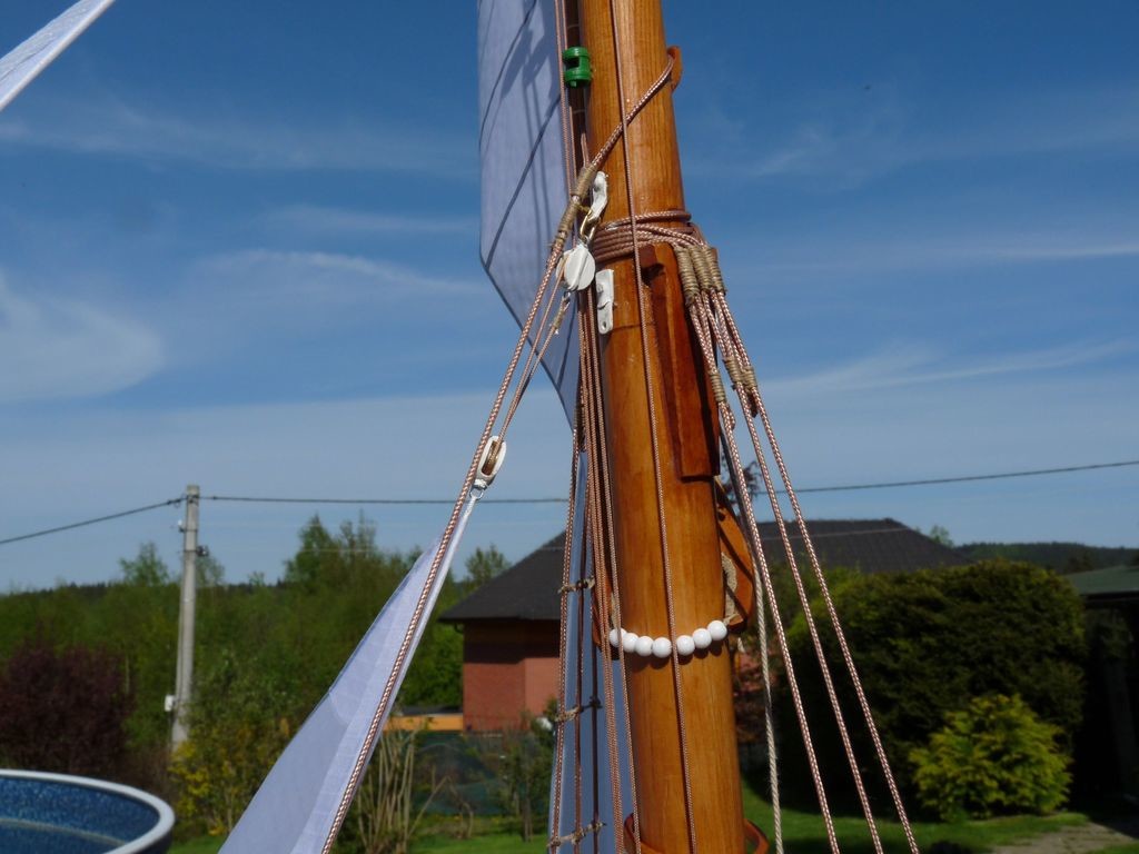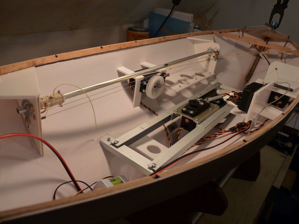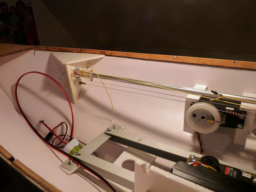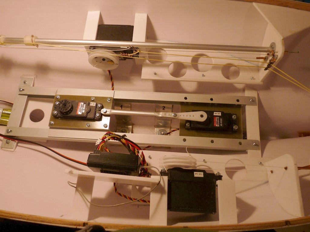 Pro ovládání hlavní plachty jsem použil osvědčený systém vodící tyče, po které naviják přesunuje ovládaný element, zatímco otěž je upevněna k volně pohyblivému elementu. Pokud tedy dojde k přestavení ovládaného elementu (změnou pozice serva) a otěž plachty není v tahu, nic se neděje - volný element zůstane na svém místě, až dokud vítr nepřesune plachty do nové pozice. Tím vytáhne i otěž a volný element se tak dostane na novou pozici - doraz o ovládaný element. Výhodou je, že se v podpalubí nemotají volné otěže. V případě RS01 všechny otěže, ve shodě s originálem, vedou do kokpitu na zádi. Uchycení otěží na hlavní a bezanové plachtě je v poměru 2:1 a tak jsem využil rozpůlení přestavné dráhy otěže bezanové plachty pomocnou kladkou. Ta je realizována v podpalubí kroužkem z rybářského prutu, který jezdí po pomocném lanku (opět prevence zamotání volných otěží).