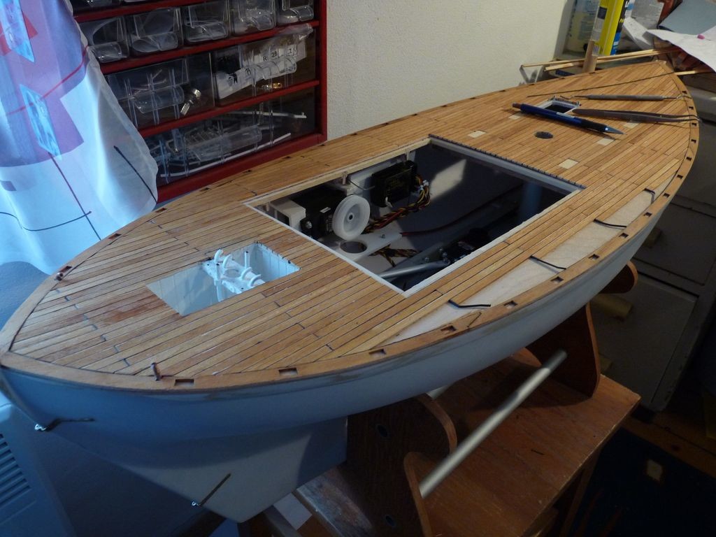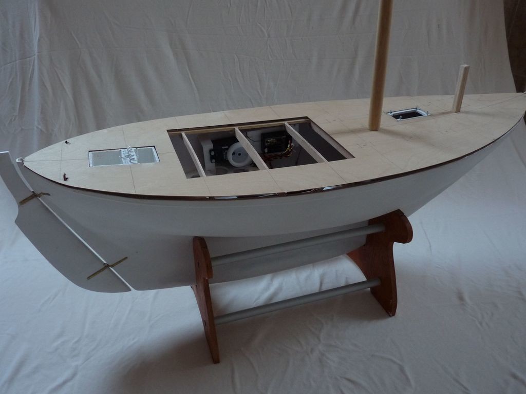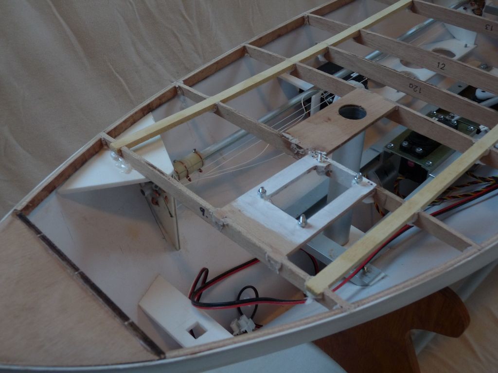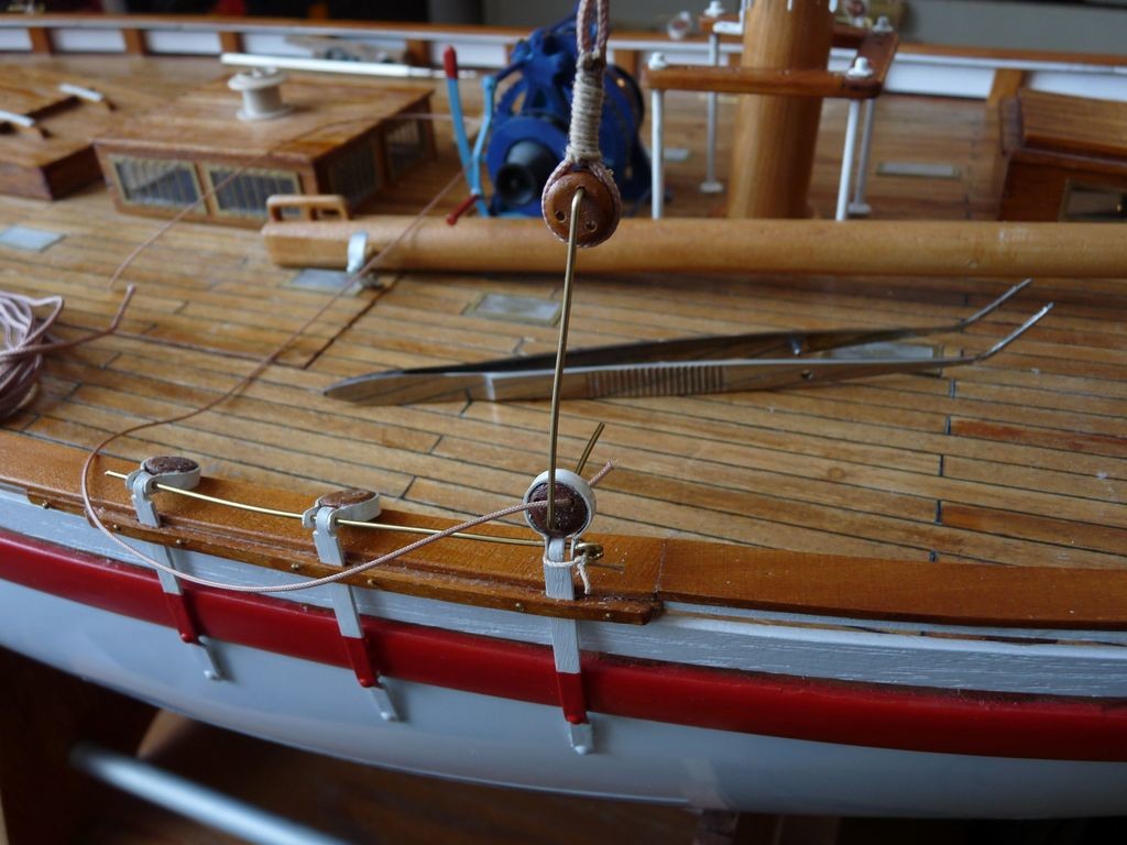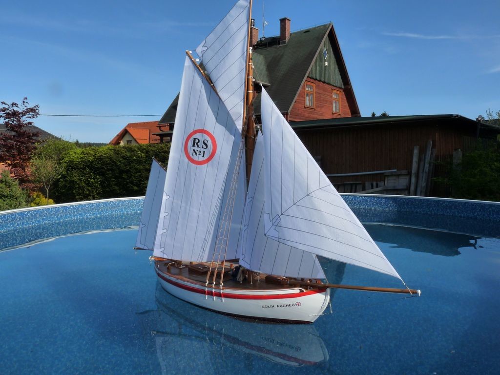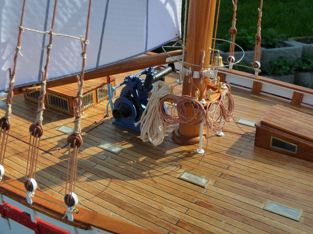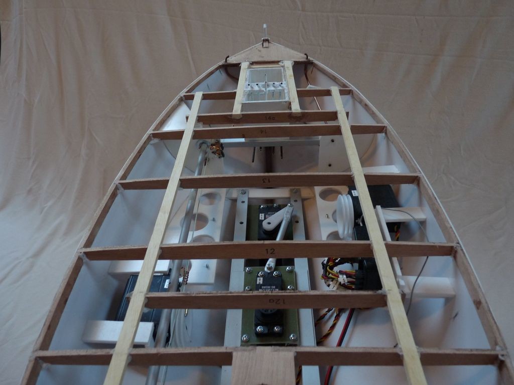 Pro ovládání hlavní plachty jsem použil osvědčený systém vodící tyče, po které naviják přesunuje ovládaný element, zatímco otěž je upevněna k volně pohyblivému elementu. Pokud tedy dojde k přestavení ovládaného elementu (změnou pozice serva) a otěž plachty není v tahu, nic se neděje - volný element zůstane na svém místě, až dokud vítr nepřesune plachty do nové pozice. Tím vytáhne i otěž a volný element se tak dostane na novou pozici - doraz o ovládaný element. Výhodou je, že se v podpalubí nemotají volné otěže. V případě RS01 všechny otěže, ve shodě s originálem, vedou do kokpitu na zádi. Uchycení otěží na hlavní a bezanové plachtě je v poměru 2:1 a tak jsem využil rozpůlení přestavné dráhy otěže bezanové plachty pomocnou kladkou. Ta je realizována v podpalubí kroužkem z rybářského prutu, který jezdí po pomocném lanku (opět prevence zamotání volných otěží).