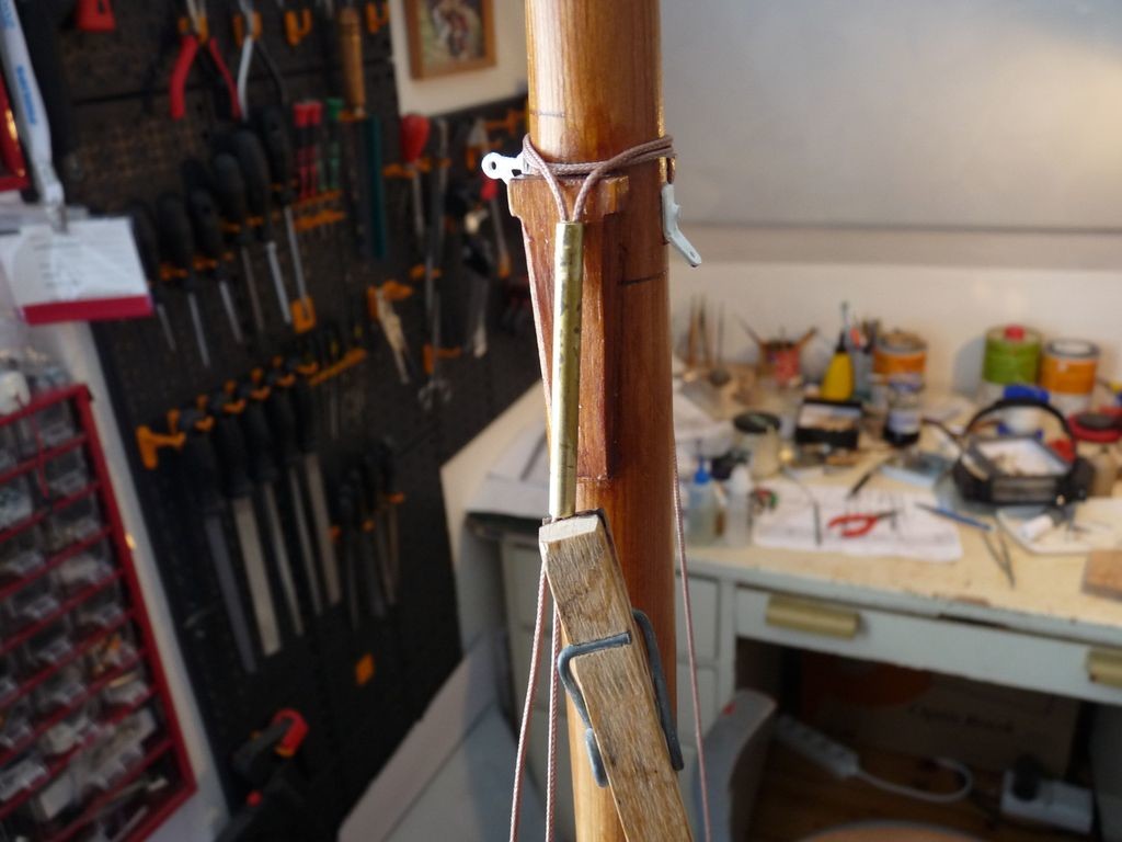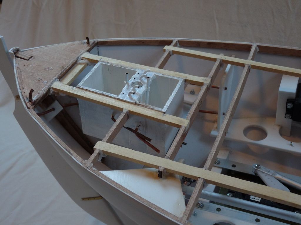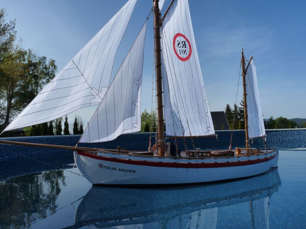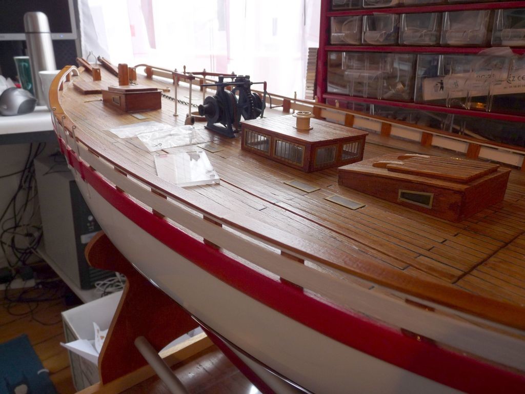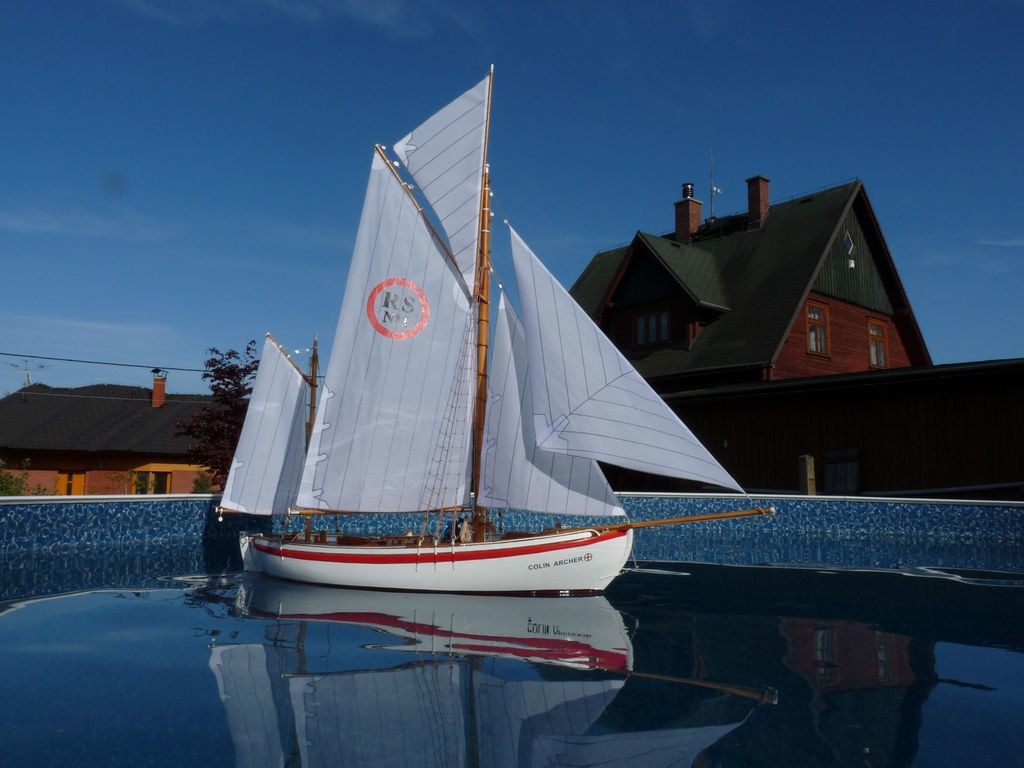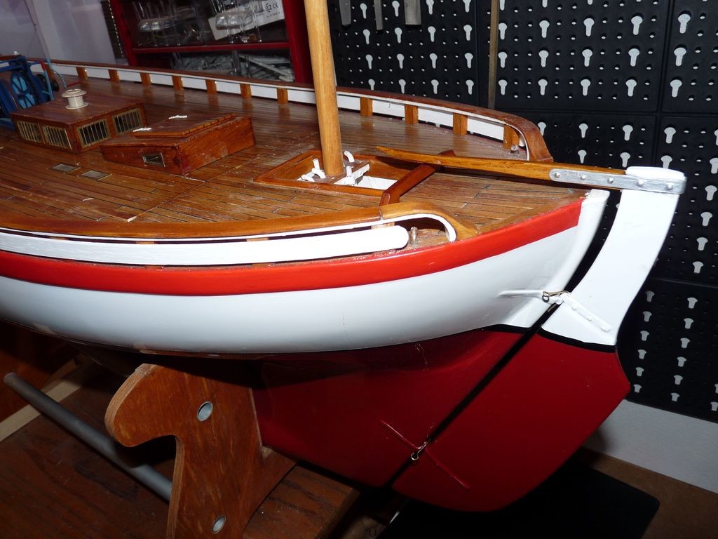 Pro ovládání hlavní plachty jsem použil osvědčený systém vodící tyče, po které naviják přesunuje ovládaný element, zatímco otěž je upevněna k volně pohyblivému elementu. Pokud tedy dojde k přestavení ovládaného elementu (změnou pozice serva) a otěž plachty není v tahu, nic se neděje - volný element zůstane na svém místě, až dokud vítr nepřesune plachty do nové pozice. Tím vytáhne i otěž a volný element se tak dostane na novou pozici - doraz o ovládaný element. Výhodou je, že se v podpalubí nemotají volné otěže. V případě RS01 všechny otěže, ve shodě s originálem, vedou do kokpitu na zádi. Uchycení otěží na hlavní a bezanové plachtě je v poměru 2:1 a tak jsem využil rozpůlení přestavné dráhy otěže bezanové plachty pomocnou kladkou. Ta je realizována v podpalubí kroužkem z rybářského prutu, který jezdí po pomocném lanku (opět prevence zamotání volných otěží).