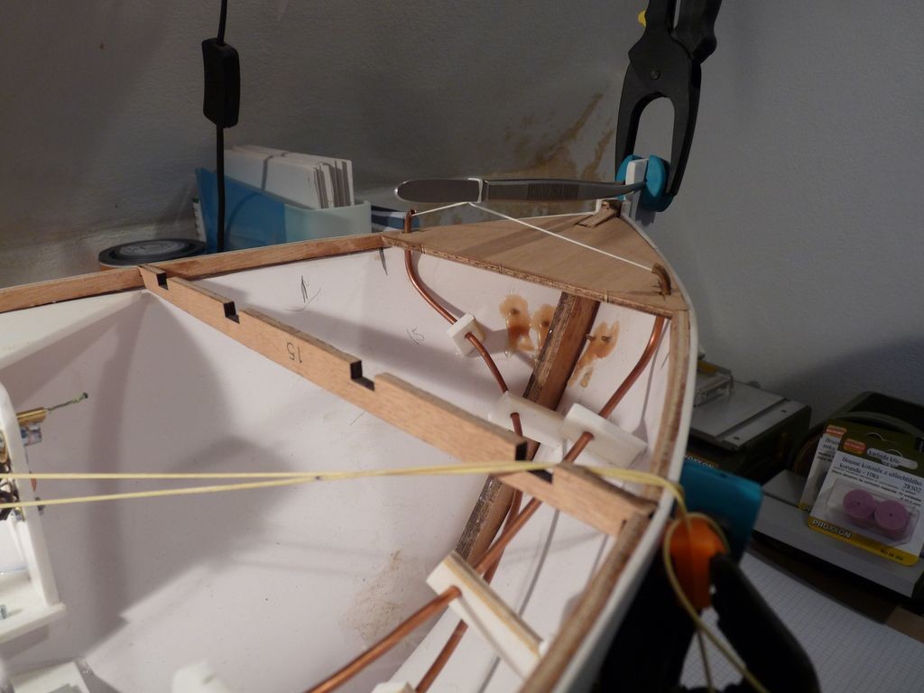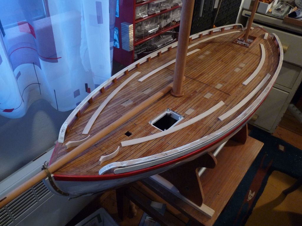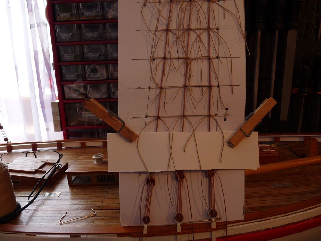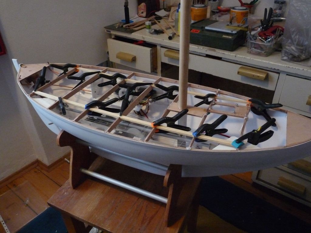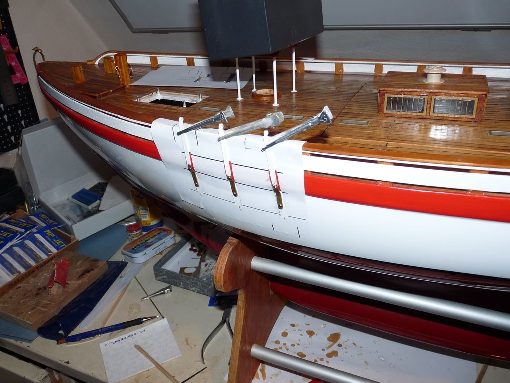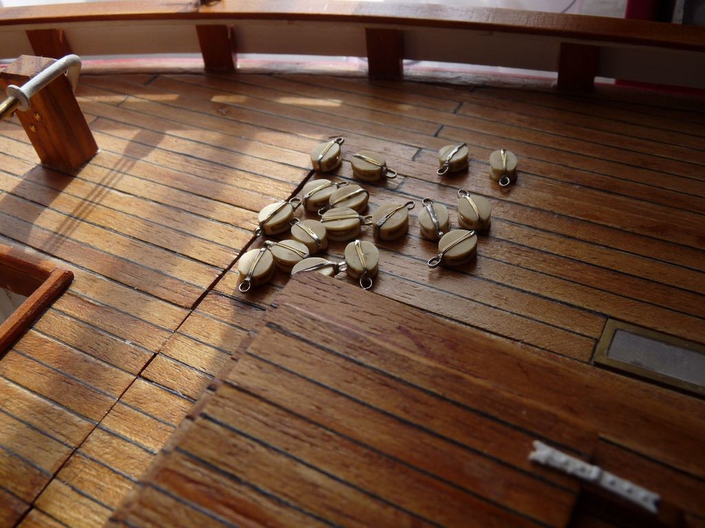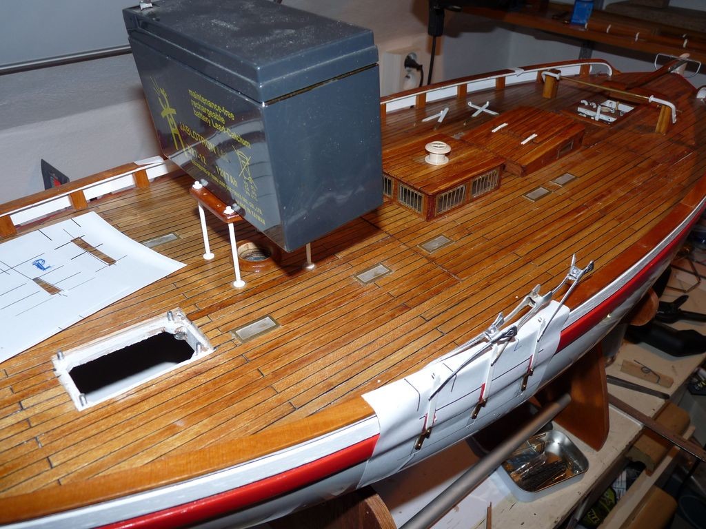 Pro ovládání hlavní plachty jsem použil osvědčený systém vodící tyče, po které naviják přesunuje ovládaný element, zatímco otěž je upevněna k volně pohyblivému elementu. Pokud tedy dojde k přestavení ovládaného elementu (změnou pozice serva) a otěž plachty není v tahu, nic se neděje - volný element zůstane na svém místě, až dokud vítr nepřesune plachty do nové pozice. Tím vytáhne i otěž a volný element se tak dostane na novou pozici - doraz o ovládaný element. Výhodou je, že se v podpalubí nemotají volné otěže. V případě RS01 všechny otěže, ve shodě s originálem, vedou do kokpitu na zádi. Uchycení otěží na hlavní a bezanové plachtě je v poměru 2:1 a tak jsem využil rozpůlení přestavné dráhy otěže bezanové plachty pomocnou kladkou. Ta je realizována v podpalubí kroužkem z rybářského prutu, který jezdí po pomocném lanku (opět prevence zamotání volných otěží).