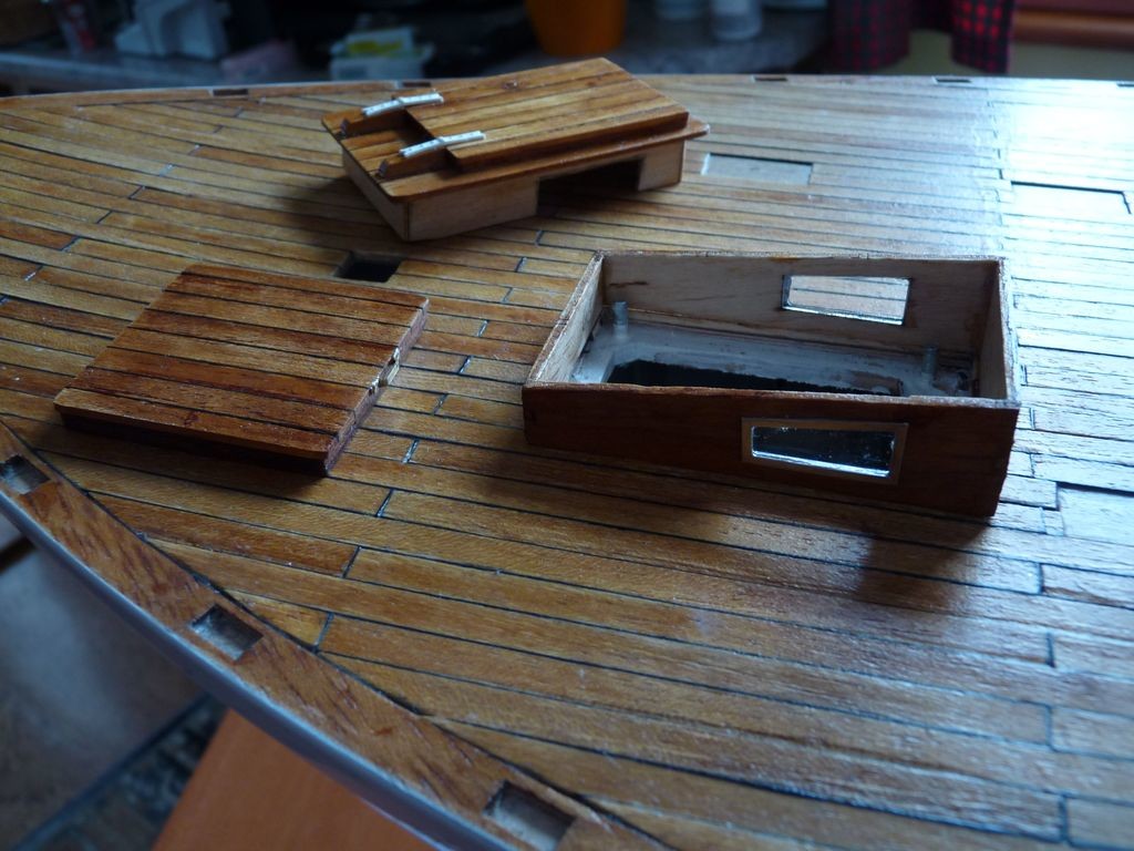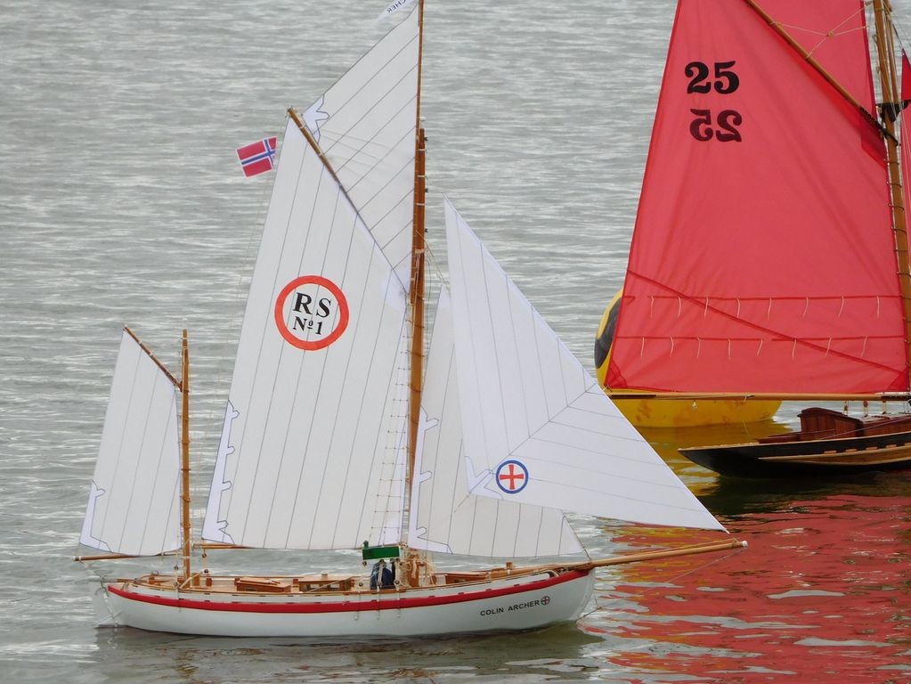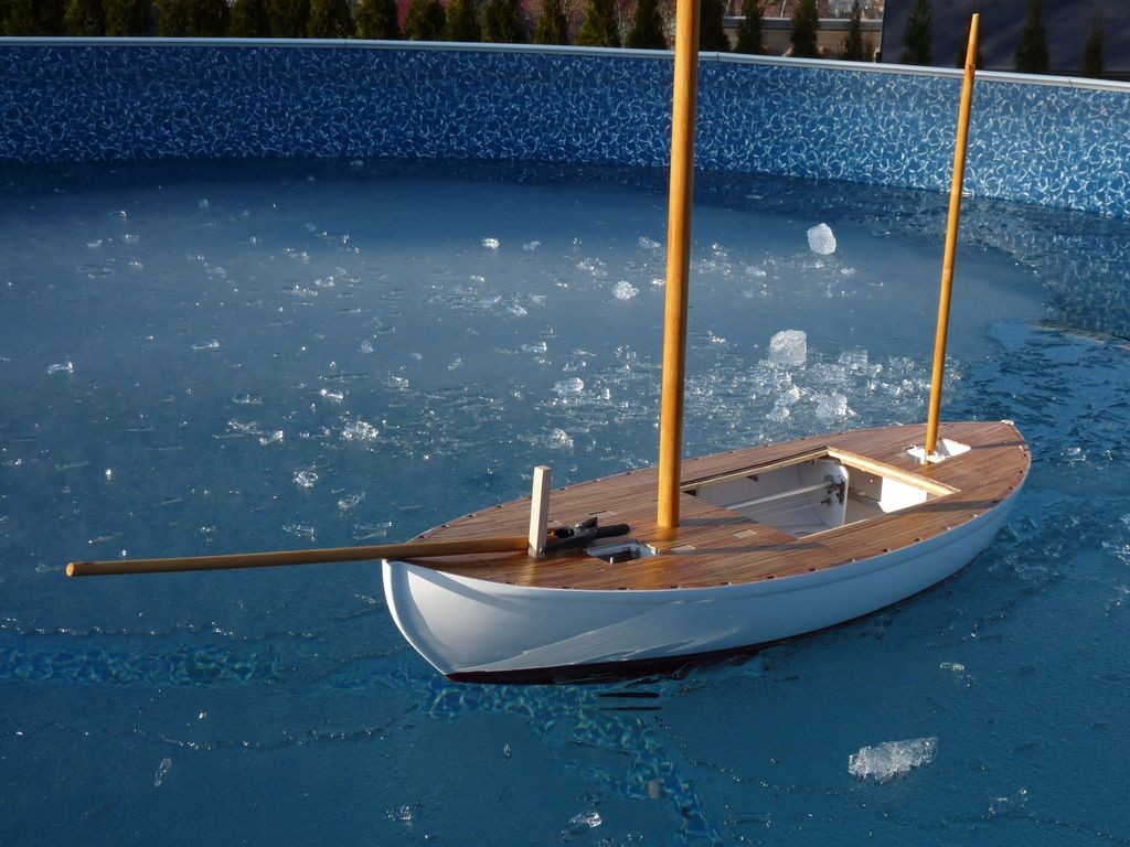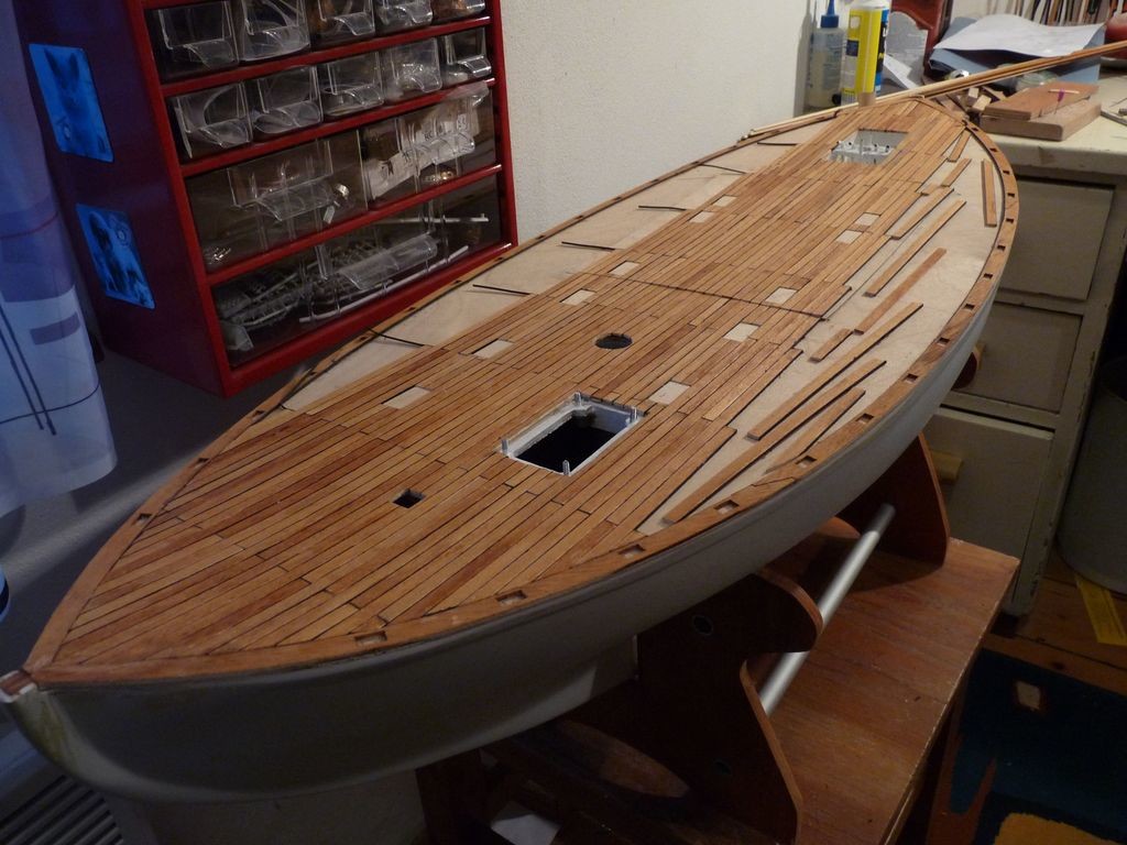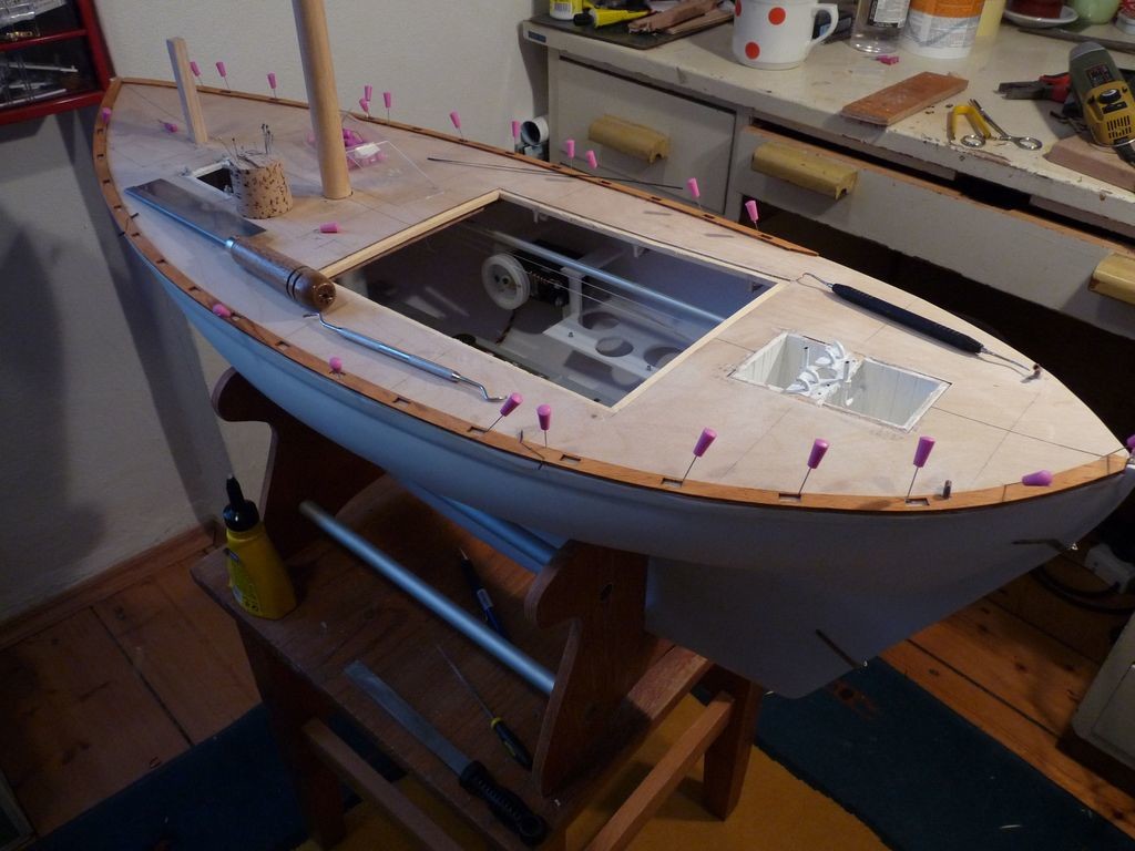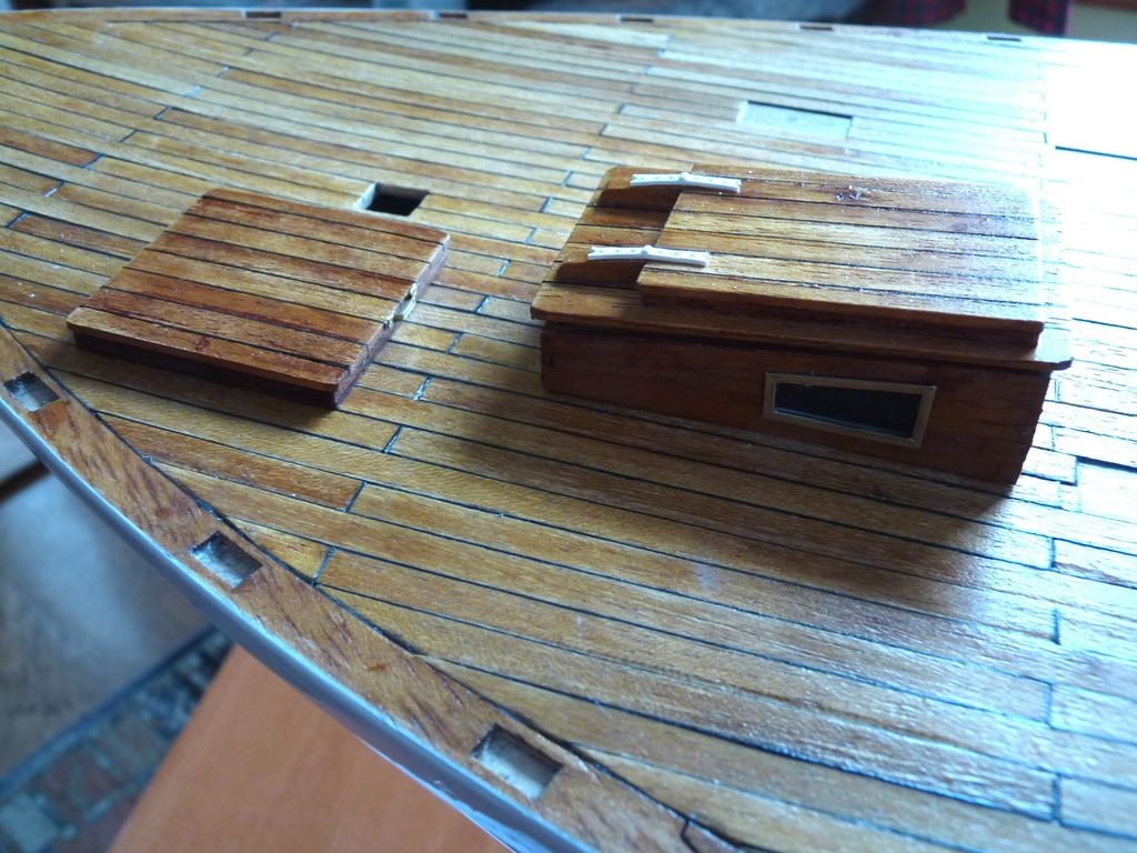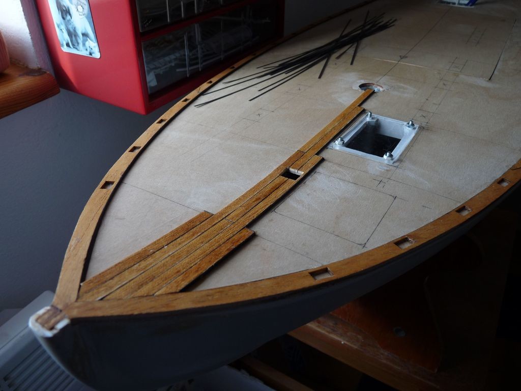 Pro ovládání hlavní plachty jsem použil osvědčený systém vodící tyče, po které naviják přesunuje ovládaný element, zatímco otěž je upevněna k volně pohyblivému elementu. Pokud tedy dojde k přestavení ovládaného elementu (změnou pozice serva) a otěž plachty není v tahu, nic se neděje - volný element zůstane na svém místě, až dokud vítr nepřesune plachty do nové pozice. Tím vytáhne i otěž a volný element se tak dostane na novou pozici - doraz o ovládaný element. Výhodou je, že se v podpalubí nemotají volné otěže. V případě RS01 všechny otěže, ve shodě s originálem, vedou do kokpitu na zádi. Uchycení otěží na hlavní a bezanové plachtě je v poměru 2:1 a tak jsem využil rozpůlení přestavné dráhy otěže bezanové plachty pomocnou kladkou. Ta je realizována v podpalubí kroužkem z rybářského prutu, který jezdí po pomocném lanku (opět prevence zamotání volných otěží).