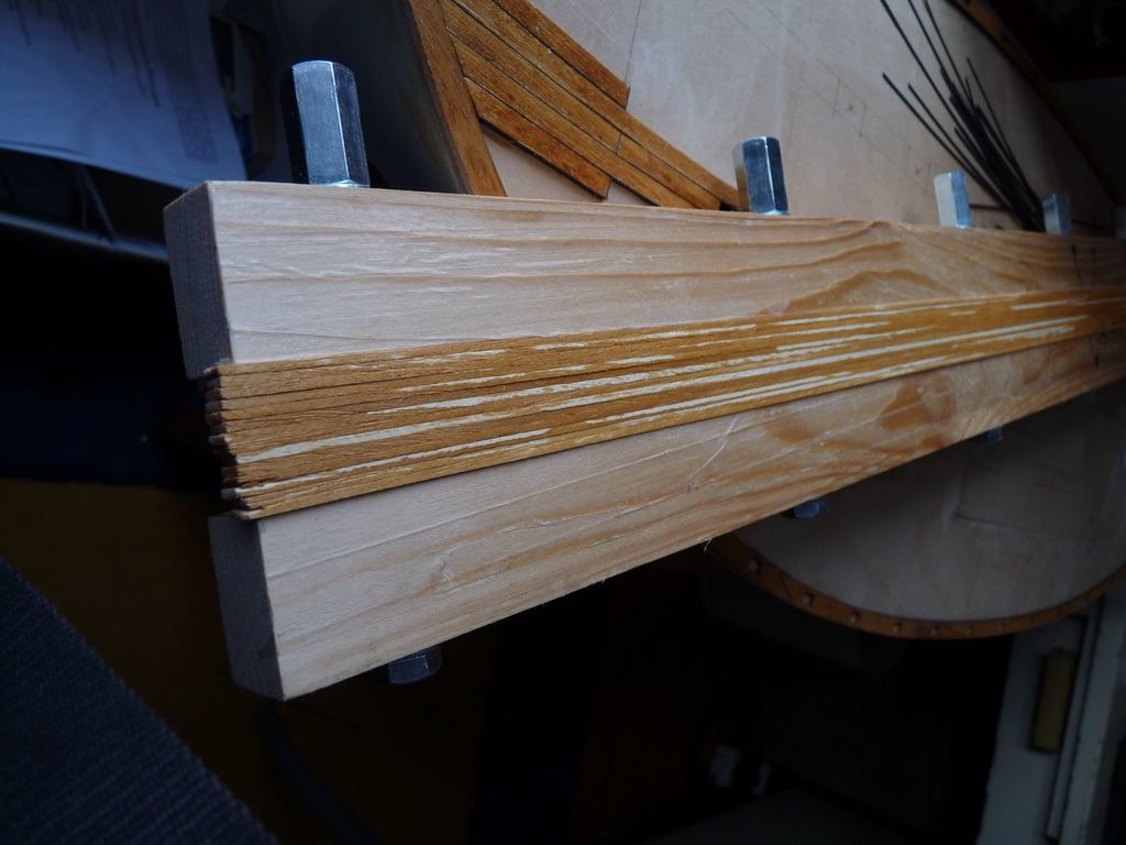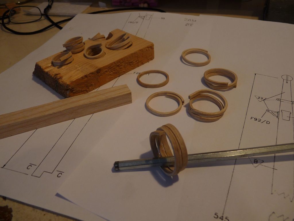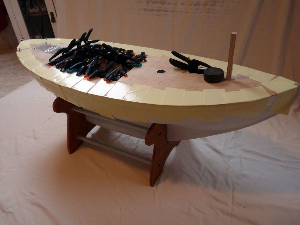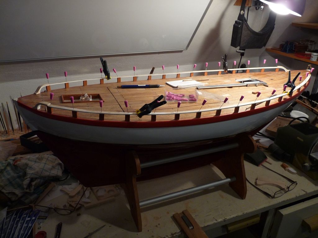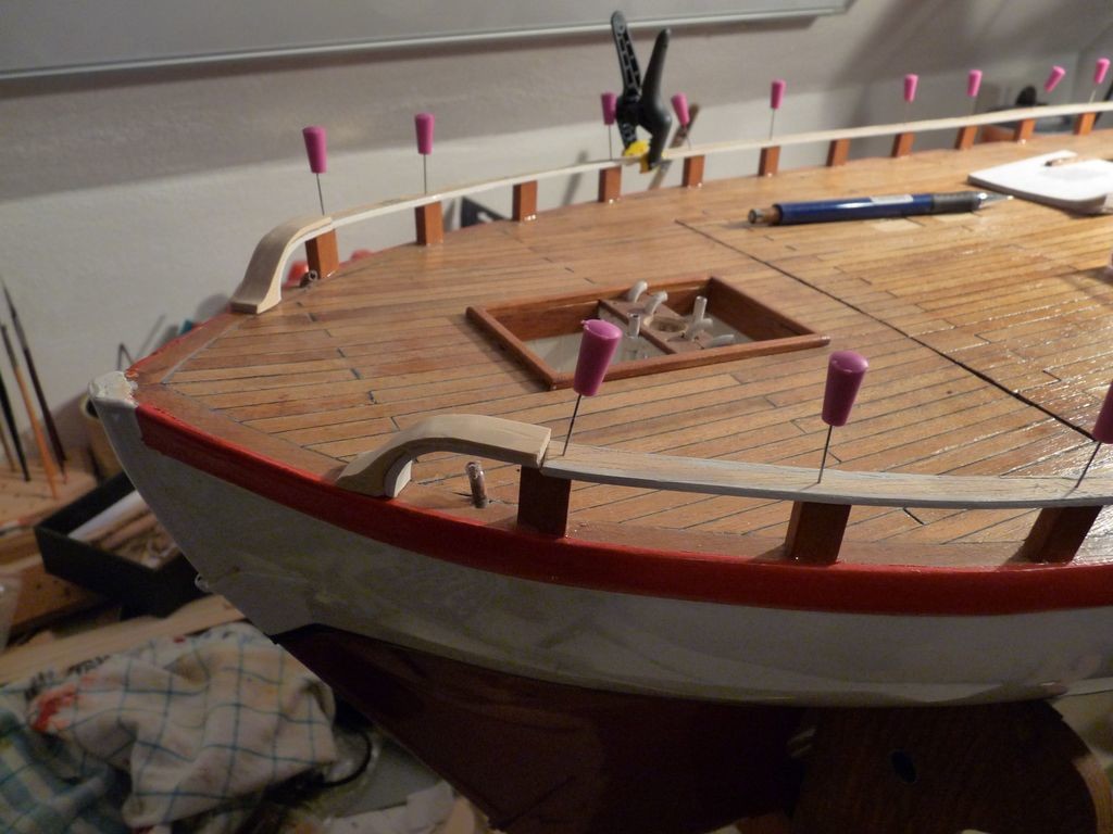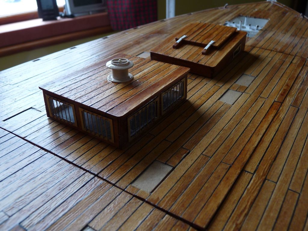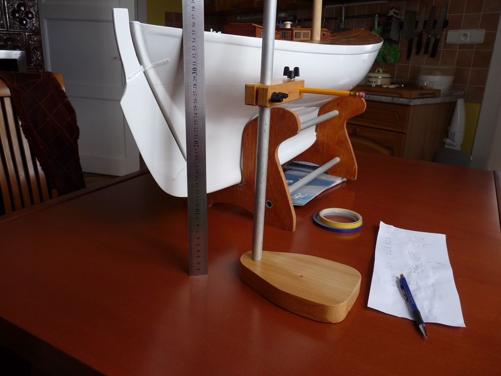Pro ovládání hlavní plachty jsem použil osvědčený systém vodící tyče, po které naviják přesunuje ovládaný element, zatímco otěž je upevněna k volně pohyblivému elementu. Pokud tedy dojde k přestavení ovládaného elementu (změnou pozice serva) a otěž plachty není v tahu, nic se neděje - volný element zůstane na svém místě, až dokud vítr nepřesune plachty do nové pozice. Tím vytáhne i otěž a volný element se tak dostane na novou pozici - doraz o ovládaný element. Výhodou je, že se v podpalubí nemotají volné otěže. V případě RS01 všechny otěže, ve shodě s originálem, vedou do kokpitu na zádi. Uchycení otěží na hlavní a bezanové plachtě je v poměru 2:1 a tak jsem využil rozpůlení přestavné dráhy otěže bezanové plachty pomocnou kladkou. Ta je realizována v podpalubí kroužkem z rybářského prutu, který jezdí po pomocném lanku (opět prevence zamotání volných otěží).