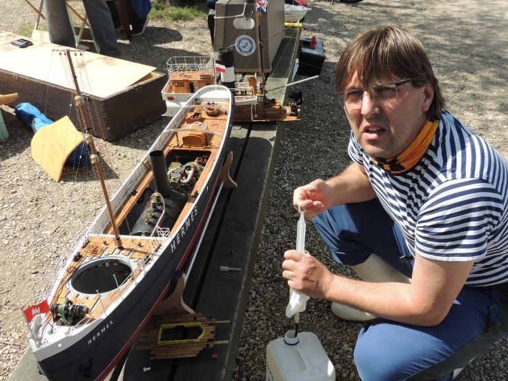 Michal přivezl místo Mariquity svůj nový parník Hermes, postavený ve špičkové kvalitě. Jel s ním několik jízd a byl velmi spokojený se stabilitou i jízdními vlastnostmi. Zažil však dva horké okamžiky na vodě. První, když od protějšího břehu, kde bláznili hasiči na dvou rychlých motorových člunech, přiběhla série velkých vln (20-30 cm). Michal, jako zkušený kormidelník, postavil loď přídí proti vlnám a Hermes je s několikerým velkým zahoupáním bravurně zvládl. Pak ale rychle ke břehu na kontrolu. Kvůli přístupu vzduchu pro hořák, mají totiž nástavby otevřené dveře a také větrací dekly nad strojovnou. Loď měla hodně vody na palubě a nějaká se dostala i dovnitř.