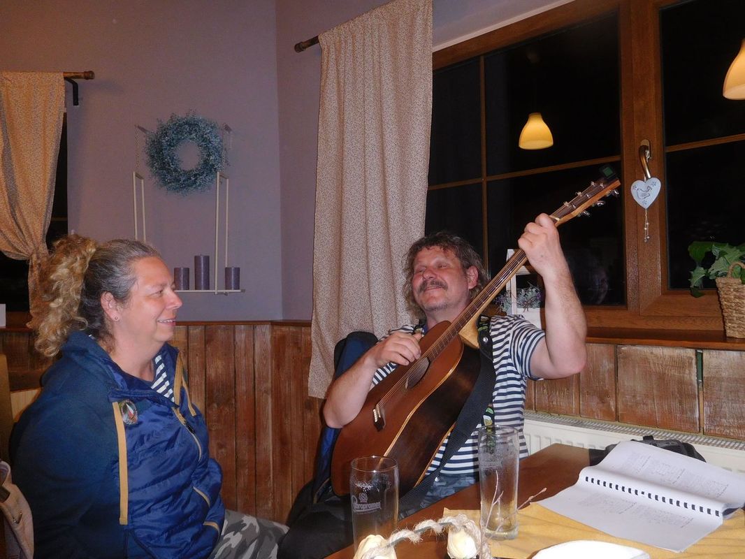 A protože bylo počasí mizerné, a béčkaři už třetí jízdu nejeli, tak Rosťa Dyba vzal kytaru, domluvil stůl v restauraci Na jihu, a celý večer hrál a zpíval. Pár se nás tam sešlo a zazpívali jsme si s ním.