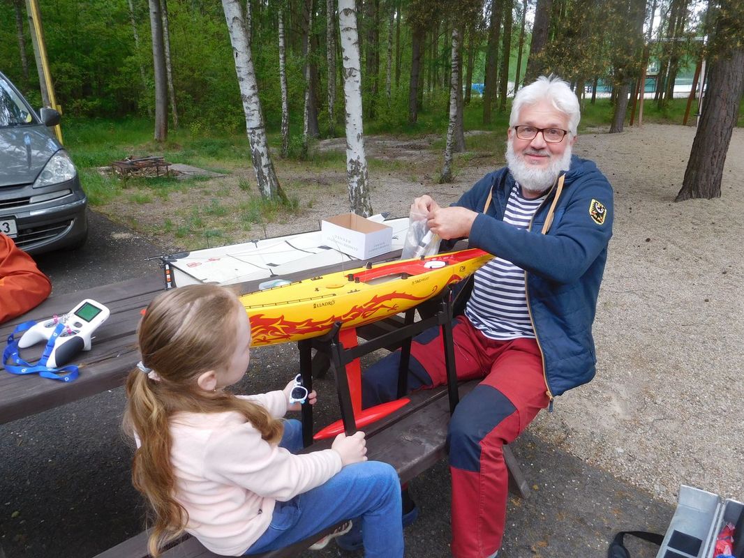 Po jedenácté hodině začaly jízdy kat. A a C na obou tratích. Jestliže jsme si ve čtvrtek libovali, jaké je pěkné počasí, tak v pátek bohužel zesílil vítr, což mnoha modelům nevyhovovalo. Hned v první jízdě seniorů kat. A zalila voda novou loď Petry Kotlárové. Přestože Péťa volala o pomoc, loď šla pod hladinu tak rychle, že nikdo nestihl zareagovat. Podobná situace byla i na druhé trati při první jízdě kat. C, kdy Milan Kroupa duchapřítomně pro svou topící se Berbici skočil do vody a stihnul ji vytáhnout. Další úplné topení modelů se už naštěstí nekonalo, ale technické problémy kvůli velkému větru se mnohým závodníkům v průběhu všech jízd nevyhnuly a někteří už potom své lodě na vodu dát nemohli.