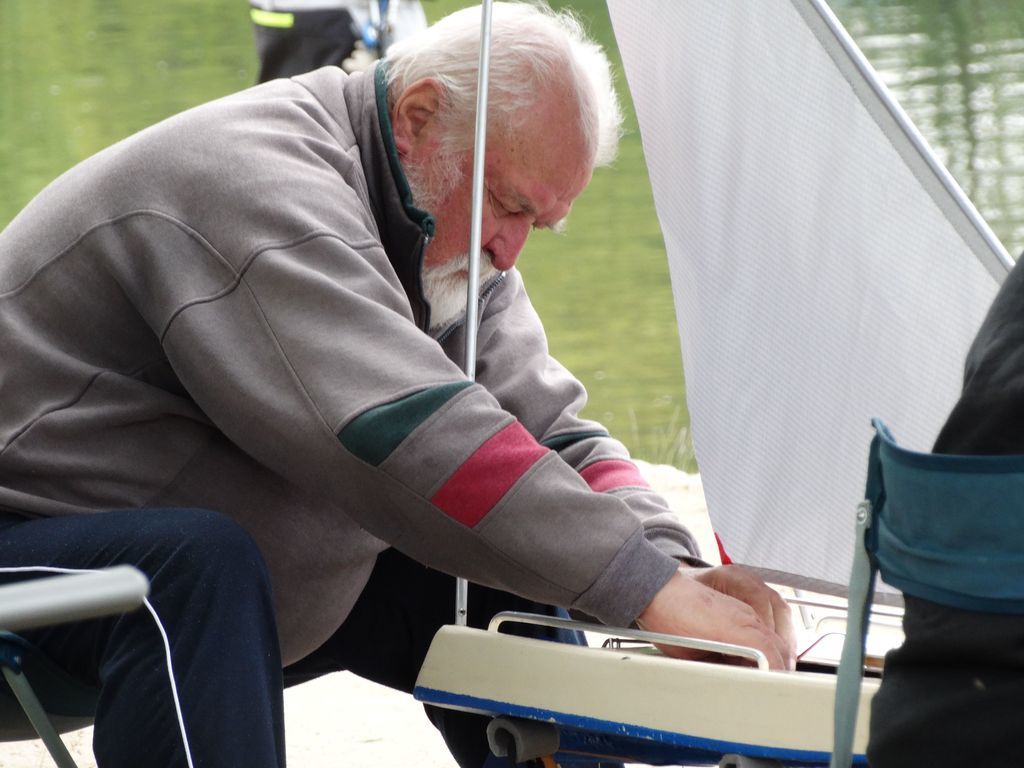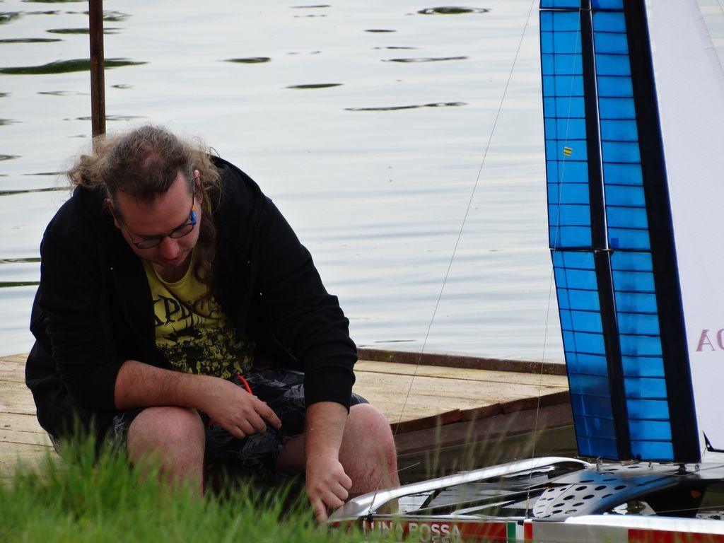 V sobotu se výrazně změnilo počasí, vítr se dopoledne změnil na mírný do 2 m/s až po žádný v odpoledních hodinách. Teplota také spadla o minimálně 5 stupňů. Dopoledne bylo zpestřeno natáčením TV, ale i tak jsme se drželi časového rozpisu až do druhé jízdy NSS-A, kterou jsme museli kvůli nedodržení časového limitu na první kolo zrušit. Vzhledem k tomu, že se blížil i déšť svezli jsme většinu modelů ke břehu člunem. Odpoledne pak bylo ve znamení nalézt okno s alespoň nějakým větrem a alespoň mírnějším deštěm pro odjetí dalších jízd, hlavně NSS-A, kteří měli jen jednu a Petra po opravě utopené plachetnice ani tu jednu. Snažil jsem se tedy udržet závodníky NSS-A u vody, i když to v NSS-B vypadalo na zrušení třetí jízdy, protože zájem jet měli jen dva polští závodníci, a to bylo dle pravidel málo. U NSS-A jsme nakonec dvě jízdy odjeli, i za cenu ukončení jízd až před sedmou hodinou večer. Na druhém startovišti, NSS-D a NSS-A junioři, jim Petr moc úlev nenechal a jezdili i za deště a přecházející přeháňky, kdy se v jedné jízdě výrazně měnily podmínky. Časově vyjádřeno až takovým rozdílem, že první kolo za 2,5 minuty, třetí za 35 minut.