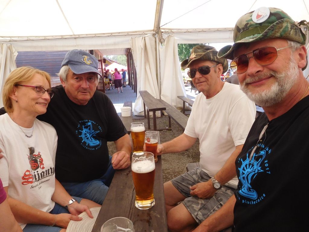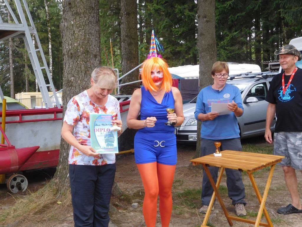 Sobota byla chladnější, bez sluníčka a opět bez větru. Tedy aspoň v době, kdy jsme jeli naše tři jízdy. A protože po ukončení poslední jízdy začalo „dýchat“, rozhodli se někteří, že pojedou s loděmi na hráz na pivo a zpátky. Mezitím Irenka spočítala výsledky jízd, takže v sobotu odpoledne proběhlo vyhlášení výsledků, které nám zpestřila Hanka v převleku. Povedlo se jí i vylepšit Zdendu, protože mu namalovala úplně neodolatelný knír 😊.