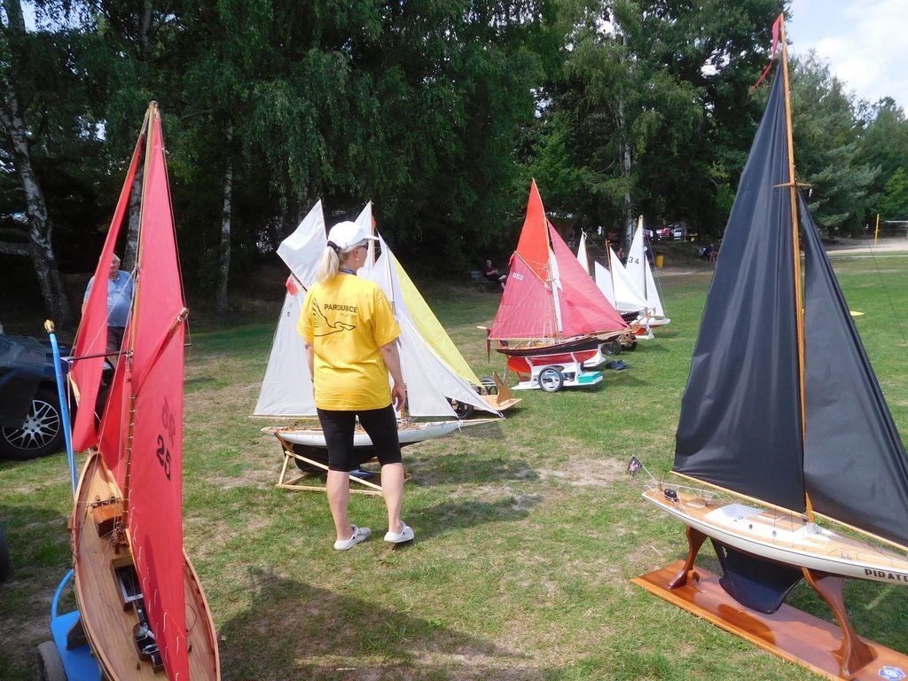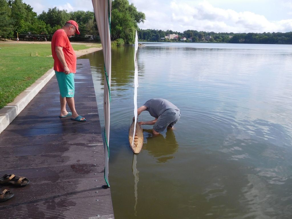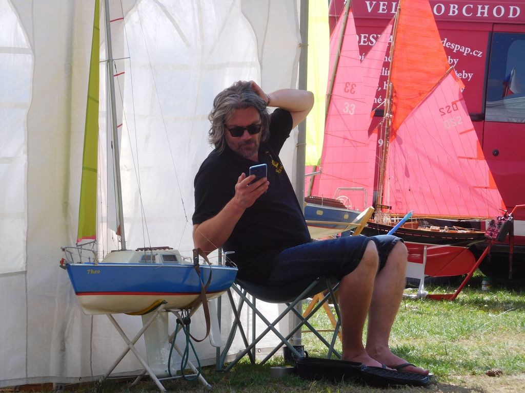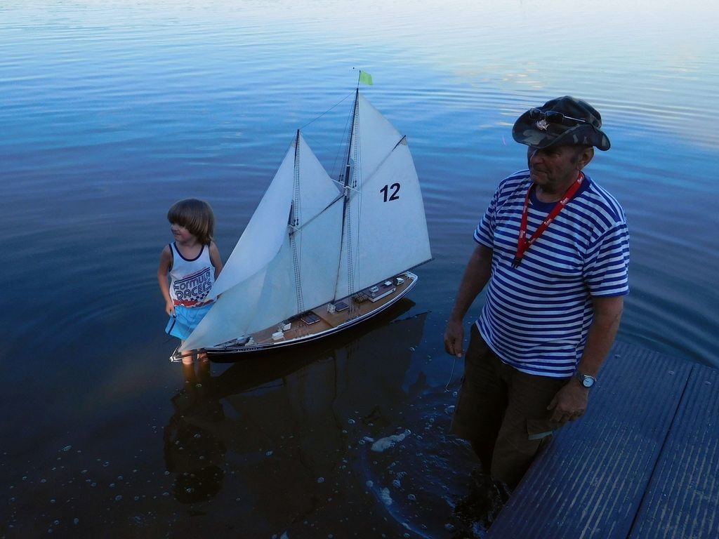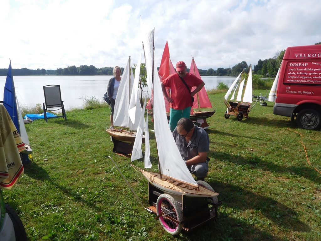 Na setkání z velké dálky přijel náš nový kamarád Rosťa Dyba s manželkou. Přivezli ukázat své dvě „čerstvé lodě“ a samozřejmě se zapojili do soutěžních jízd. Rosťa je celoživotní modelář (doposud hlavně letecký) a do stavby modelů lodí vtáhl i svou ženu Andrejku. Rosťa jezdil s lodí Shamrock III a Andrejka s další variantou oblíbené předlohy - lodi Machichaco. Modely vznikly nebývale rychle, ale podle Rosti je to právě tím, že na nich pracují „čtyřručně“. Modely byly řádně Standou proměřeny a provedeno bylo i základní „školení“ o pravidlech přednosti v jízdě během soutěžní regaty. A hned poté rovnou na vodu… Školení bylo zřejmě kvalitní, protože Rosťa byl celkově čtvrtý a v nedělní regatě dokonce druhý!