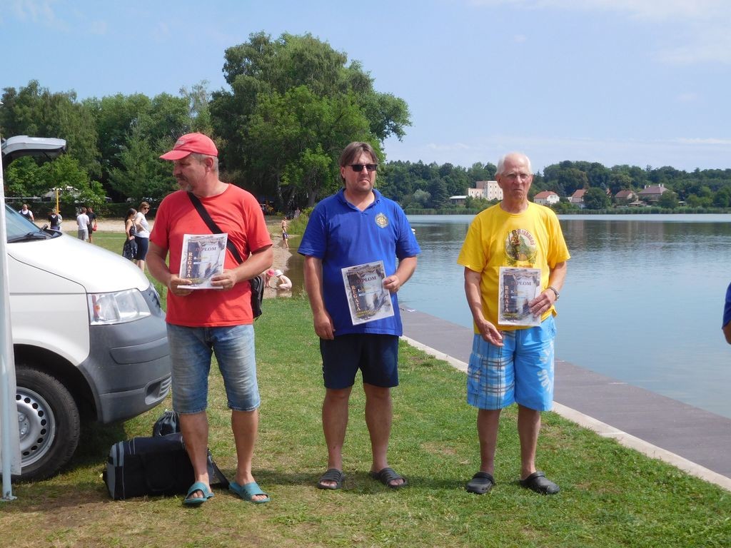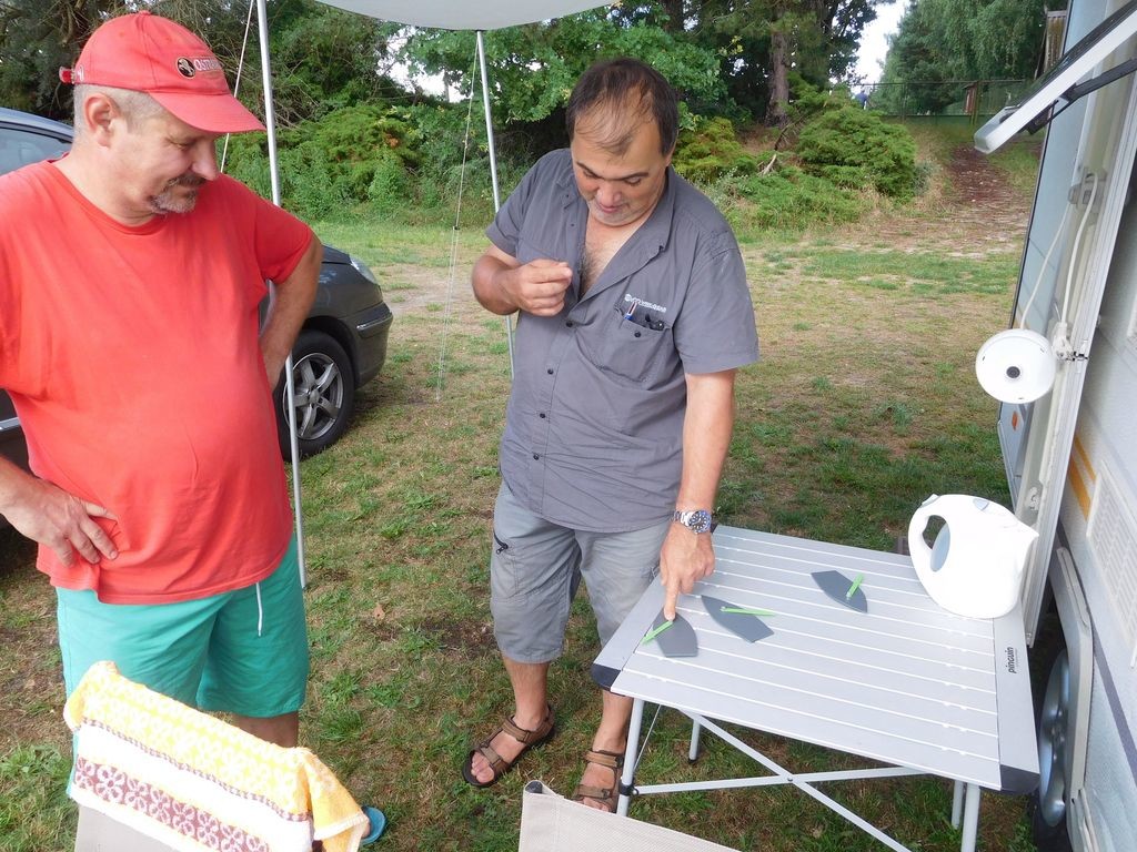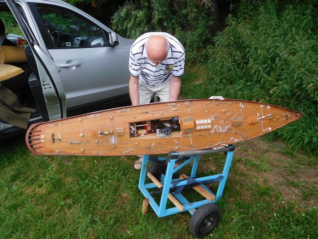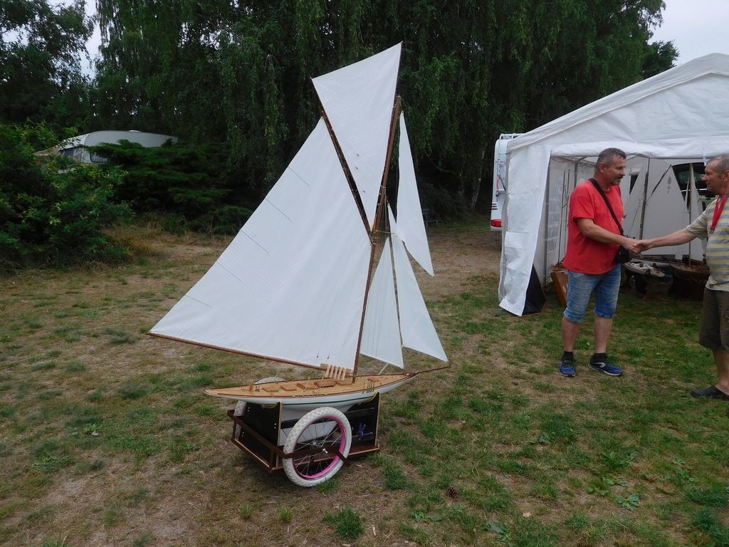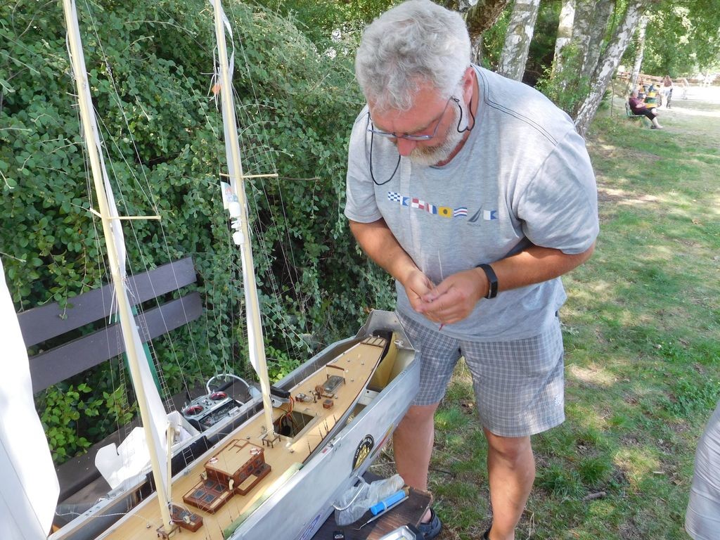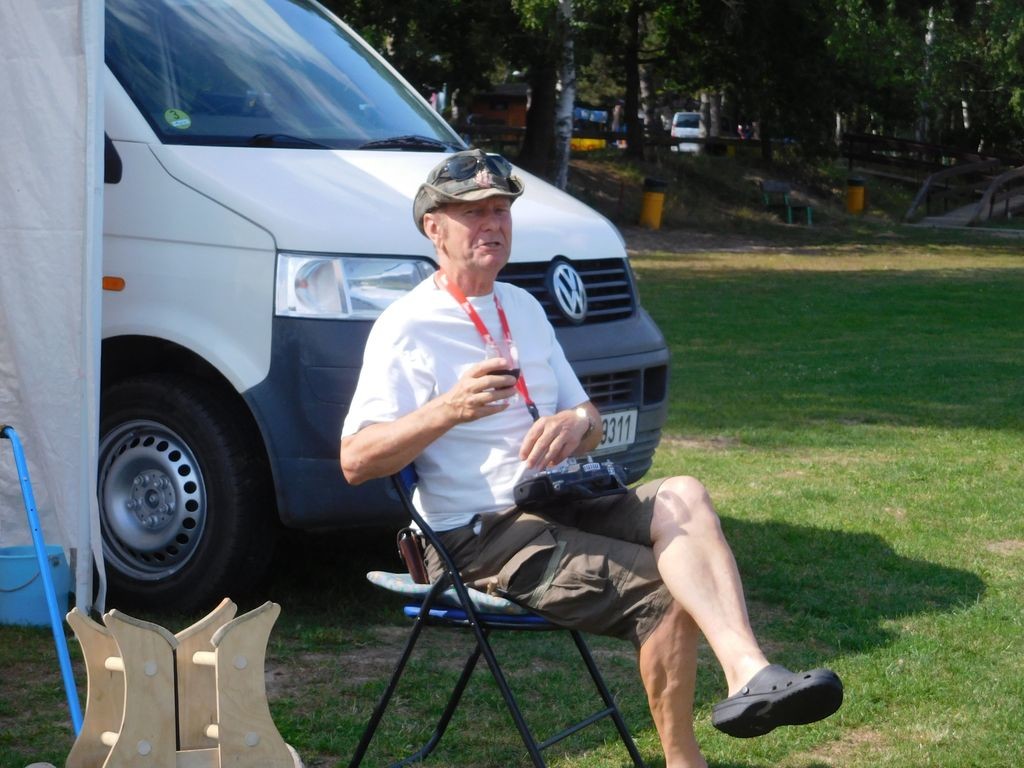 Na setkání z velké dálky přijel náš nový kamarád Rosťa Dyba s manželkou. Přivezli ukázat své dvě „čerstvé lodě“ a samozřejmě se zapojili do soutěžních jízd. Rosťa je celoživotní modelář (doposud hlavně letecký) a do stavby modelů lodí vtáhl i svou ženu Andrejku. Rosťa jezdil s lodí Shamrock III a Andrejka s další variantou oblíbené předlohy - lodi Machichaco. Modely vznikly nebývale rychle, ale podle Rosti je to právě tím, že na nich pracují „čtyřručně“. Modely byly řádně Standou proměřeny a provedeno bylo i základní „školení“ o pravidlech přednosti v jízdě během soutěžní regaty. A hned poté rovnou na vodu… Školení bylo zřejmě kvalitní, protože Rosťa byl celkově čtvrtý a v nedělní regatě dokonce druhý!