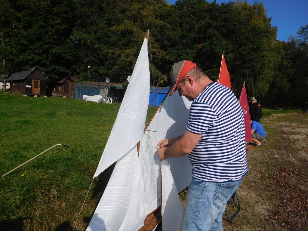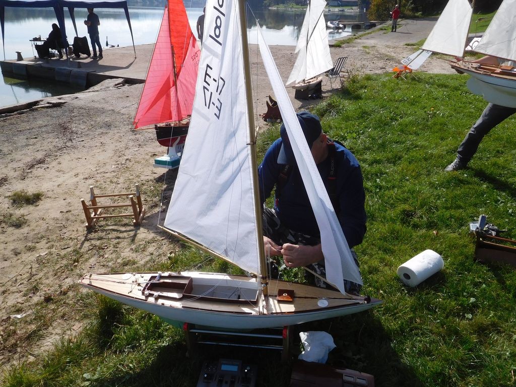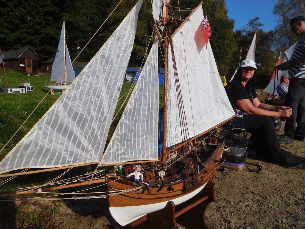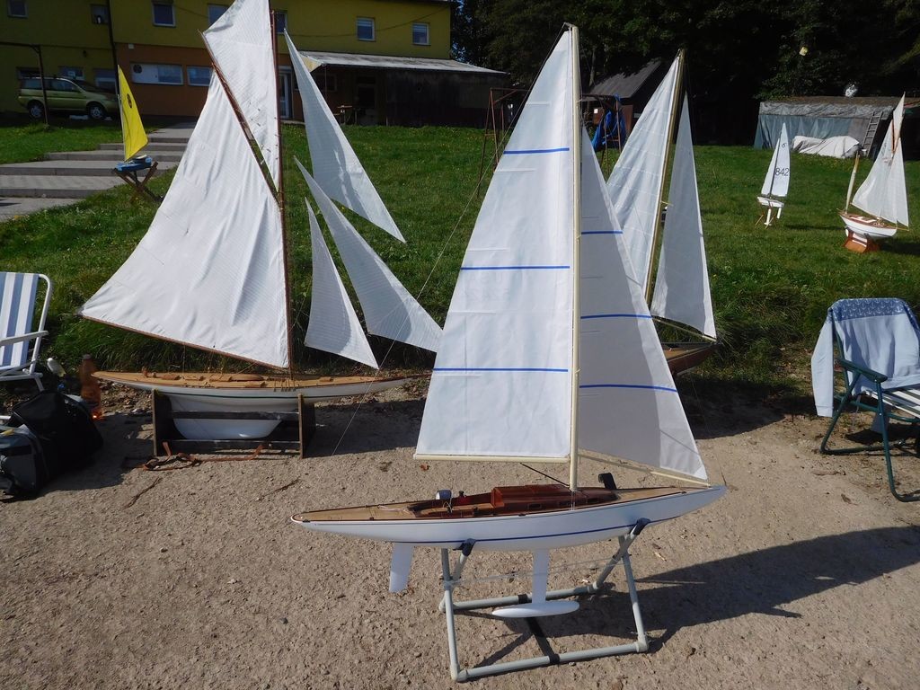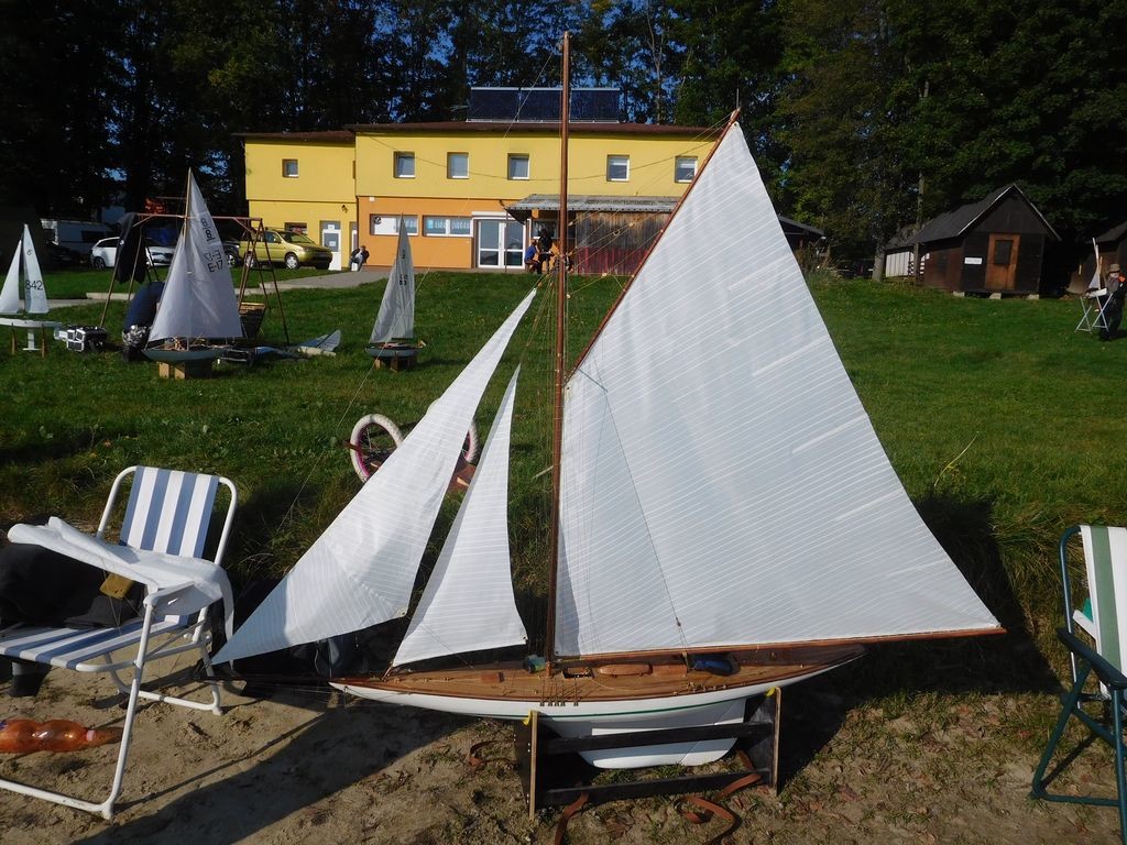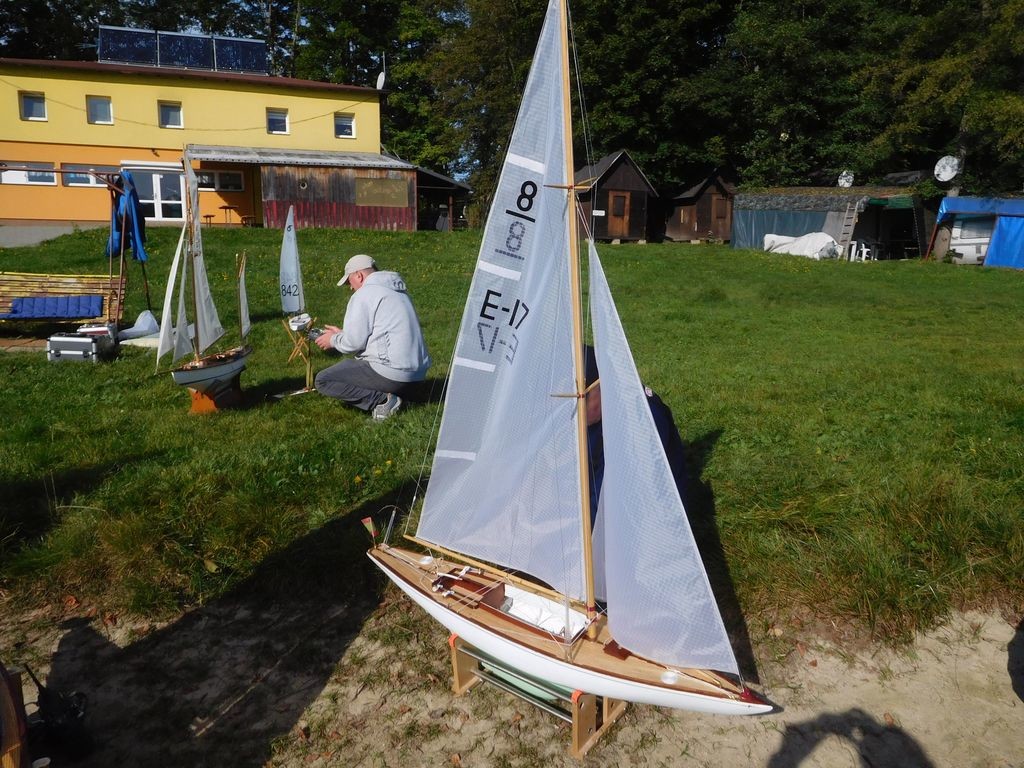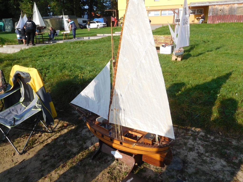 Ráno zavládlo krásné, leč bezvětrné počasí. Začali se sjíždět ostatní účastníci. Na stojáncích u vody se objevily nové lodě: Plachetnice Michala Daranowského Le Gorfou: Bílý laminátový trup doplněný kajutou z mahagonu a vypracovanými detaily z kovu. Zajímavě bylo vyřešeno rozdělené maketové a funkční kormidlo. Jestli bude jako poslední vylovena potápěči, tak bude muset absolvovat větší opravu. Myslím, že se zapomíná na stavební pravidlo: Minimální povolená tloušťka přídavného kýlu či protažené části laterálu je 0,05 maximální šířky lodního trupu. Takových plachetnic se provozuje více.