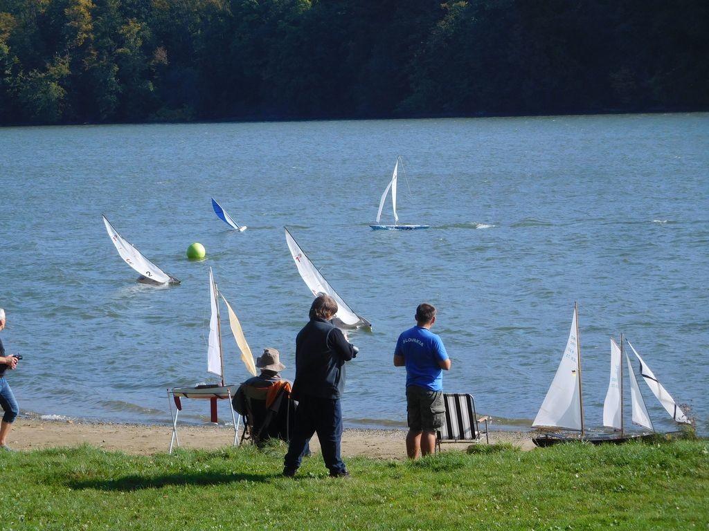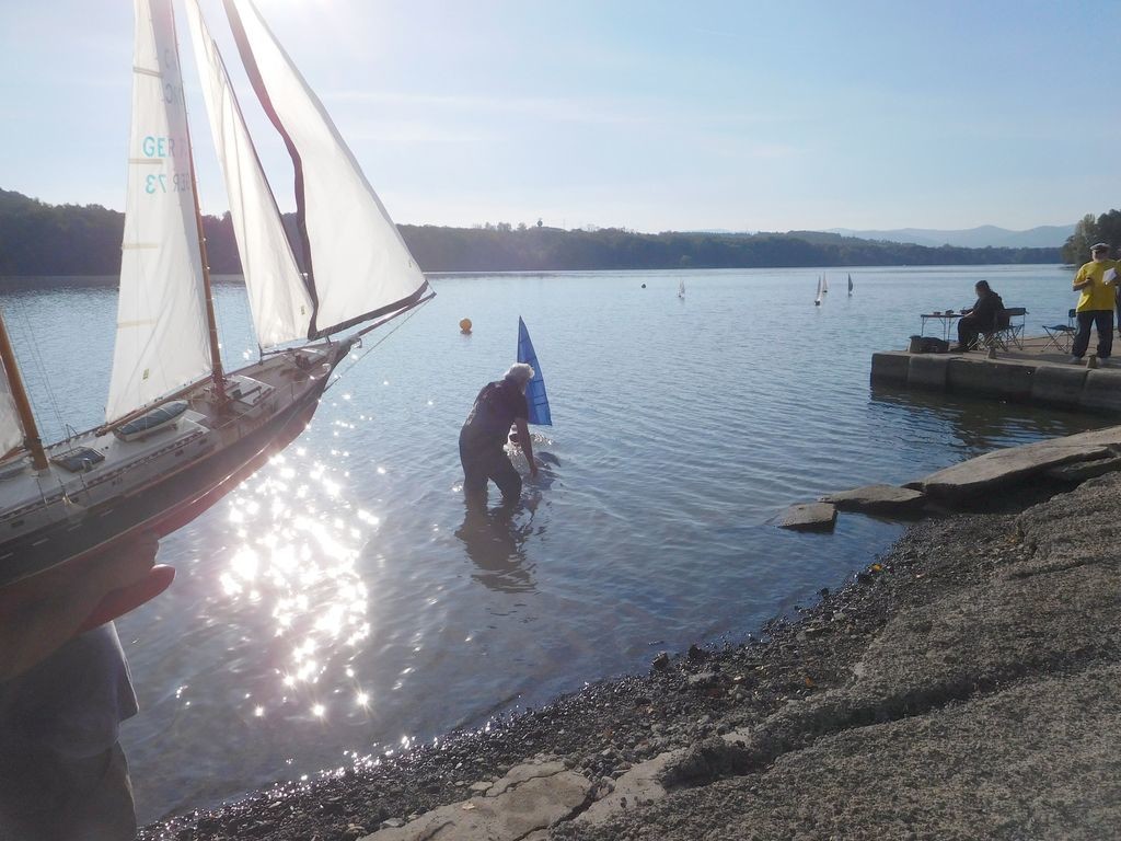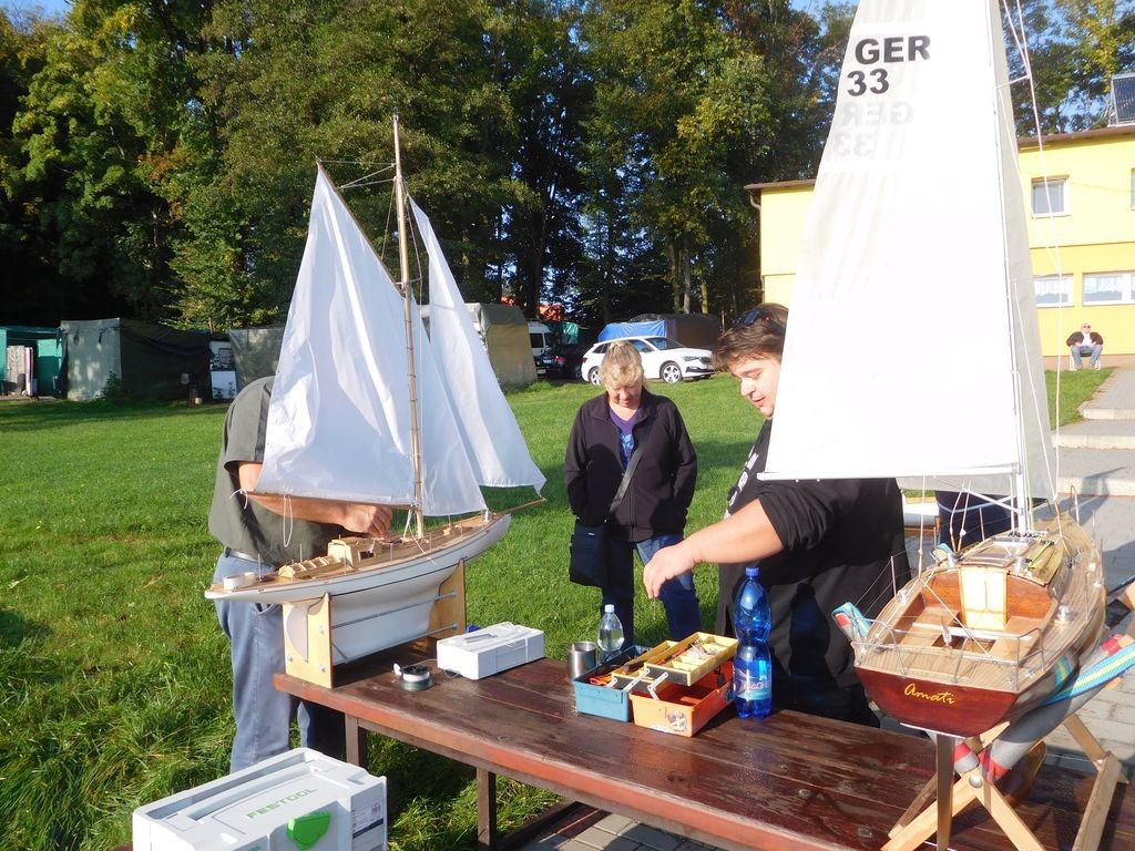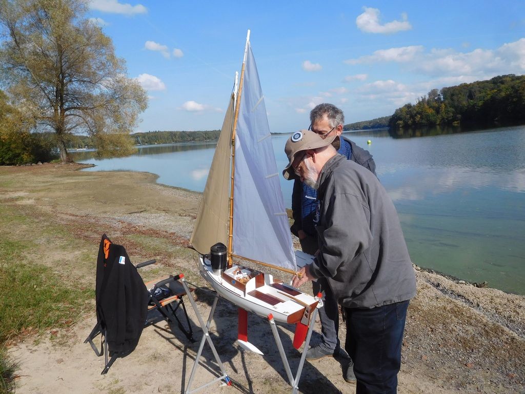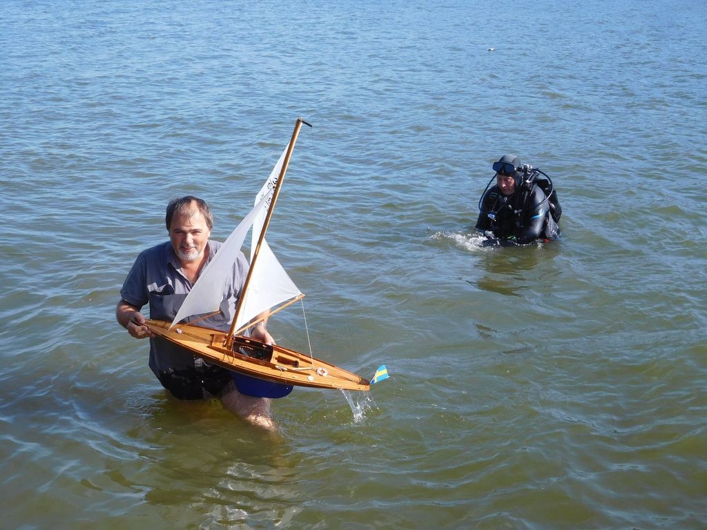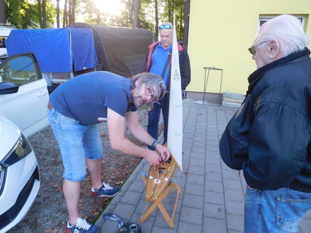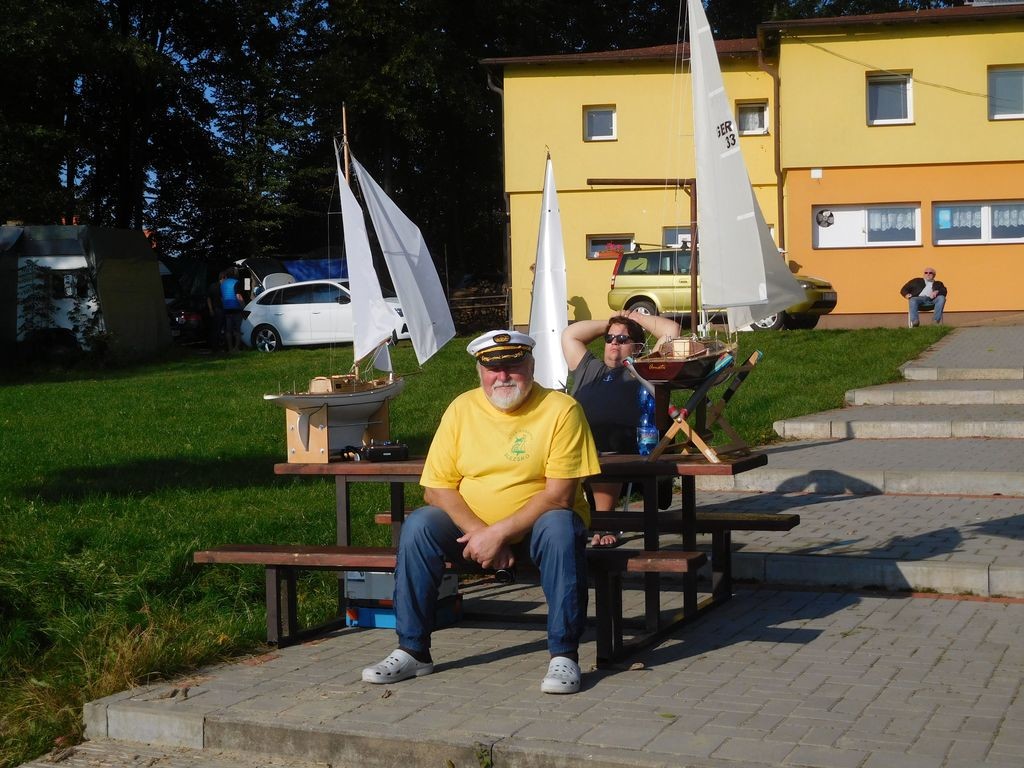 Ráno zavládlo krásné, leč bezvětrné počasí. Začali se sjíždět ostatní účastníci. Na stojáncích u vody se objevily nové lodě: Plachetnice Michala Daranowského Le Gorfou: Bílý laminátový trup doplněný kajutou z mahagonu a vypracovanými detaily z kovu. Zajímavě bylo vyřešeno rozdělené maketové a funkční kormidlo. Jestli bude jako poslední vylovena potápěči, tak bude muset absolvovat větší opravu. Myslím, že se zapomíná na stavební pravidlo: Minimální povolená tloušťka přídavného kýlu či protažené části laterálu je 0,05 maximální šířky lodního trupu. Takových plachetnic se provozuje více.