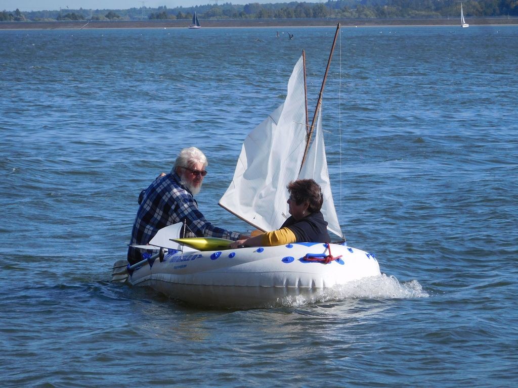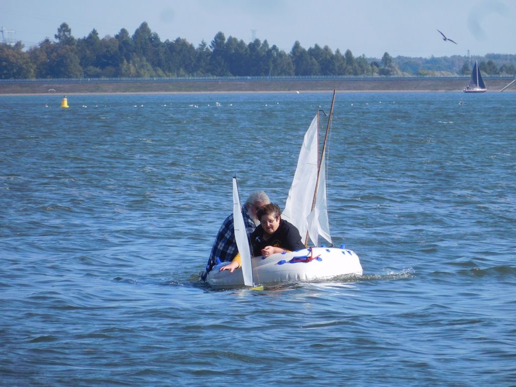 V neděli nás čekala regata. Start byl posunut na devátou hodinu, protože v deset měli přijet potápěči. Startovalo se jednotlivě od konce pořadí ze soboty. Rozhodnutí startovat v devět bylo správné, už jen proto, že od rána funělo a vítr zesiloval. To se projevilo hlavně po prodloužení o další půlhodinu. Vypětí z dlouhé a náročné jízdy se podepsalo i na mně. Přehlédl jsem loď s absolutní předností v jízdě. Než jsem si uvědomil, že mi opravdu neuhne, tak se čelen Jolie Brise zabořil z boku do kajuty. Bylo po naději vyhrát regatu a navíc jsem zle poškodil Renému loď. Inu, je to kontaktní sport, jak říká kamarád Michal. O dramatické chvíle se postaral i Rosťa, když se marně snažil narovnat svého Schamrocka položeného větrem na vodu a unášeného na otevřenou plochu. Naštěstí záchranná loď jej dohnala včas. Cestou zpět sebrala ještě zatoulané ergéčko.