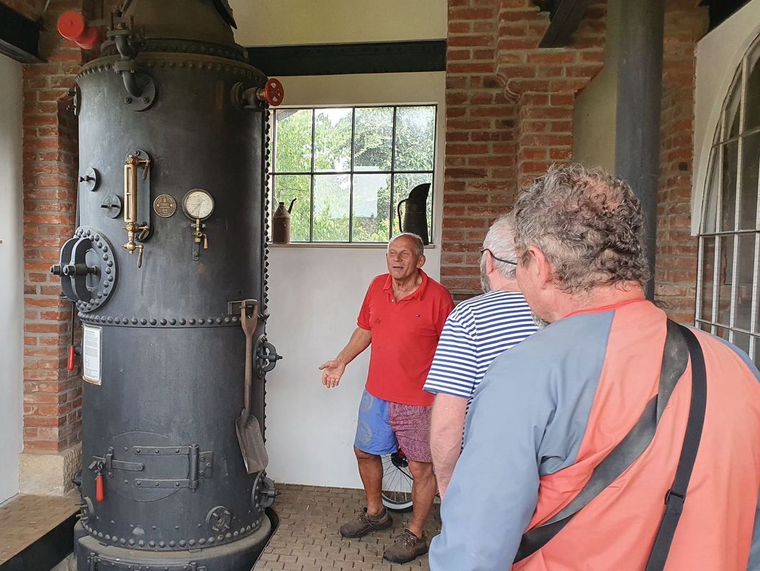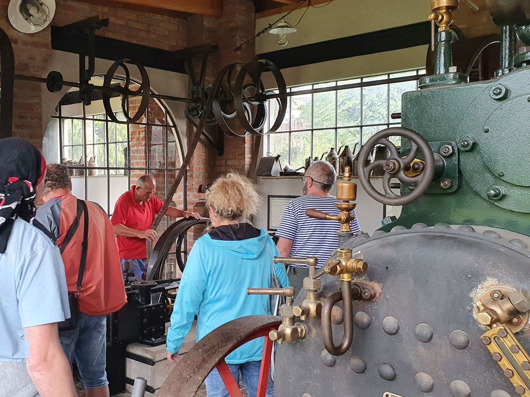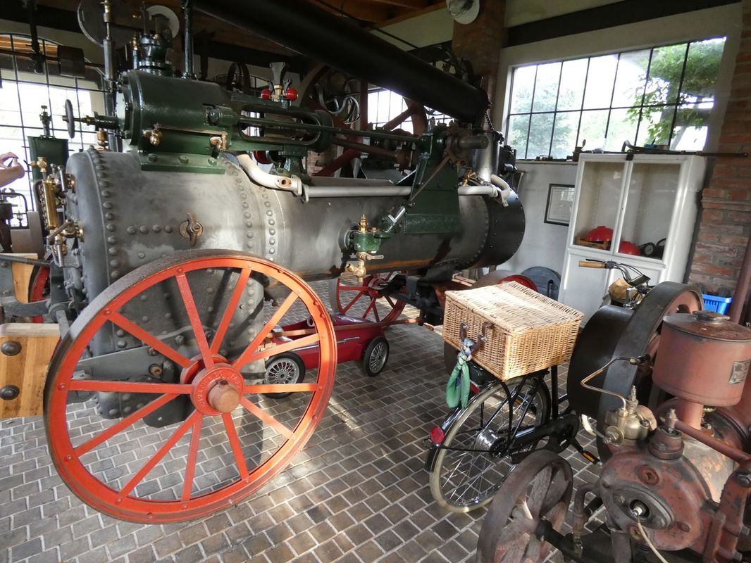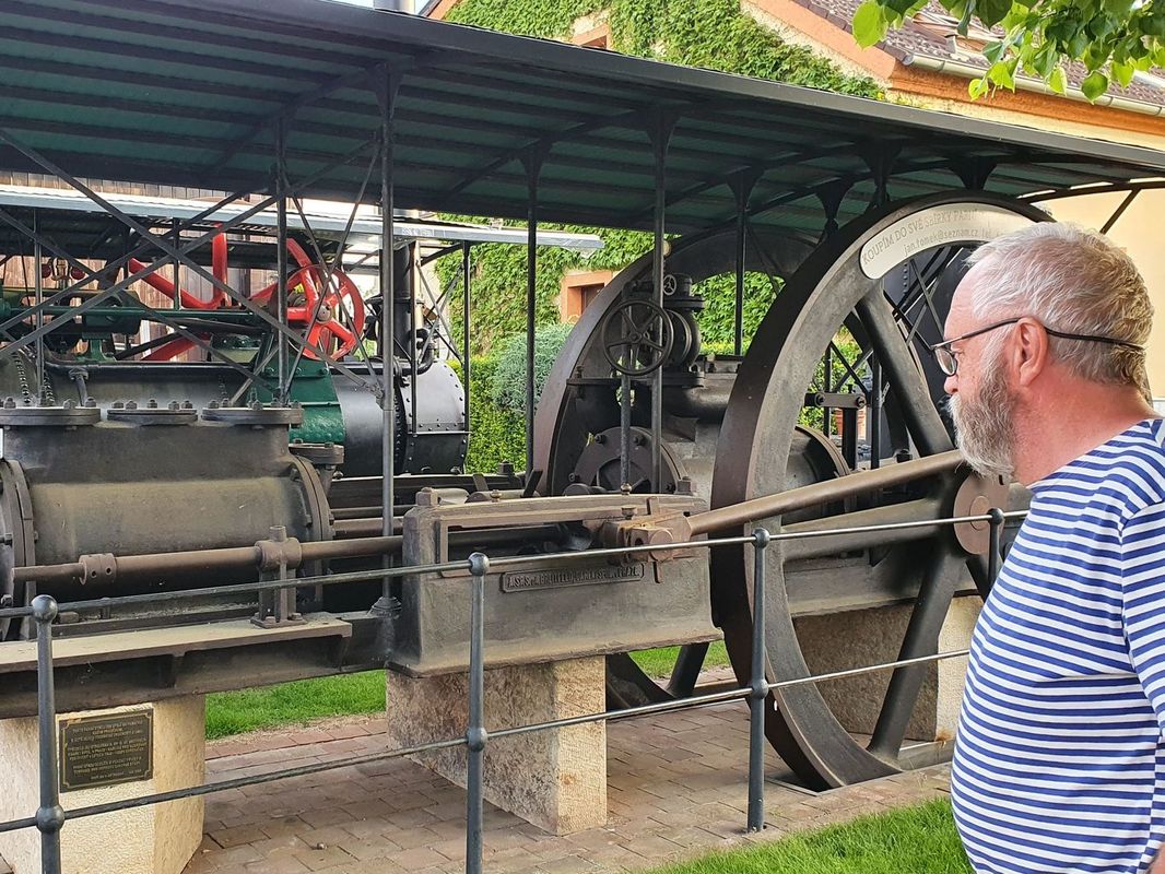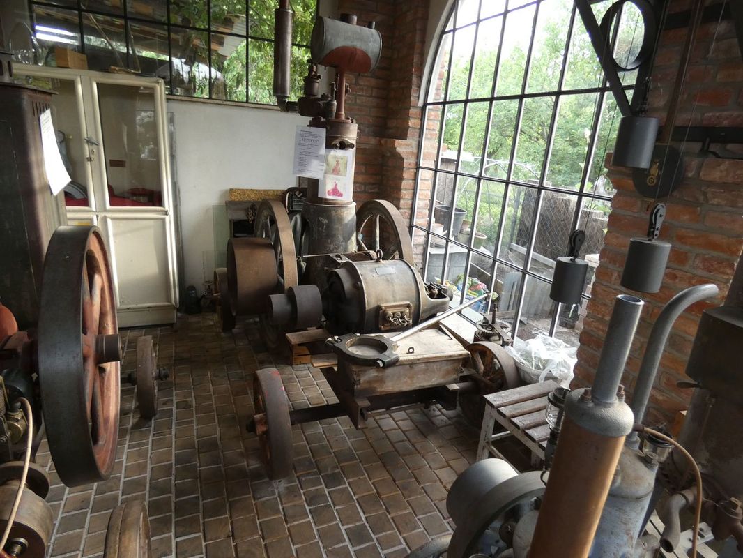 Sobotní pozdní odpoledne bylo zpestřeno zajímavou vycházkou. Celé to zorganizoval Michal, který domluvil návštěvu u sběratele parních strojů pana Tomka. Zajel tam na své nové koloběžce a domluvil nám podvečerní návštěvu. Vyrazili jsme pěšky a zanedlouho jsme stáli u velkého stacionárního parního stroje z cukrovaru, umístěného v ulici před rodinným domkem. V předzahrádce zase stála lokomobila a tak bylo možno tušit, že tu bydlí někdo, kdo své koníčky bere vážně. Přivítal nás pan Tomek osobně a hned začal zasvěceně povídat o tom, co a jak je potřeba ještě na obou parních strojích udělat a co je již uděláno. Vzápětí jsme prošli za dům, do pěstěné zahrady, kde stála, no jak to nazvat, výstavní síň, citlivě postavená tak, aby vzhledem korespondovala s věkem páry. To proto, že vevnitř byla exponáty z tohoto období doslova přeplněna. Musí se to vidět! Pod stropem transmisní hřídel s propojením na tehdy běžné stroje, v rohu motor z Blériota, věžní hodiny a na podlaze jeden parní stroj vedle druhého. Mohli jsme se ptát a dostali jsme vždy fundovanou odpověď a ještě příběh jak se který exponát dostal na své místo.