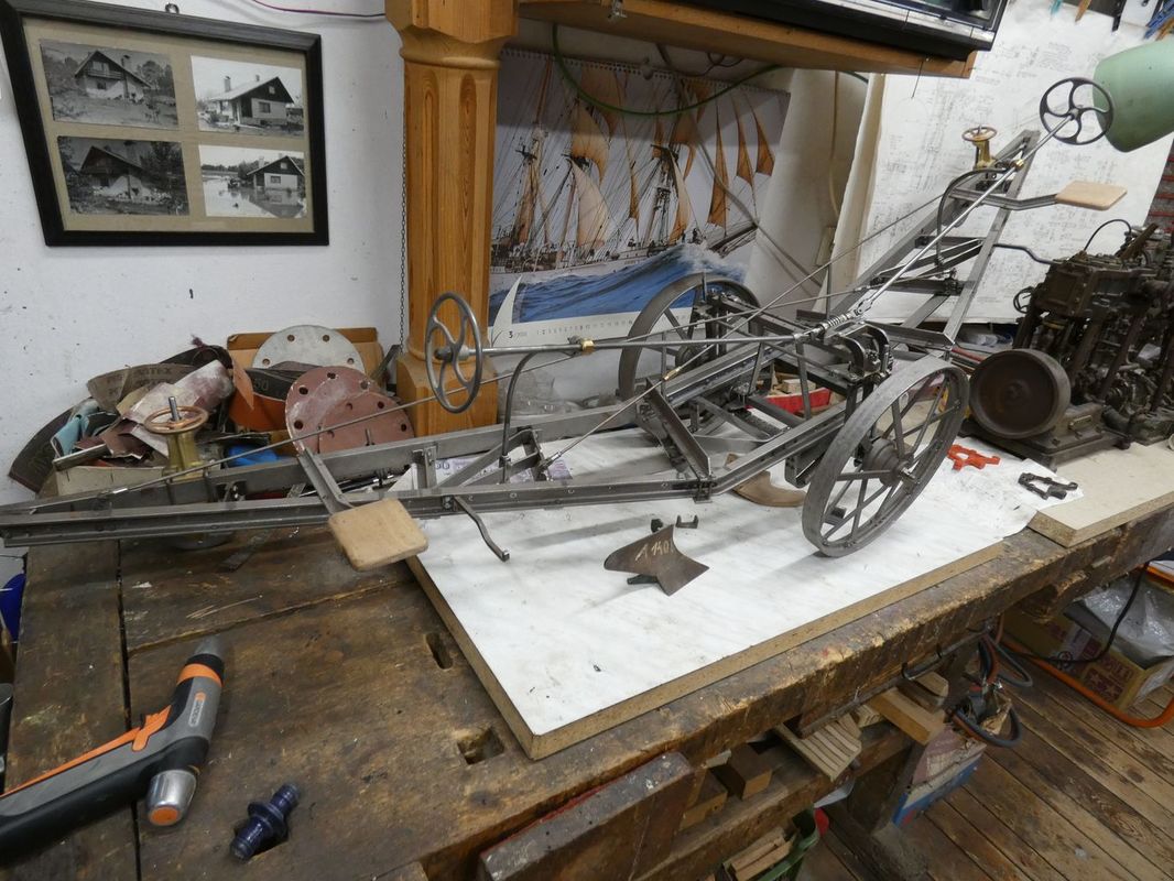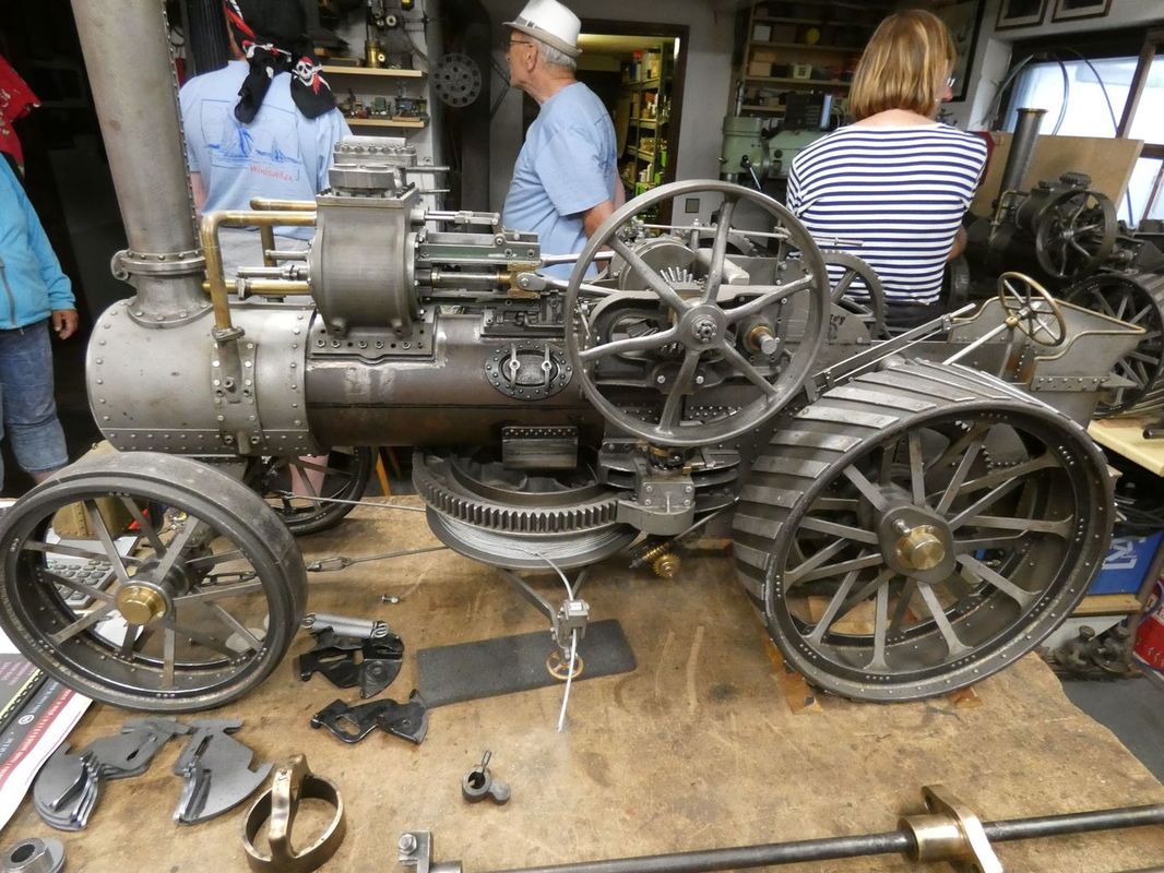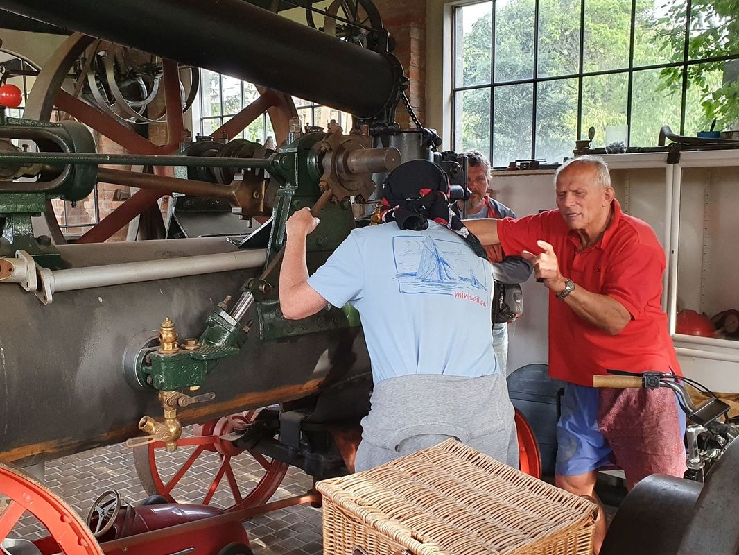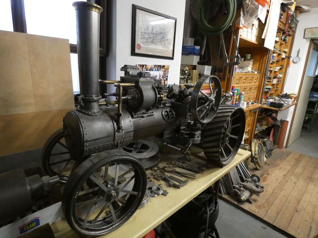 Prohlídka pokračovala v přízemí, či sklepních prostorách rodinného domu, které se postupem času změnily na strojní dílny a výstavní prostory. Nejvíc času jsme strávili v dílně, kde na stole stály funkční modely parních „voraček“. Dvě taková monstra, každé na jednom konci pole, si na laně přetahovaly orací stroj. Po každém přetažení o kus popojely a zorané brázdy rychle přibývaly. Modely vznikají podle dostupných podkladů a budou plně funkční. Proto se také staví dva.