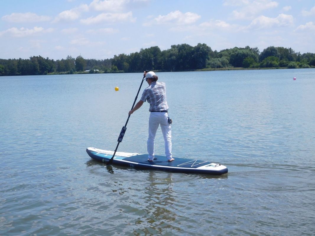 Nesmím zapomenout také na soutěže NSS-D, které probíhaly na vedlejší trati s účastí čtyř modelů. Jindra přivezl svůj trimaran a také dvě děti, které rostou jako z vody. Co mne zaujalo, byl jeho přístup k již zmíněnému paddleboardu. Na rozdíl od ostatních jezdil plně oblečen, bravurně a ještě si na prkno vzal své děti (taky v šatech). Inu kdo umí ten může.