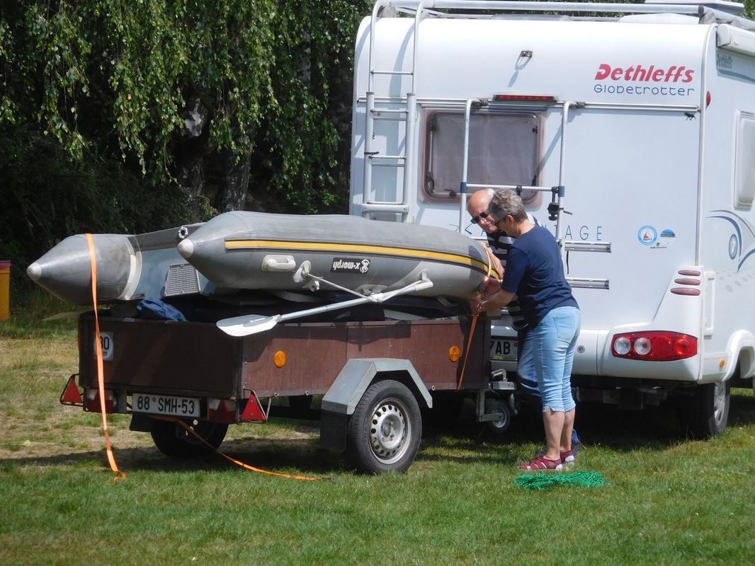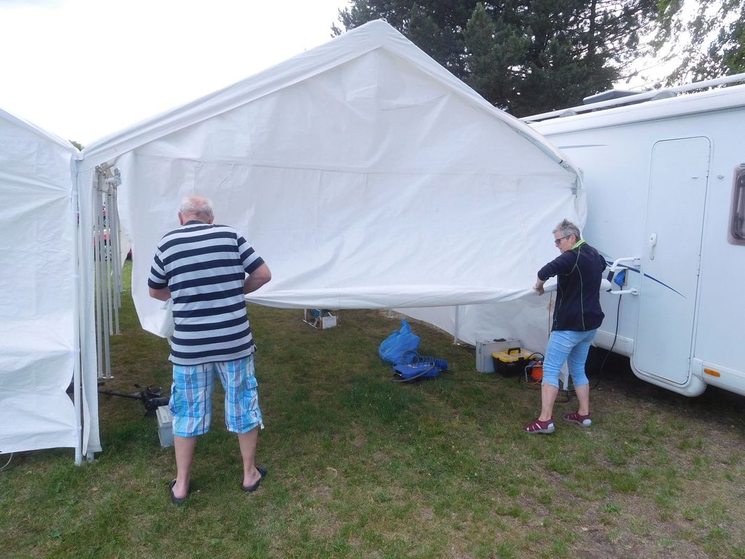 Přijel jsem v pátek ráno, tedy s tím, jak vypadal čtvrtek, moc nemohu posloužit. Milan přivezl zcela nový stan, který byl zafinancován z prostředků, které se vybraly v minulých letech. Tento stan měl tedy svou premiéru a svou roli měl i návod. Tradičně byl propojen se stanem druhým, který nám slouží jako loděnice. Stanů bylo více, někteří z nás v nich i bydlí ;o). Ostatní využívají ubytování v chatkách či na ubytovně (tam v pokojíčcích, ze kterých přechází zrak). Kromě stanů se stavěly také lodě, vítali se nově příchozí a podnikaly se zkušební jízdy.