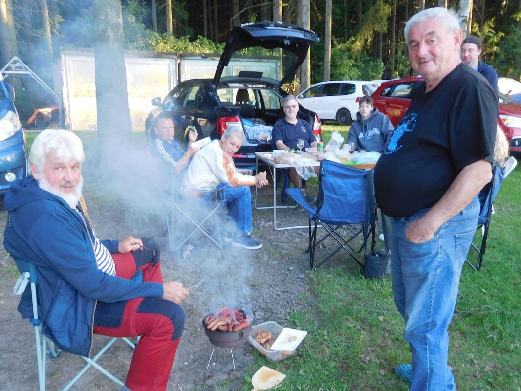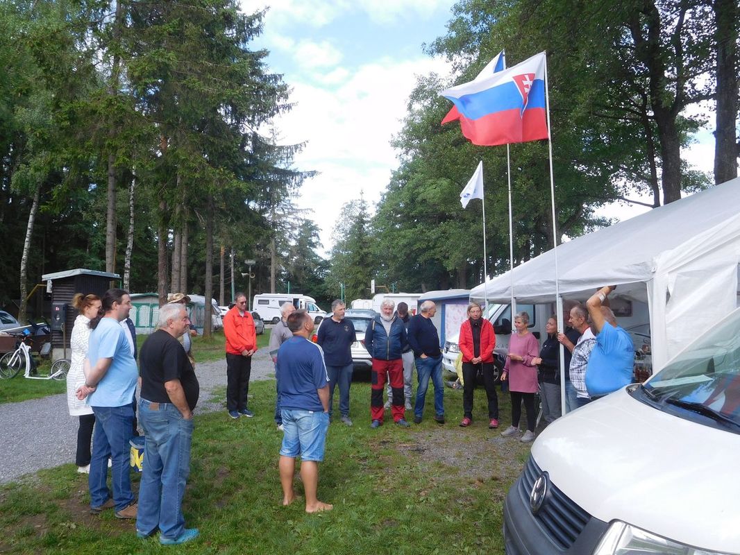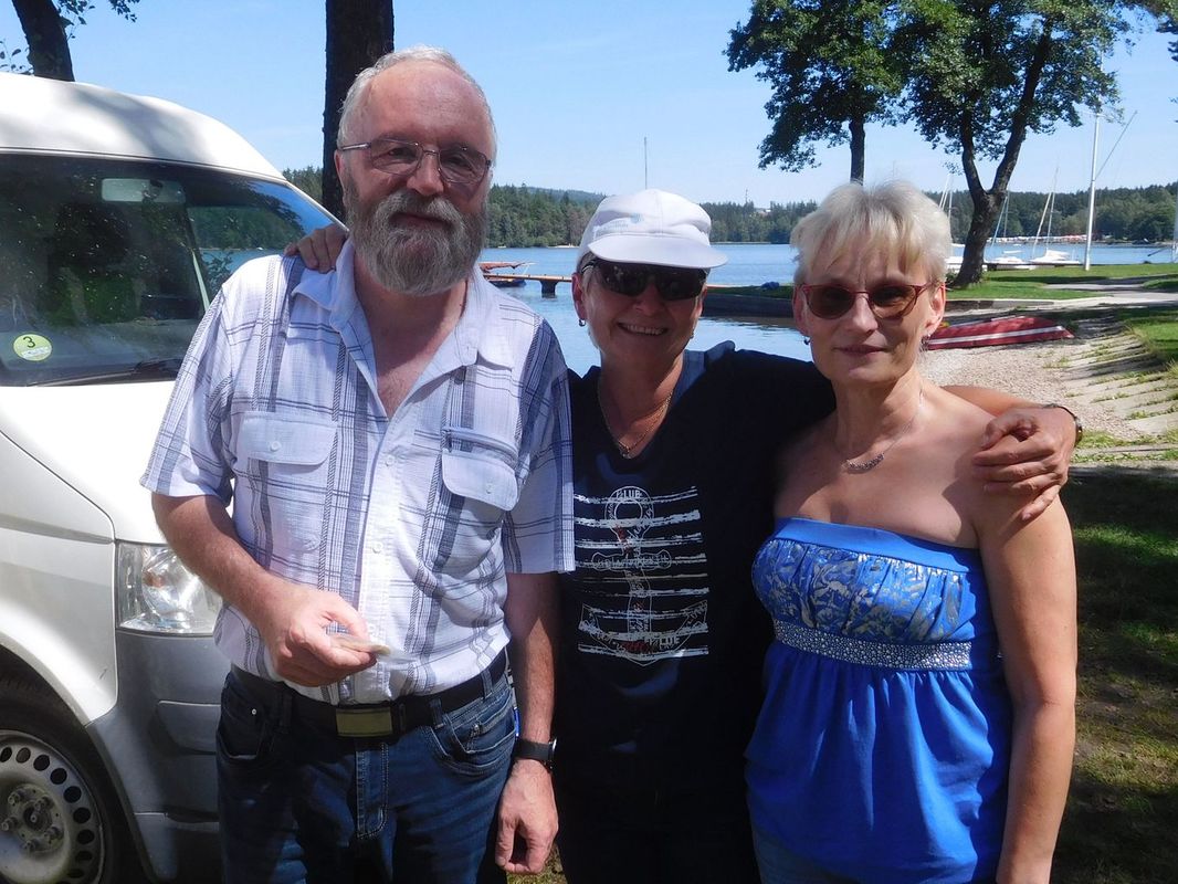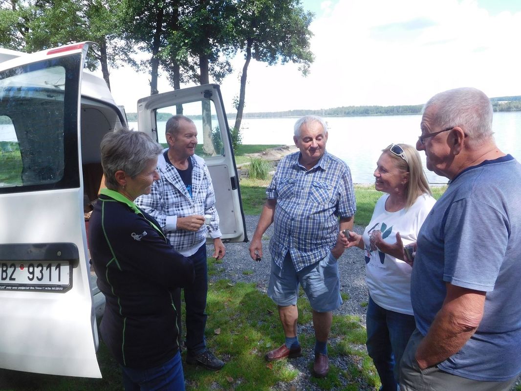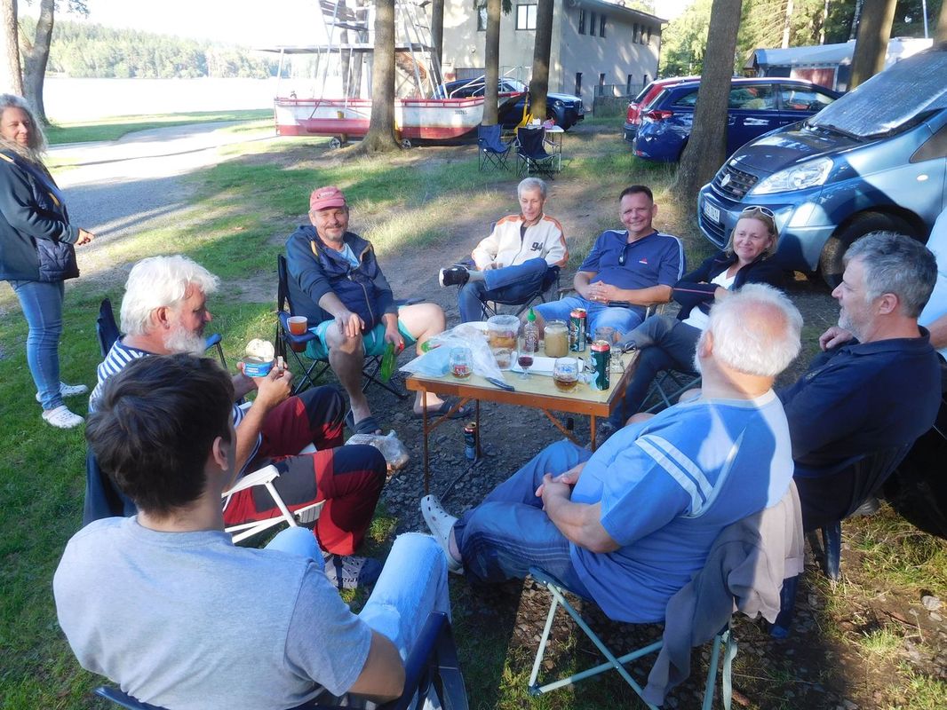 V pauze mezi první a druhou jízdou jsme se všichni rozešli na oběd – někdo na hráz, někdo do kempu, někdo na Baštu. Když jsme se s Láďou a Irenkou vraceli, zatroubilo nám za zády auto, až jsem nadskočila. A z toho auta na nás mávali Jakubíci. To nikdo z nás nečekal, protože i když jsme s nimi někteří mluvili, nevypadalo to, že by se chystali na výlet na Dářko. Bylo to bezva, všichni jsme je rádi viděli. Navíc Miloš se hned chopil role „hlásné trouby“ a za Irenku druhou jízdu startoval. Miloš to nezapomněl a Irča aspoň šetřila hlas 😊.