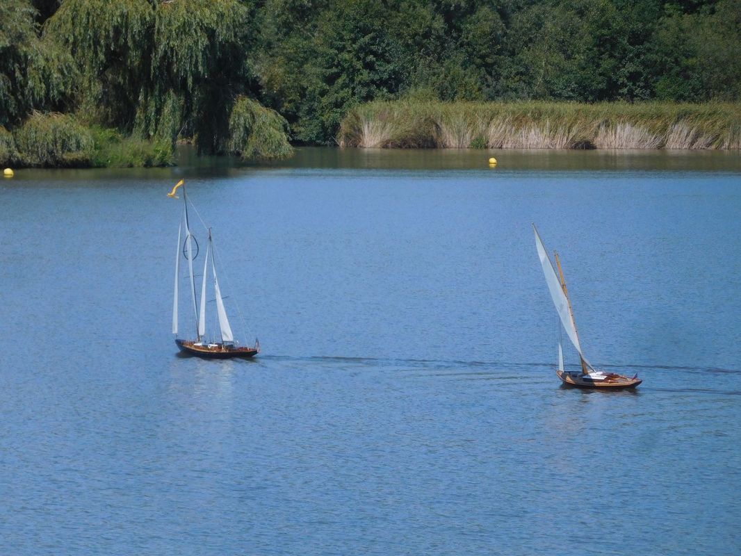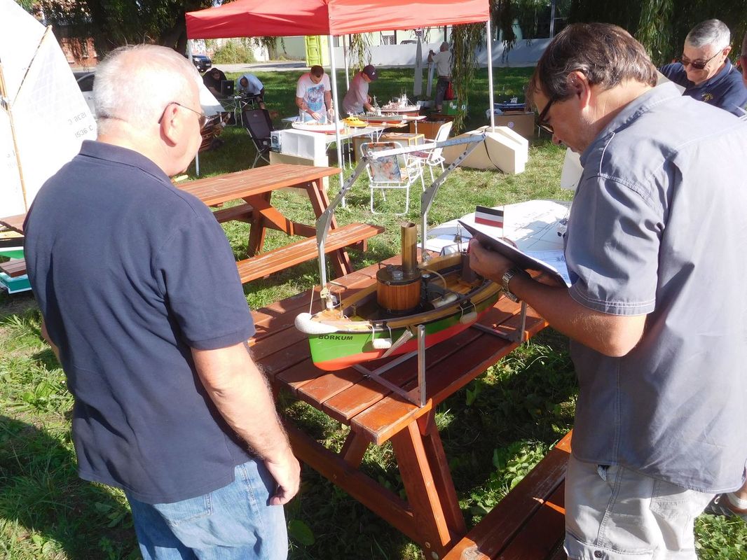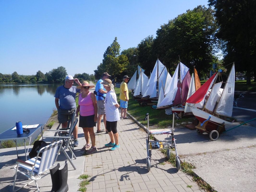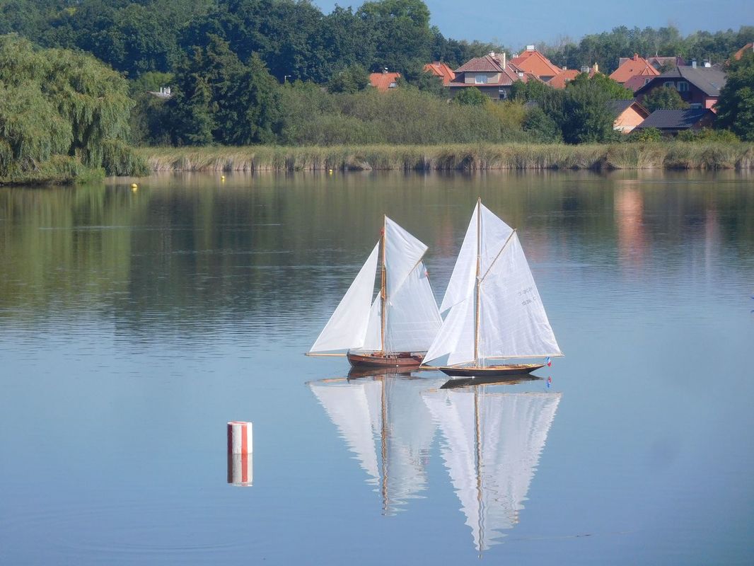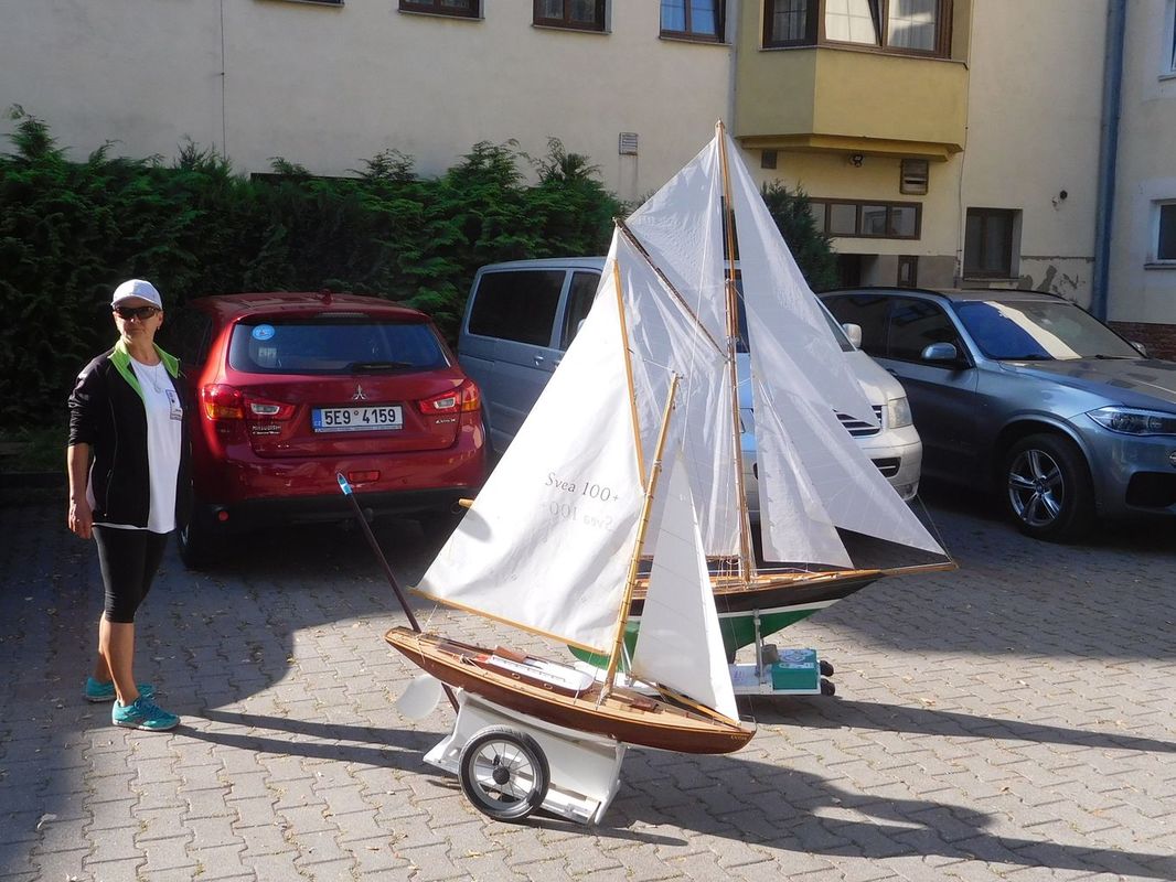 Tím, že se naplánovaly všechny rozjížďky po sobě, jen s menší pauzou mezi druhou a třetí, kdy jsme si s Tomášem odskočili na soutěžní jízdy F4-A, nebyl čas na opravy. To se nakonec vymstilo mě. V první rozjížďce jsem po prvním kole zjistil, že mě zejména dále od břehu plachetnice moc neposlouchá. Zkusil jsem po prvním kole vyměnit baterku, jestli se to nezlepší. Změna nenastala, takže to vypadalo na špatný přenos signálu, přijímač jsem měnil kvůli zlomené anténě vloni v Buňkově, proto jsem měl víc podezření na vysílač. Plachetnici jsem tedy vyndal a doběhl si pro Tomášovu vysílačku od motorových modelů, spároval a vypadalo to, že nastalo drobné zlepšení, ale při pohybu s přijímačem stejně ještě někdy serva zakmitla. Při zkoušení nakonec upadla trubička na konci antény, to vedlo, alespoň momentálně ke zlepšení (asi se nezkratovávalo vnitřní jádro antény s obalem tolik jako s těžkým koncem antény). Na břehu to i na větší vzdálenost, než k vrcholové bójce fungovalo. Jelikož mám kvůli dřívějším problémům s konektory na přijímači pro napájení přijímače a serv připájené přívody od baterie přímo na desku přijímače, nešel rychle přehodit přijímač. Více tedy zkusit nešlo, protože startovala další rozjížďka. Na vodě to však hned při prvním objetí vrcholové bójky opět neposlouchalo, a navíc se plachetnice se středně přitaženými plachtami a kormidlem vydala rovně na druhou stranu rybníka. Nezbývalo tedy než sednout do člunu a jet pro ni. Cestou jsem zkoušel chytit signál a otočit ji, ale marně, zastavila se až v rákosí. Při návratu jsem doufal, že mi nedojde baterie ve člunu. Druhá rozjížďka pomalu skončila, takže jsem si šel i s Tomášem odjet alespoň dvě jízdy s F4-A a teprve poté začal lepší opravy své plachetnice. K tomu Tomášovi přestalo u F4-A před dokem poslouchat servo kormidla (asi někdy dříve utopené). A protože Tomáš závodil s Vráťou o první místo v celkovém pořadí NSS-A, byla to pro mě další práce před třetí rozjížďkou NSS. Jelikož jsem měl dvě nulové jízdy v NSS, už by mi ani dobrý výsledek v třetí jízdě nepomohl. Vyměnil jsem tedy Tomášovi servo, u sebe v plachetnici vyměnil a přepájel přijímač a vyrazil na vodu. Nechtělo se mi nést plachetnici tak daleko po břehu, takže jsem v rámci testu nechal plachetnici plout na start po vodě. Jelikož rozjížďka již dávno začala, odstartoval jsem v 35 minutě, kdy už postupně všichni končili. Oproti prvním rozjížďkám celkem slušně 2-3 m/s stále foukalo, takže jsem nakonec vyhlášených šest kol dojel se ztrátou asi půl kola za Jardou Zemanem v asi 66 minutě. Při porovnání po odečtení pozdního startu to ukazovalo na konkurenční výsledek, takže oprava se podařila a plachetnice by měla být rovnocenná s ostatními. Po jízdách jsme se domluvili opět na pozdním startu tří sobotních rozjížděk, první od 13:00. Do té doby jsme se chtěli snažit já, Tomáš a Ladous odjet jízdy v ostatních kategoriích, aby nám odpoledne zbyla opět jen F4-A.