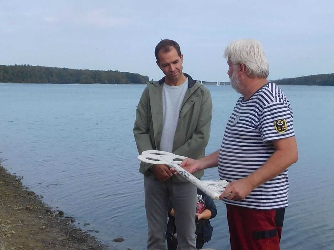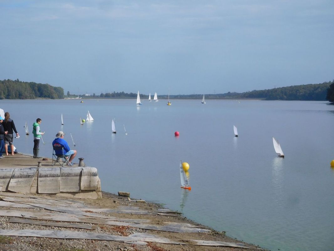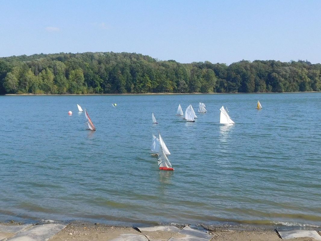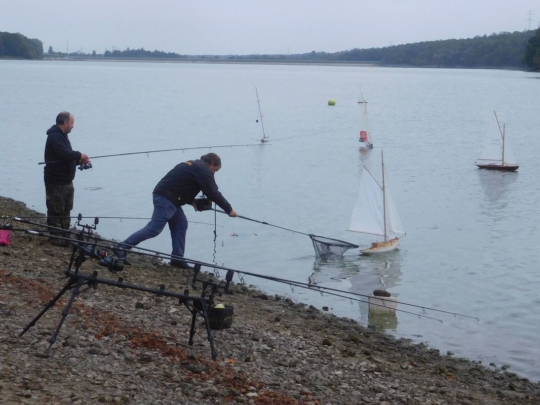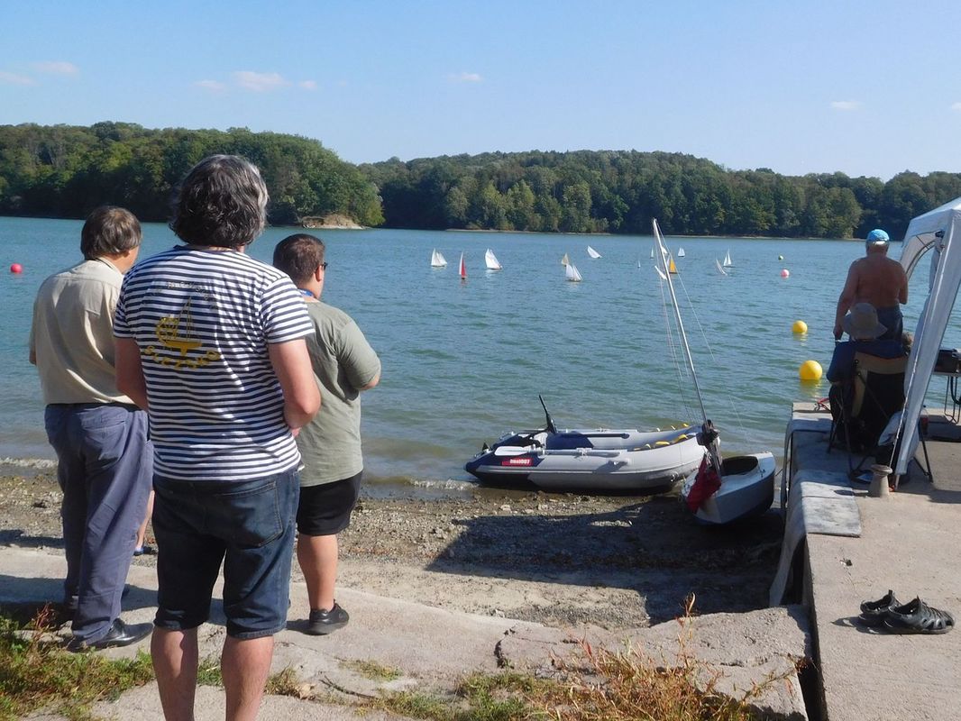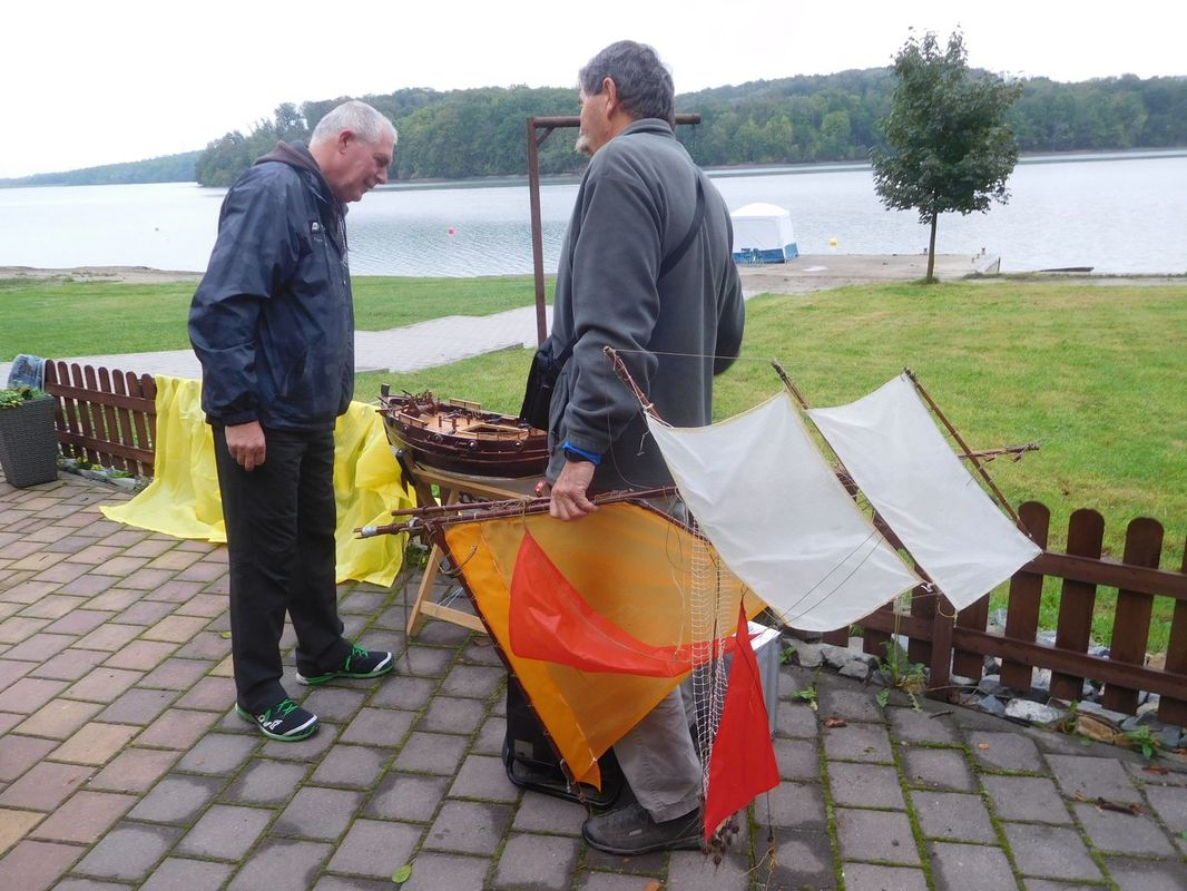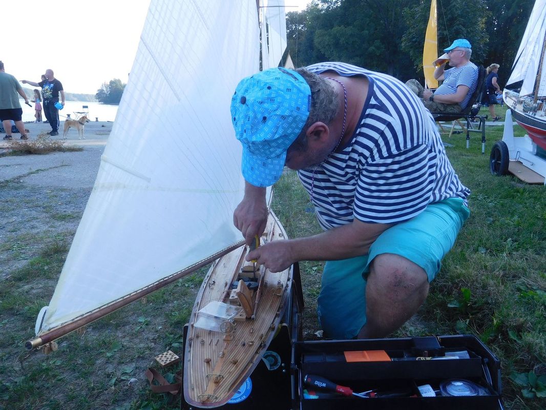Vody bylo letos poměrně málo, takže nešel využívat ani příbřežní koridor podél betonu, bylo tam sucho. Jediné místo, které šlo absolvovat bez velkého přemýšlení a hledání větru, byly dlouhé úseky na a od zadní bójky. Opět jsem trochu podcenil přípravu a během první jízdy jsem zjistil, že při jízdě na pravoboku nemohu pořádně přitáhnout geny, takže křižování proti větru podél břehu bylo trochu nepravidelné až po někdy neproveditelný obrat. To skončilo uváznutím na mělčině. Vzhledem k přivezení si z Jablonce drobného nachlazení a bolesti v krku jsem nebyl připraven chodit do vody, takže musela zaskočit Martina a plachetnici mi párkrát zachránit, nebo došlo na zapůjčení podběráku rybářů, kteří zde s námi bez problému souznějí a po dobu závodu mají nahozeny pruty na těžko. Kromě občasného zajetí ke břehu přímo mezi pruty nedochází ke kolizím mezi plachetnicemi a vlasci. Na druhou jízdu jsem udělal jen lehkou korekci – zkrácení jedné otěže na palubě uzlem, jízdní vlastnosti a obratnost se výrazně zlepšily. K večeru postupně přestávalo foukat, takže poslední jízda už byla zpestřena postáváním a pohupováním se na vlnách, čím menší plachetnice tím více. Bylo zajímavé pozorovat, že plachetnice se středně přitaženými plachtami, pěkně vypnutými včetně obou kosatek dokáže při pohupování na vlnách couvat, aniž by plachty ztratily vítr. V podvečer se k české části účastníků začali připojovat polští kolegové, kromě Michala Daranowského, který zde byl už od čtvrtka se Sunfischem provedeným v lesklém mahagonu. Vzhledem k jeho malé velikosti, lehkosti a latinské plachtě to však bylo pro něj spíše trápení než pohodová jízda, a tak si většinou po krátké době na vodě nechal plachetnici zachránit svážecím člunem.