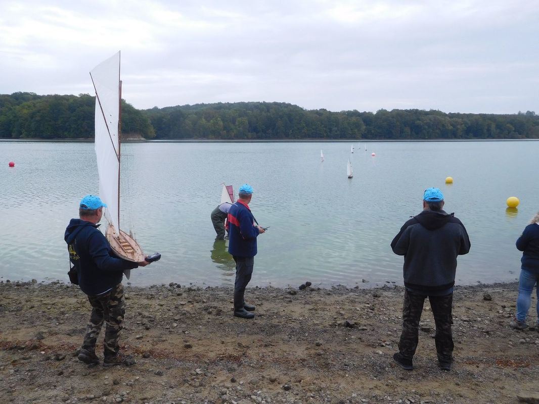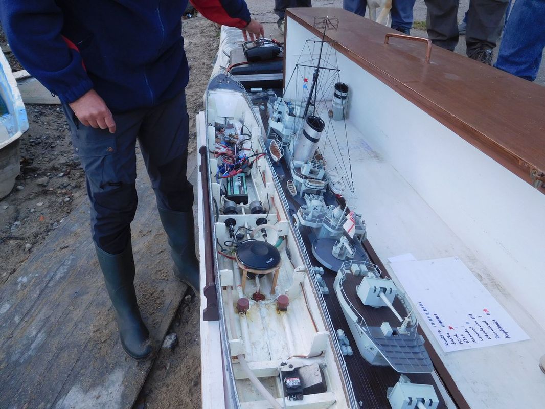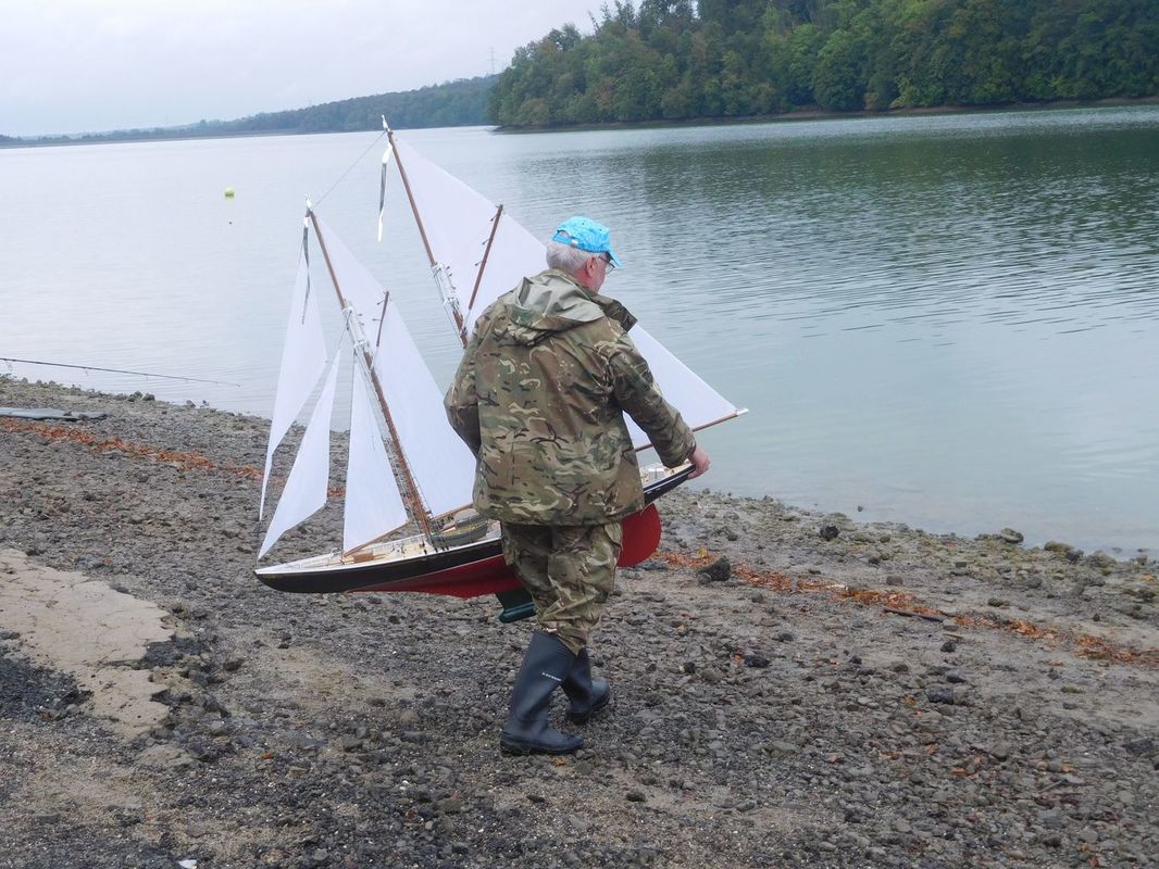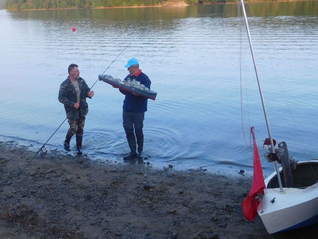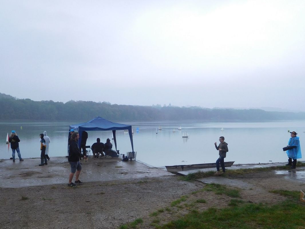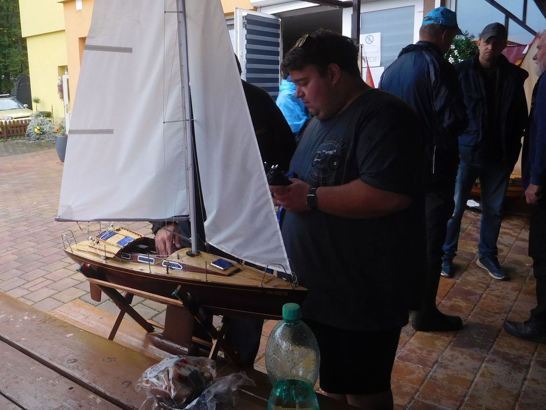 Už v noci přišel déšť, oficiální sobotní závodní část se už nesla v minimálně zatažené obloze a teplotě okolo 14 stupňů. Po zkrácené první jízdě RG 65 byl oficiální nástup a ocenění účastníků pátečních jízd – předání výherních buchet. Po desáté měl pak začít kolotoč jízd NSS a RG 65. NSS za občasného deště a mírného větru začalo. Při dávání na vodu mi přišlo divné, proč mám na palubě u konce čelenu v palubě dírku. Po chvíli mi došlo, že to není jen dírka, ale, že v těch místech stál maketový kotevní vrátek s rohatkovou brzdou a miniaturním typovým štítkem, jo asi klesnul na dno Těrlické přehrady. Zbyl po něm jeden šroubek M1, dva zbývající se přetrhly, hold budu muset maketové upevnění doplnit ještě nějaký pořádným čepem uvnitř vrátku. Jak jsem zjistil z Pepových fotek o vrátek jsem přišel hned v pátek při první rozjížďce.