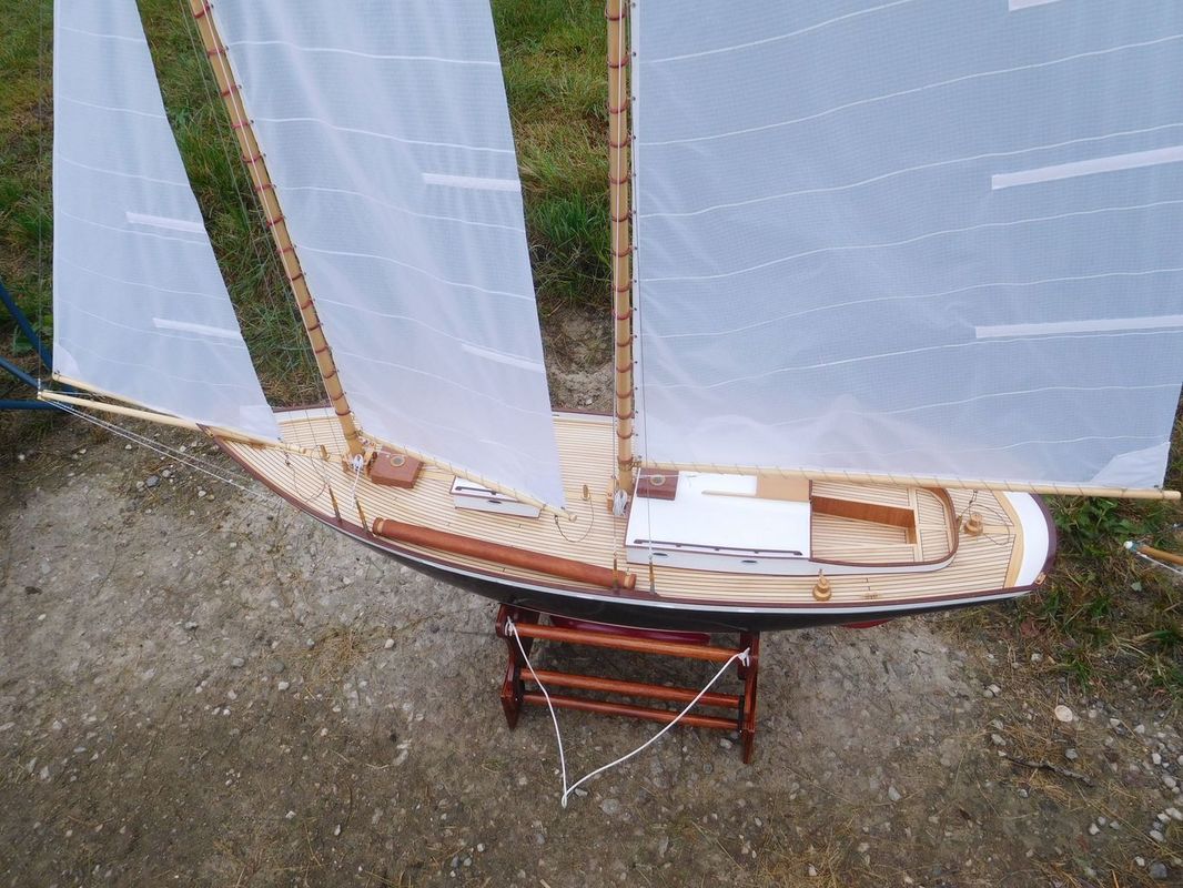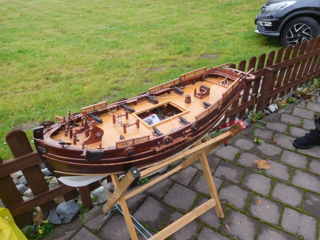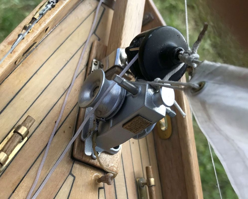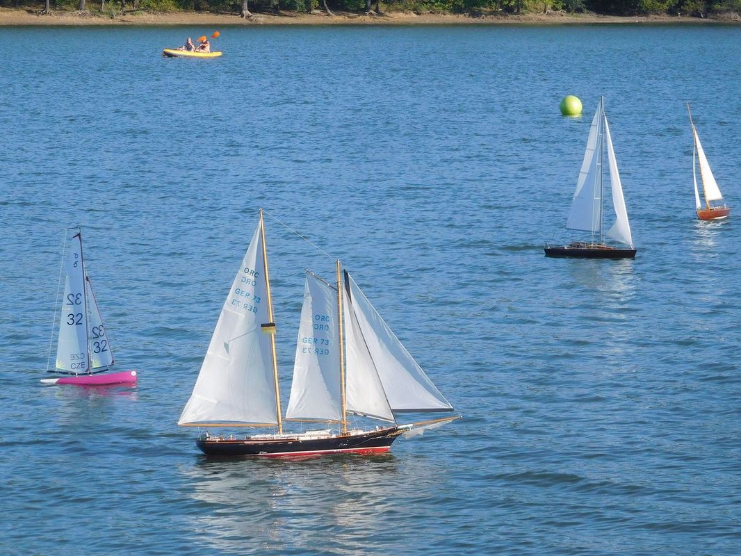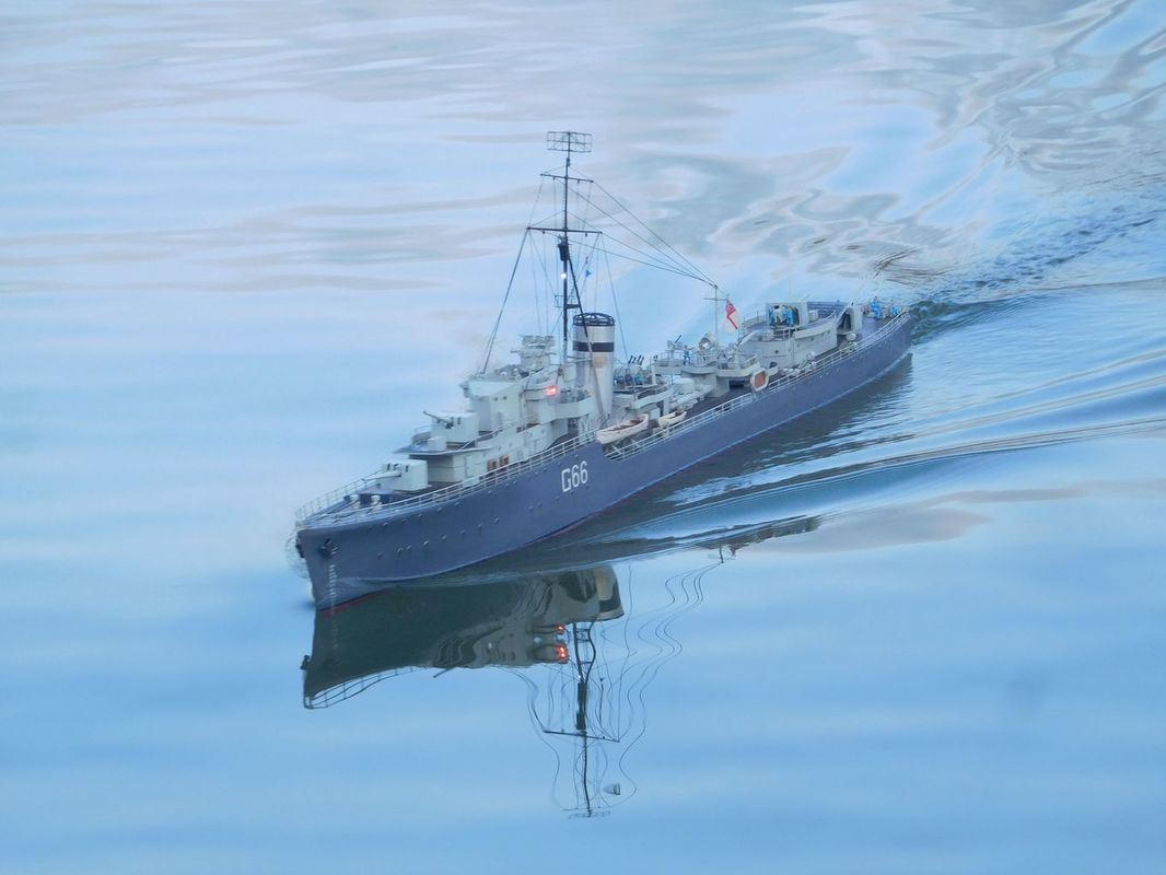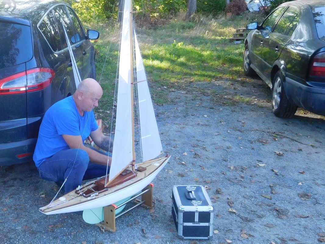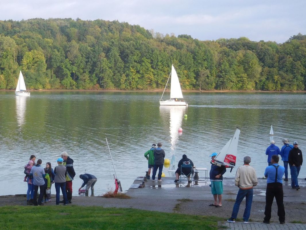 Už v noci přišel déšť, oficiální sobotní závodní část se už nesla v minimálně zatažené obloze a teplotě okolo 14 stupňů. Po zkrácené první jízdě RG 65 byl oficiální nástup a ocenění účastníků pátečních jízd – předání výherních buchet. Po desáté měl pak začít kolotoč jízd NSS a RG 65. NSS za občasného deště a mírného větru začalo. Při dávání na vodu mi přišlo divné, proč mám na palubě u konce čelenu v palubě dírku. Po chvíli mi došlo, že to není jen dírka, ale, že v těch místech stál maketový kotevní vrátek s rohatkovou brzdou a miniaturním typovým štítkem, jo asi klesnul na dno Těrlické přehrady. Zbyl po něm jeden šroubek M1, dva zbývající se přetrhly, hold budu muset maketové upevnění doplnit ještě nějaký pořádným čepem uvnitř vrátku. Jak jsem zjistil z Pepových fotek o vrátek jsem přišel hned v pátek při první rozjížďce.