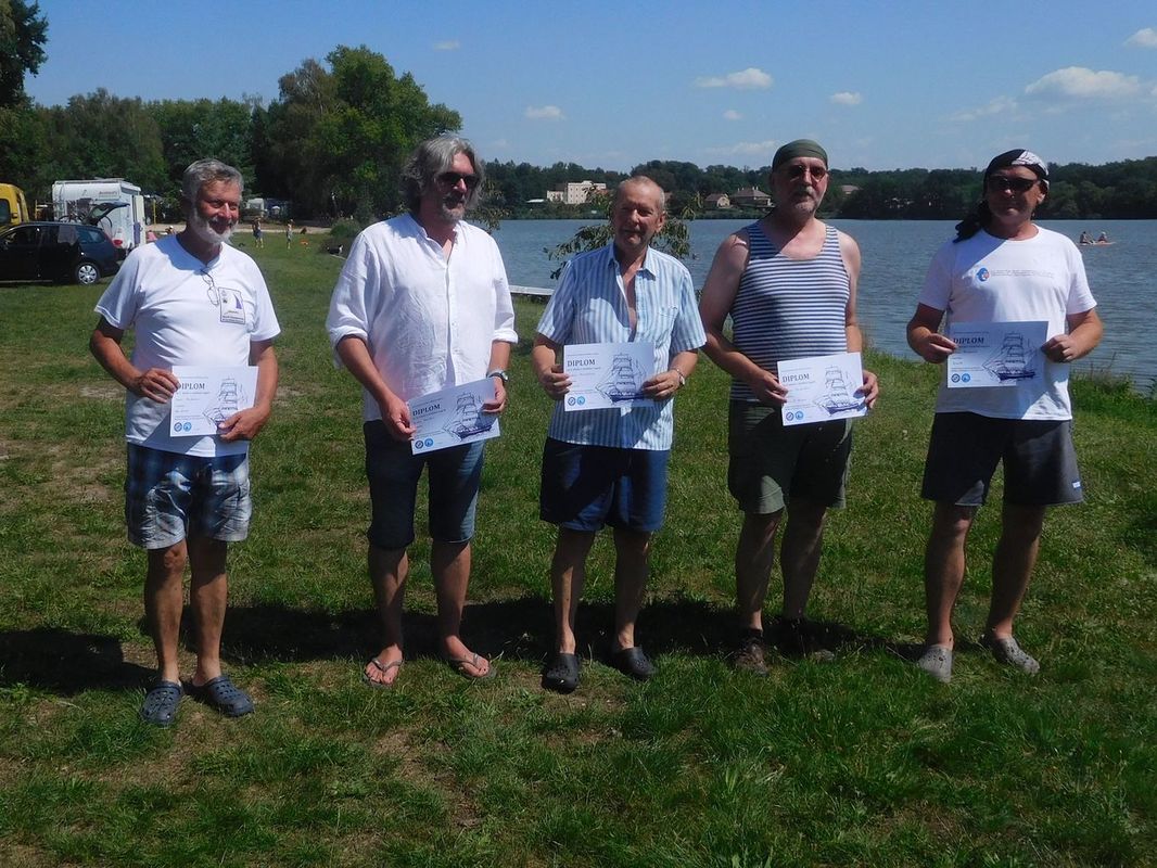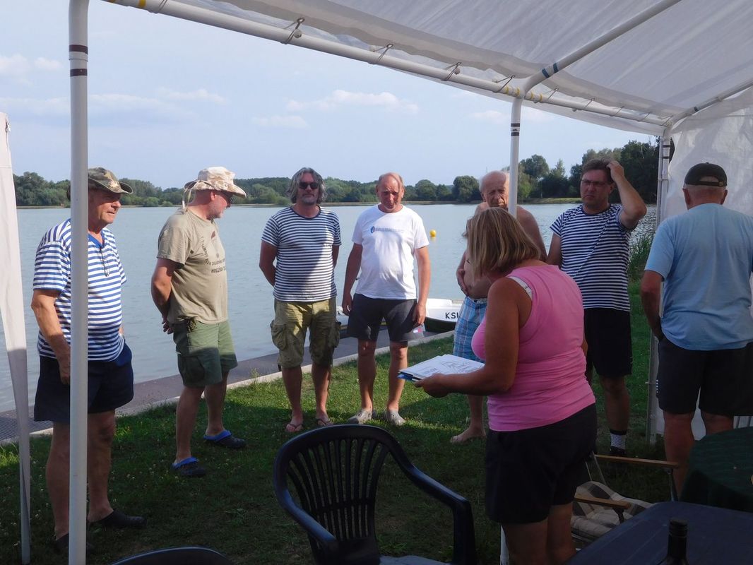 Spokojen byl stejně jako my všichni, kteří jsme přijeli na toto „komorní“ setkání s účastí devíti lodí (z toho 6 odpovídalo časovému omezení kategorie H – Historické lodě do roku 1950). Účast na akci ovlivnilo několik faktorů, probíhající Mistrovství v maďarském Sarkadu, dovolené a také pobyty v lázních, které snížily počet účastnících se žen na pouhou jednu, Irenu. Ta ovšem byla nejdůležitější částí, neb byla ředitelkou celé soutěže. Zde přidám její historku z jejích cyklistických výprav, kterou dala k dobru. Jednou takto putovala s devíti chlapy-cyklisty a stavili se v hospodě na obědě, kam také dojela další skupinka cyklistů. Ta však měla svou sestavu přesně naopak – tedy jeden chlap a devět žen. Při rozhovoru se jí dámy z té druhé skupiny ptaly, jak to vše zvládáš? Irenčina odpověď zněla: “Druhý den jsem si zvykla, že mi říkají ty vole a od té doby je to v pohodě…“. Pravda, u nás se tento titul (moc) nepoužívá, ale myslím (všiml jsem si), že při některých košilatých vtipech chlapské většiny pěkně obracela oči v sloup.