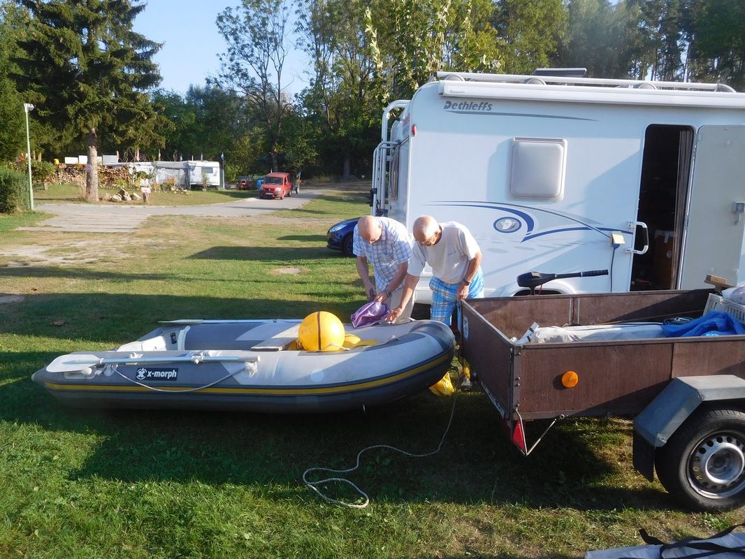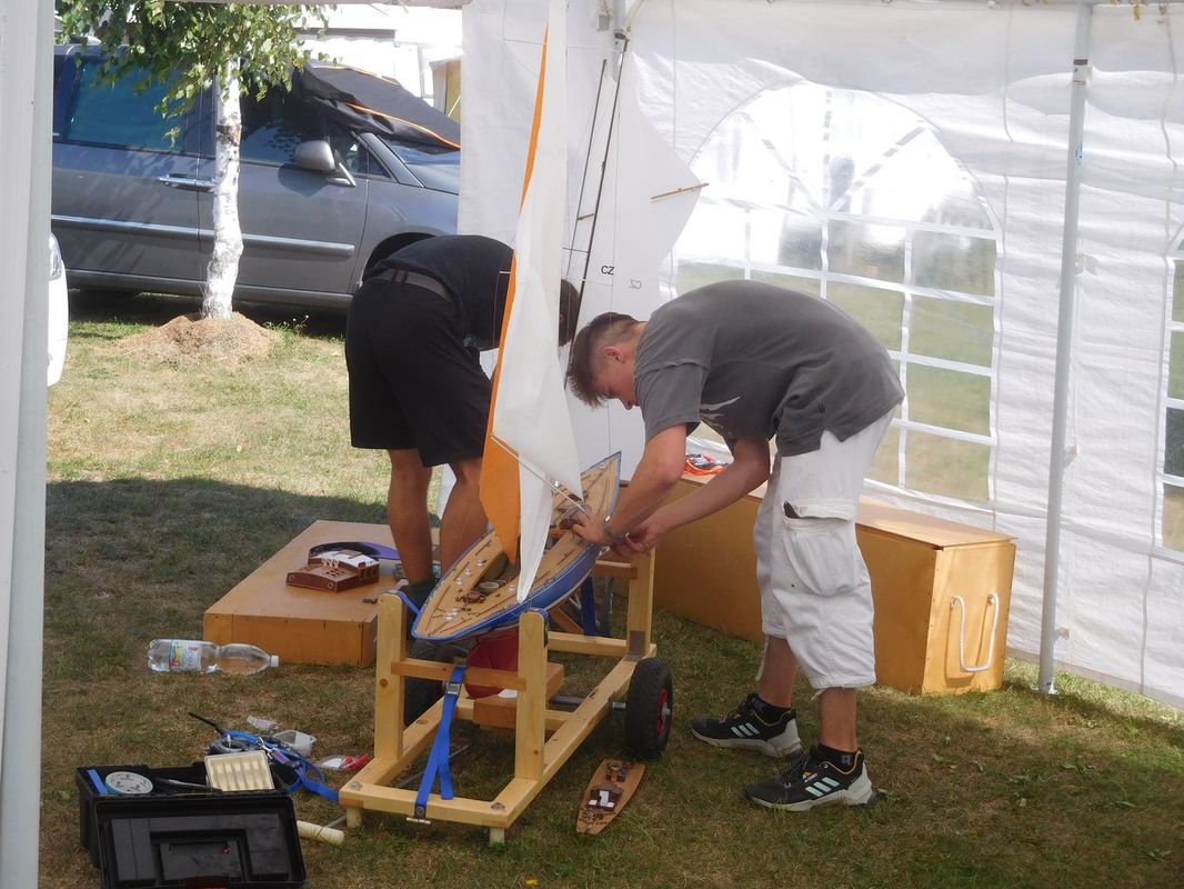 Přijel jsem právě ve chvíli, kdy se z přívěsu, který docestoval díky jednomu z rodičů našich juniorů ve čtvrtek večer, sundal člun a začaly vybalovat velké stany. Tak jsme si jen podali ruce a začali stavět. Naštěstí se pro ně našlo místo nedaleko od vstupu do vody a zakrátko přibyly dvě velké střechy mezi natrvalo zaparkovanými karavany. S třepotající vlajkou minisail to bylo později nazváno „zahradním centrem“ (při pohledu z terasy restaurace). Zároveň se dofoukl člun a bóje, takže byla vytyčena trať. Kvůli omezenému místu na břehu, které je z jedné strany sevřeno zástupem čarodějnic a ze strany druhé postavami snad ze všech večerníčků, byl trojúhelník otočen o 180 stupňů. Pak už jen sestavit modely a páteční jízdy začaly přesně s desátou hodinou.